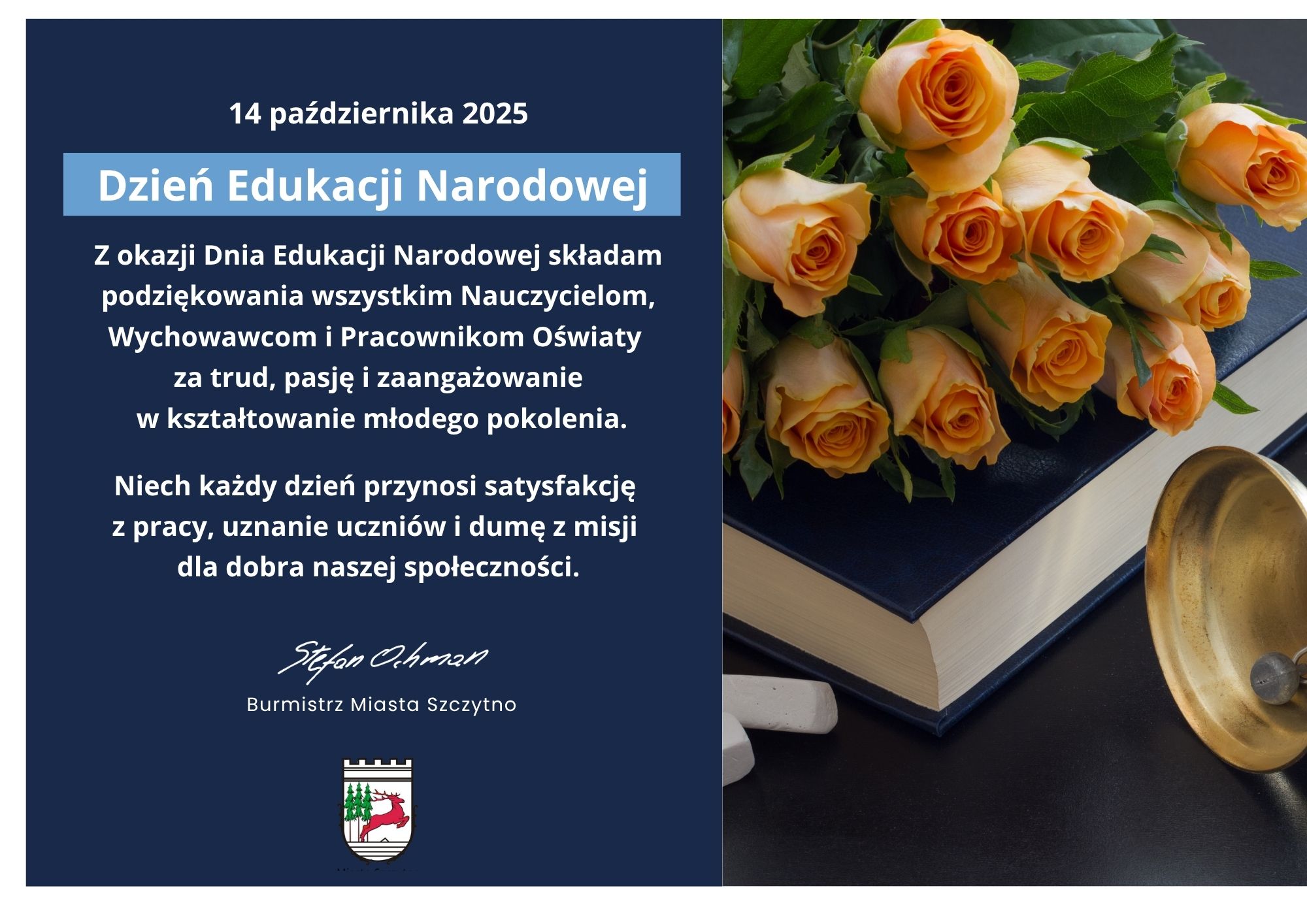 Z okazji Dnia Edukacji Narodowej serdeczne podziękowania wszystkim Nauczycielom, Wychowawcom oraz Pracownikom Oświaty za codzienny trud, pasję i zaangażowanie w kształtowanie młodego pokolenia. Niech każdy dzień pracy przynosi Państwu satysfakcję, uznanie uczniów oraz dumę z pełnienia tej wyjątkowej misji dla dobra naszej społeczności.
