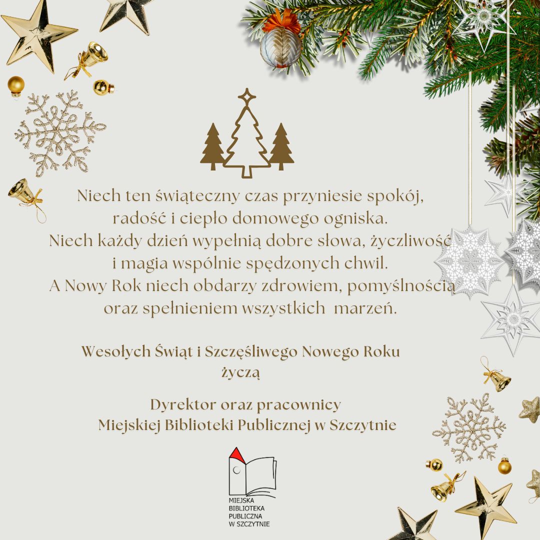 Niech ten świąteczny czas przyniesie spokój, radość i ciepło domowego ogniska. Niech każdy dzień wypełnią dobre słowa, życzliwość i magia wspólnie spędzonych chwil. A Nowy Rok niech obdarzy zdrowiem, pomyślnością oraz spełnieniem wszystkich marzeń🎄