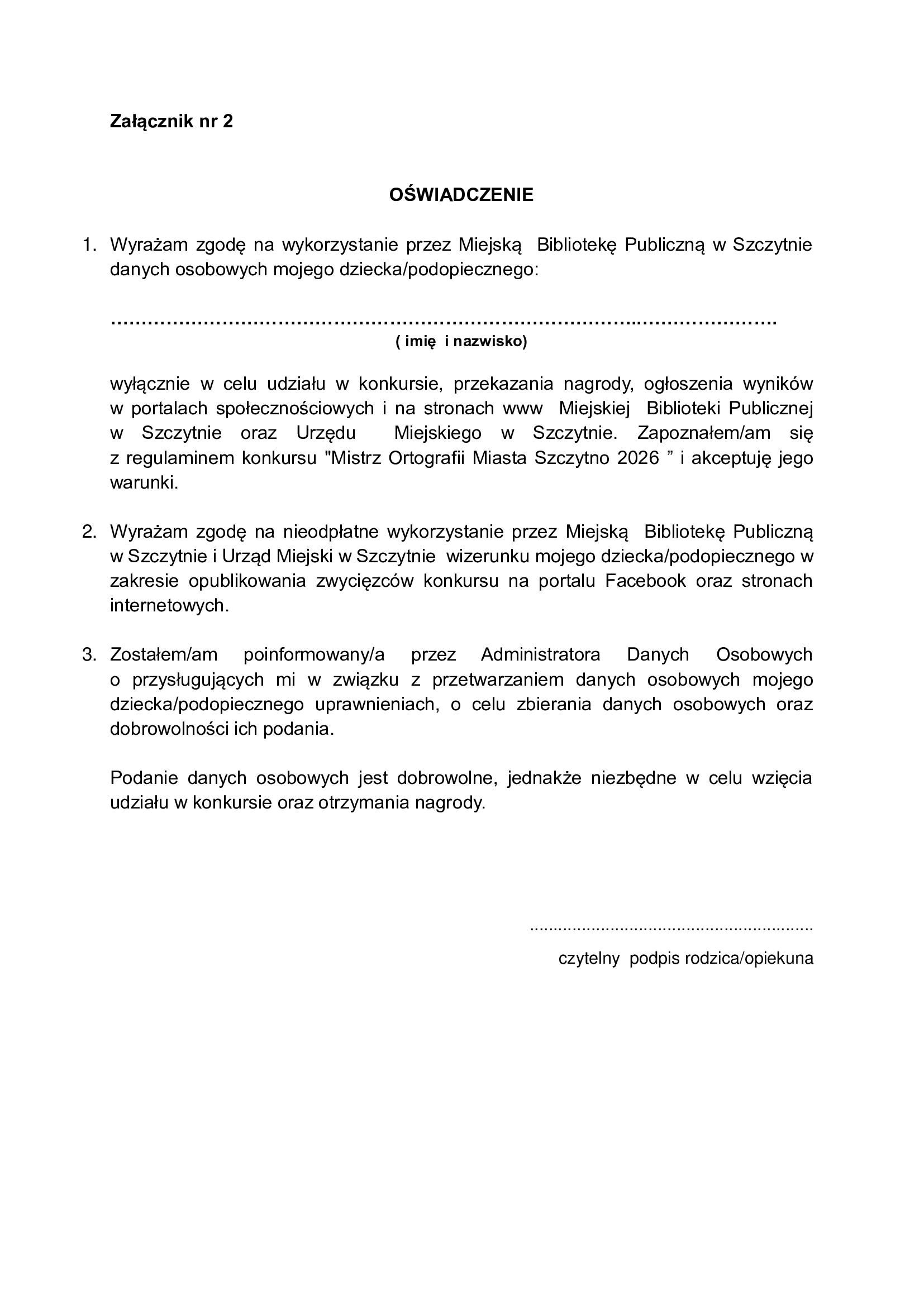przez rodzica lub opiekuna prawnego oświadczenia, które stanowi załącznik nr 2 do
