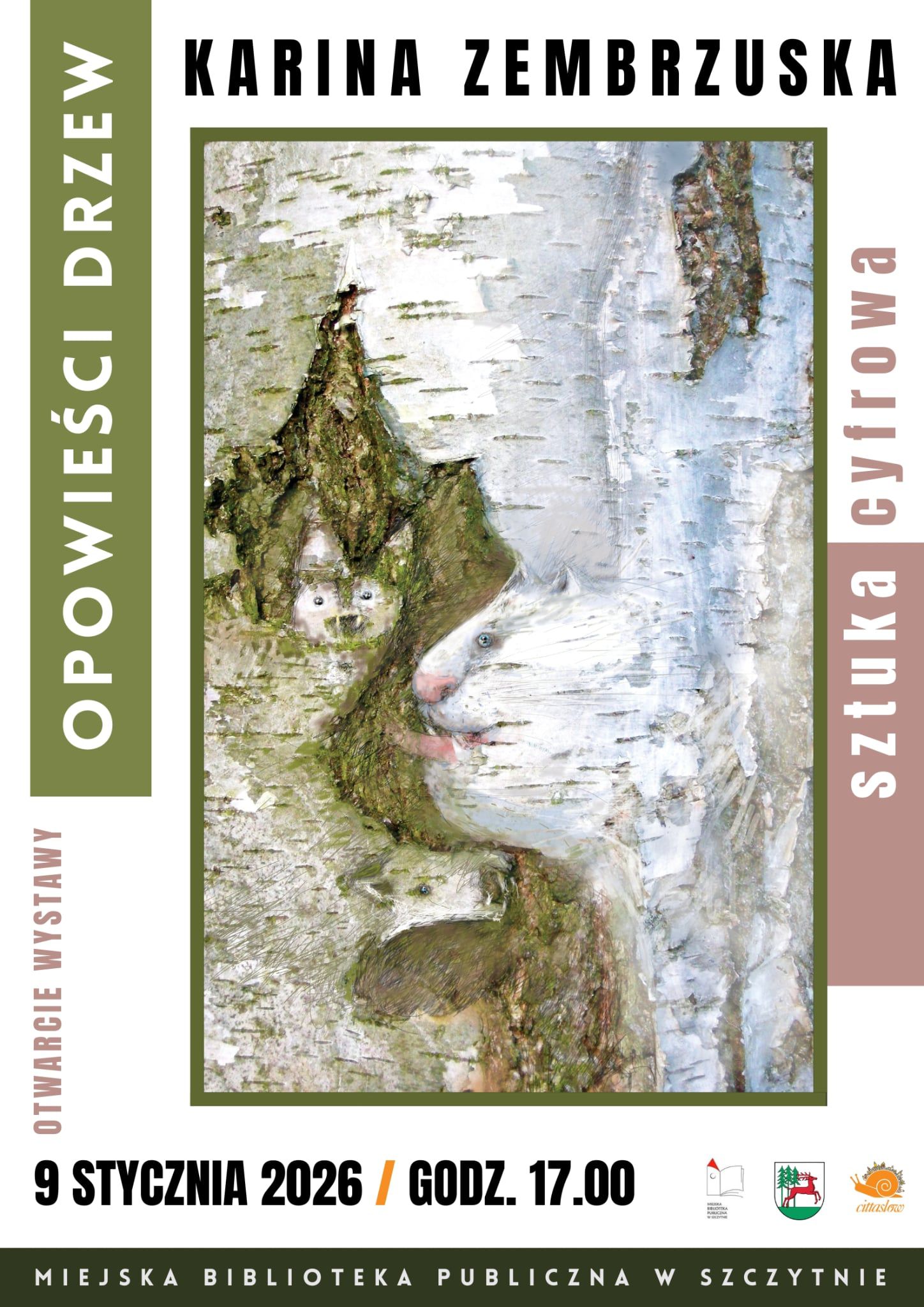 Plakat na otwarcie wystawy pt. "Opowieśc drzew" autorstwa Katarzyny Zembrzuski, Który obędzie się 9 stycznia 2026 r. o godz. 17.00 w Miejskiej Bibliotece Publicznej w Szczytnie