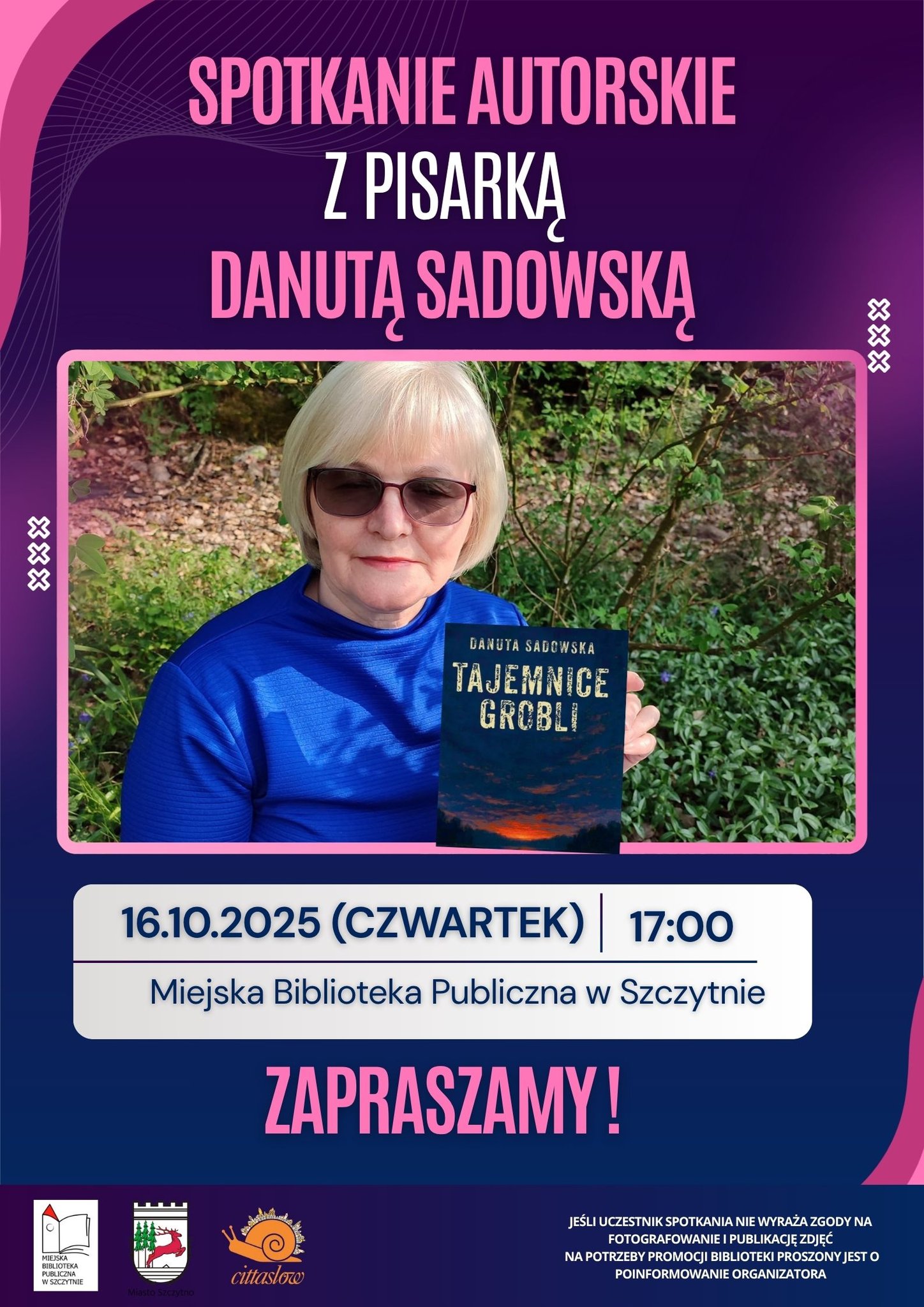 Plakat dotczący spotkania autorskiego z Danutą Sadowską.