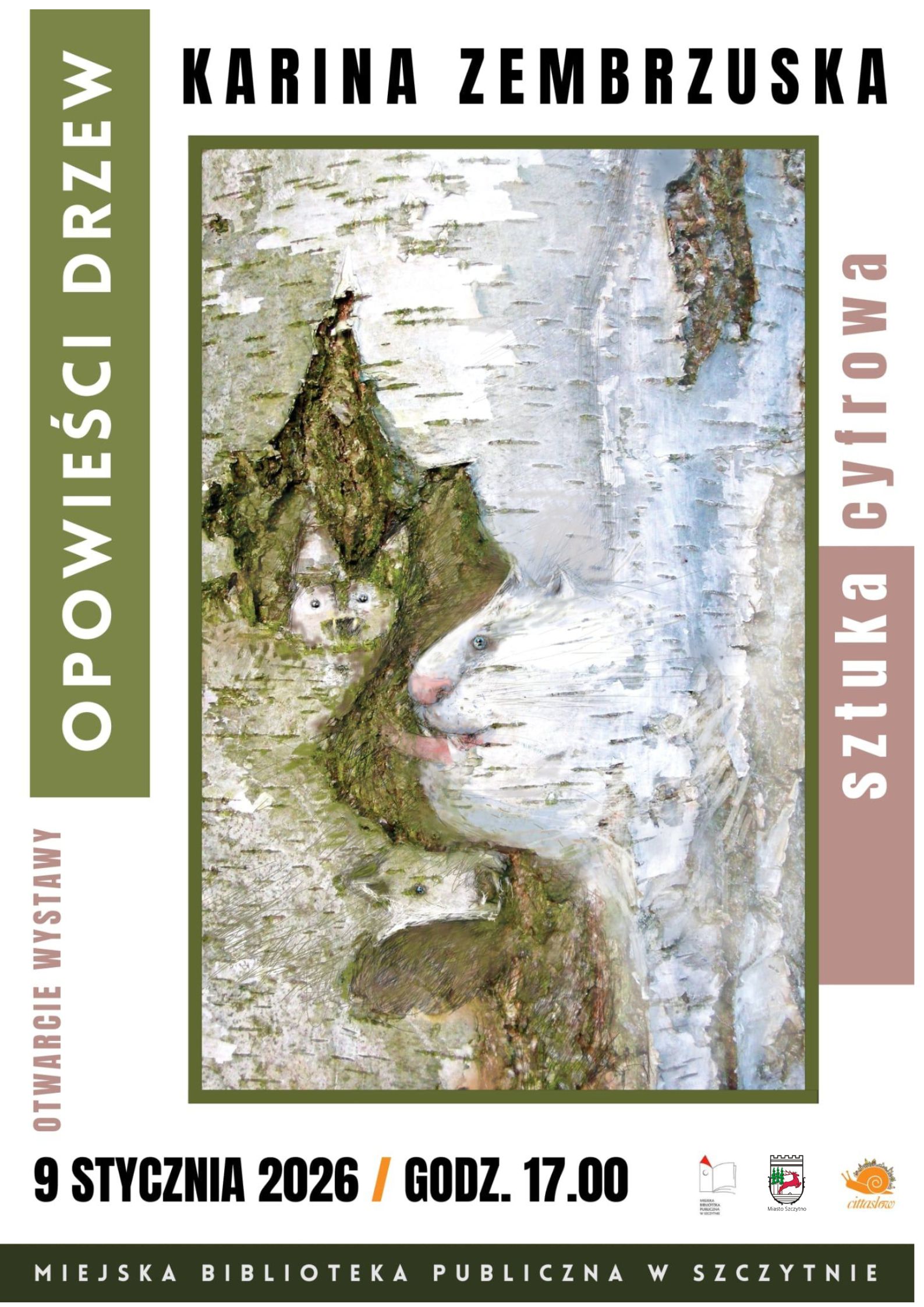 Przejdź do aktualnościMiejska Biblioteka Publiczna w Szczytnie zaprasza na wernisaż wyjątkowej wystawy pt. "Opowieści drzew", który odbędzie się 9 stycznia 2026 r. o godz. 17.00