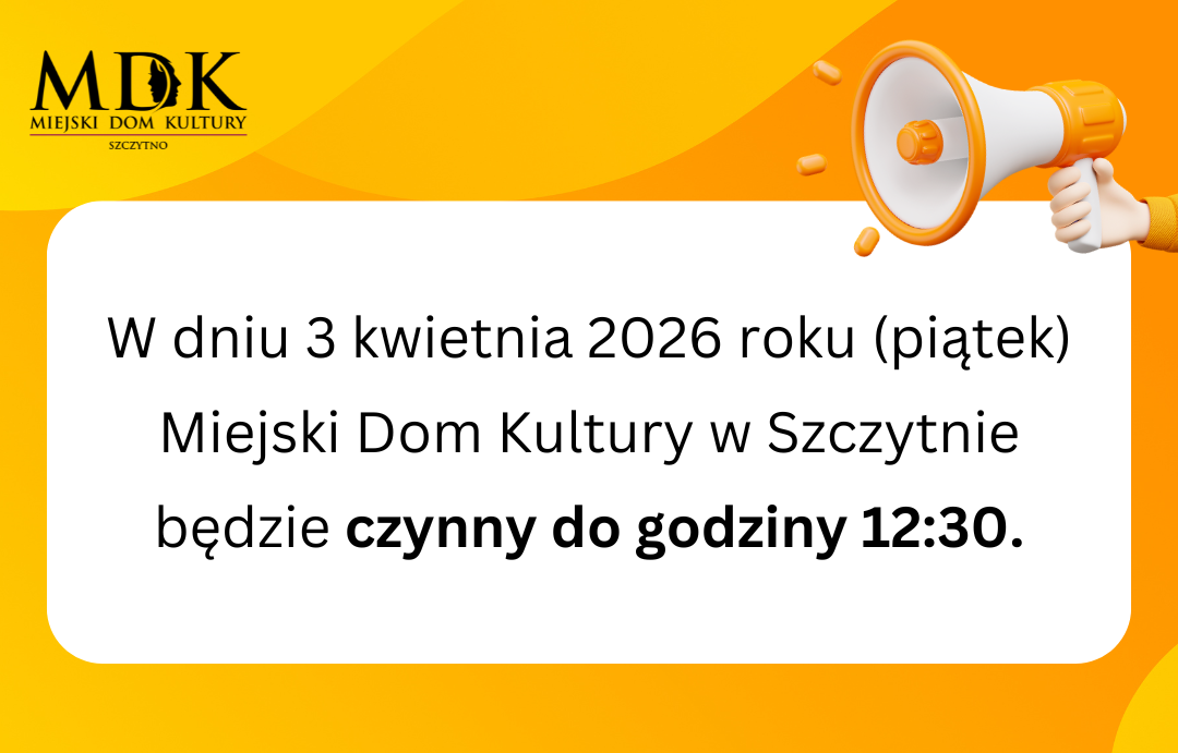 W dniu 3 kwietnia 2026 roku (piątek) Miejski Dom Kultury w Szczytnie będzie czynny do godziny 12:30.