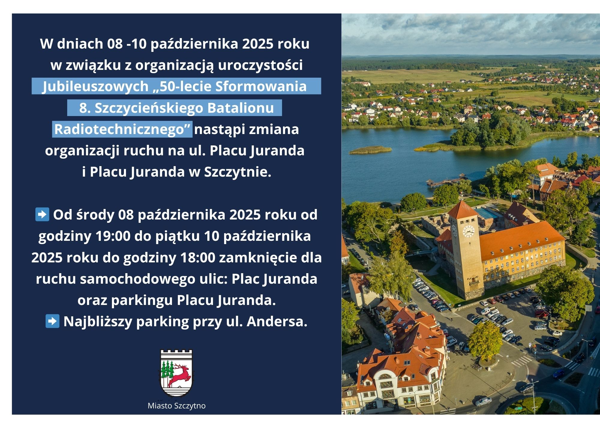 Przejdź do aktualnościW dniach 8 - 10 października 2025 roku w związku z organizacją uroczystości Jubileuszowych „50-lecie Sformowania 8. Szczycieńskiego Batalionu Radiotechnicznego” nastąpi zmiana organizacji ruchu na ul. Placu Juranda i Placu Juranda w Szczytnie.