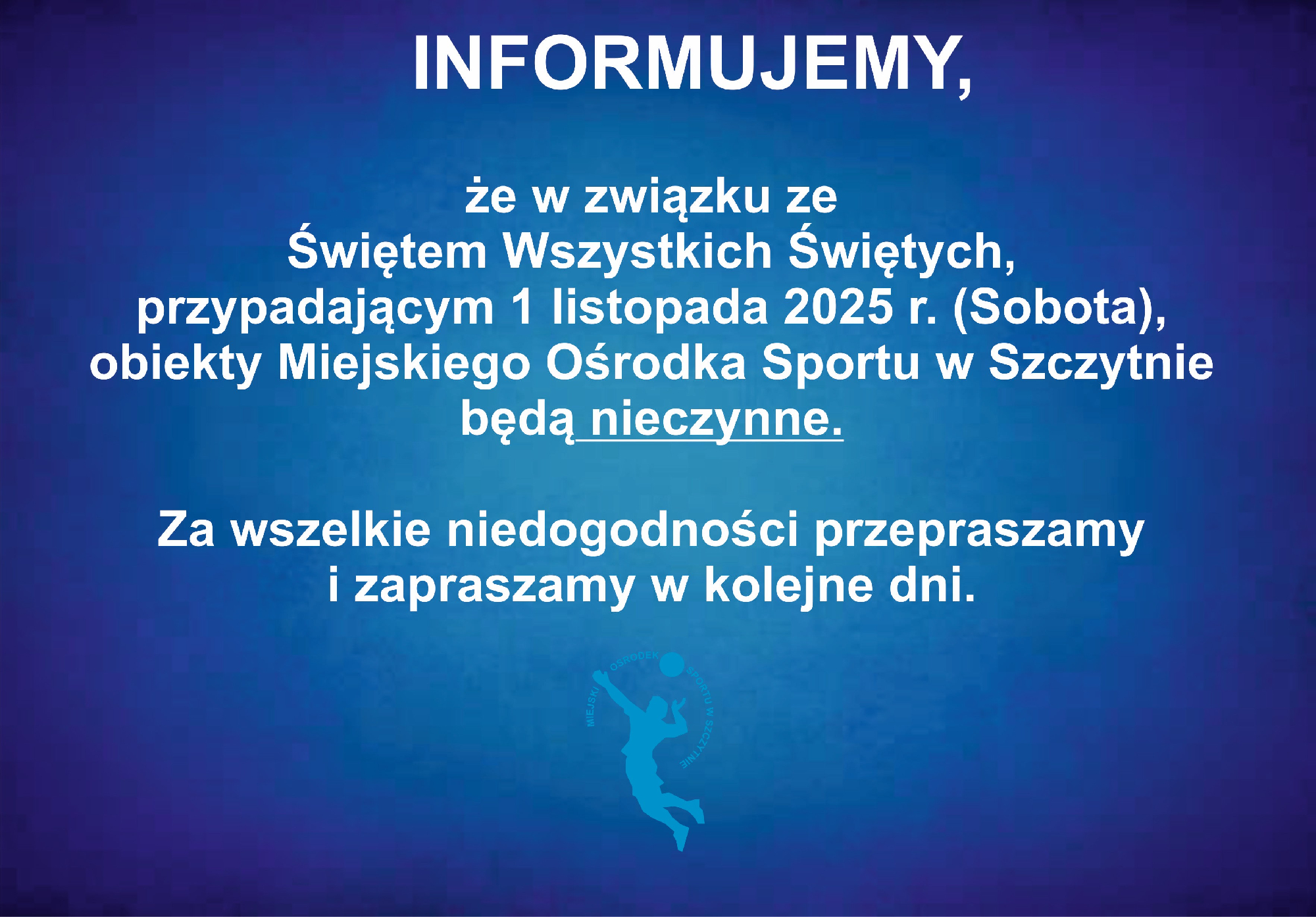 W związku ze Świętem Wszystkich Świętych, przypadającym 1 listopada 2025 r. (sobota), obiekty Miejskiego Ośrodka Sportu w Szczytnie będą nieczynne. Przepraszamy za niedogodności i zapraszamy w kolejne dni.