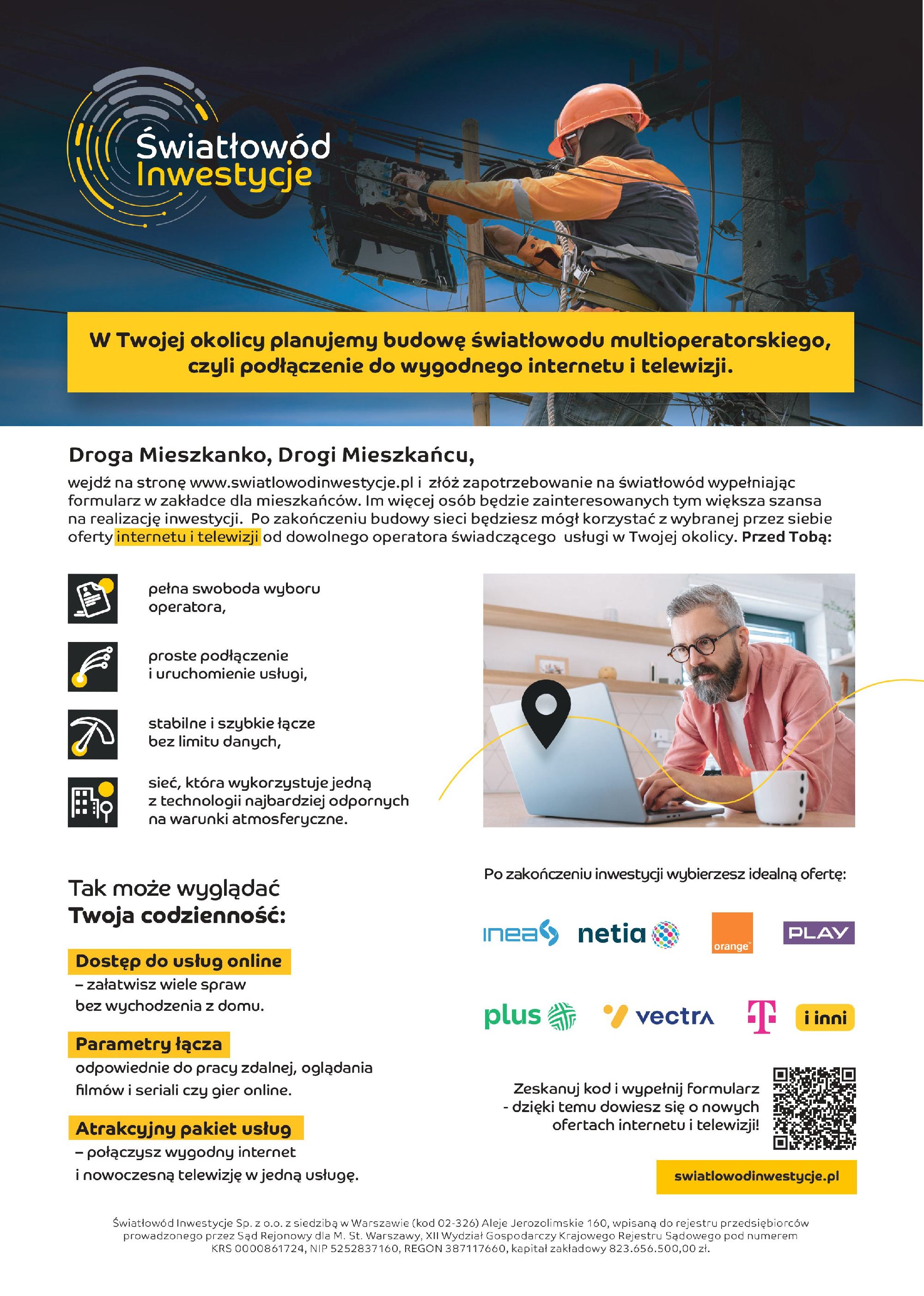Przejdź do aktualnościDzięki porozumieniu zawartemu przez Gminę Miejską Szczytno z firmą Światłowód Inwestycje możliwe jest uzyskanie przyłącza światłowodowego. Jeśli chcieliby Państwo skorzystać z takiej możliwości - zachęcamy do zapoznania się z ofertą.