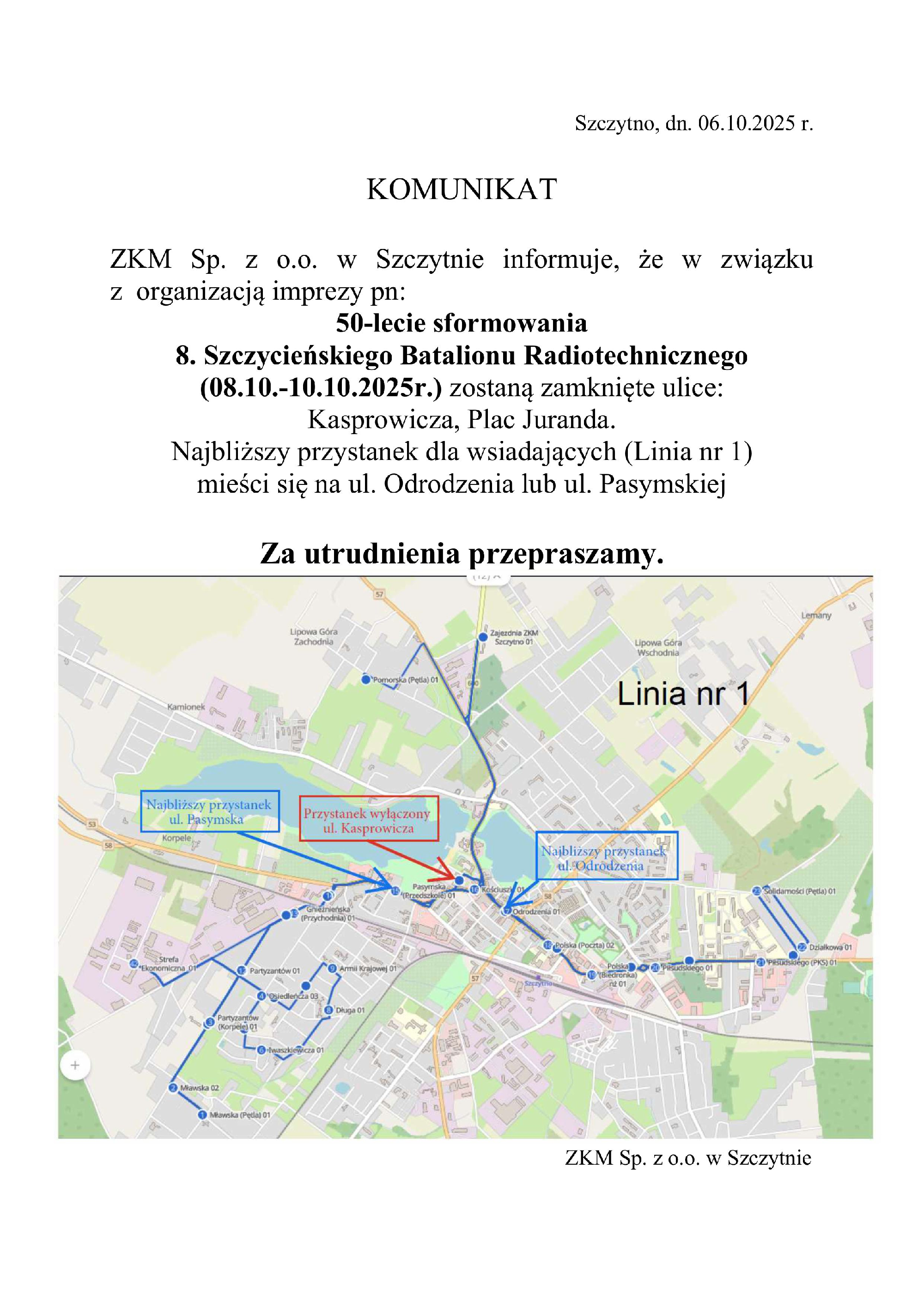 W dniach 8–10 października w związku z obchodami 50-lecia 8. Batalionu Radiotechnicznego w Szczytnie wprowadzona zostanie tymczasowa organizacja ruchu.