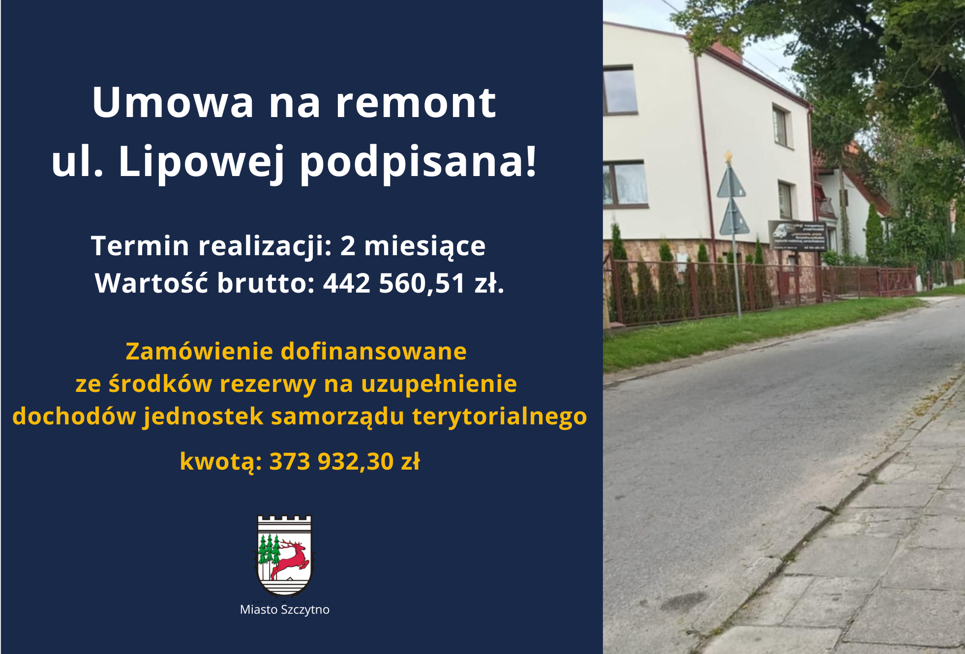Umowa na realizację zadania pn. „Remont ulicy Lipowej w Szczytnie” została podpisana z firmą COLAS Polska Sp. z o.o.. Zakres prac obejmuje rozebranie nawierzchni jezdni, chodników i zjazdów, wymianę krawężników i obrzeży, wykonanie nowej nawierzchni jezdni z betonu asfaltowego, wykonanie nawierzchni chodników i zjazdów z kostki brukowej betonowej, wymianę włazów studni i skrzynek zaworów wodociągowych, humusowanie skarp z obsianiem przy grubości warstwy humusu 10 cm oraz wprowadzenie stałej organizacji ruchu.