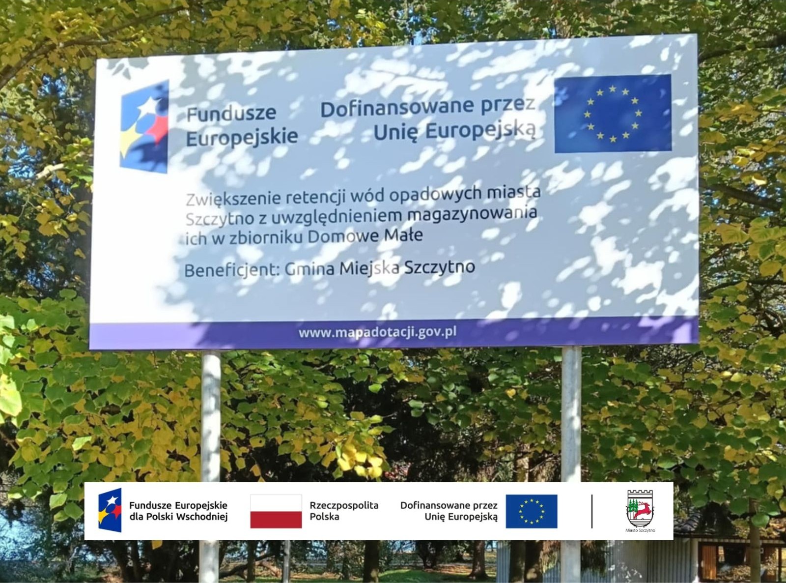 Gmina Miejska Szczytno realizuje projekt pn. Zwiększenie retencji wód opadowych miasta Szczytno z uwzględnieniem magazynowania ich w zbiorniku Domowe Małe. Nr umowy o dofinansowanie FEPW.02.02-IW.01-0008/2025 z 23 września 2025 r. w ramach Program Fundusze Europejskie dla Polski Wschodniej 2021-2027. Priorytet FEPW.02 Energia i klimat. Typ projektu I. Spójne i zintegrowane przedsięwzięcia infrastrukturalne, kompleksowo dostosowujące miasta do ekstremalnych stanów pogodowych oraz łagodzące efekt miejskich wysp ciepła przez rozwój zielono-niebieskiej infrastruktury.