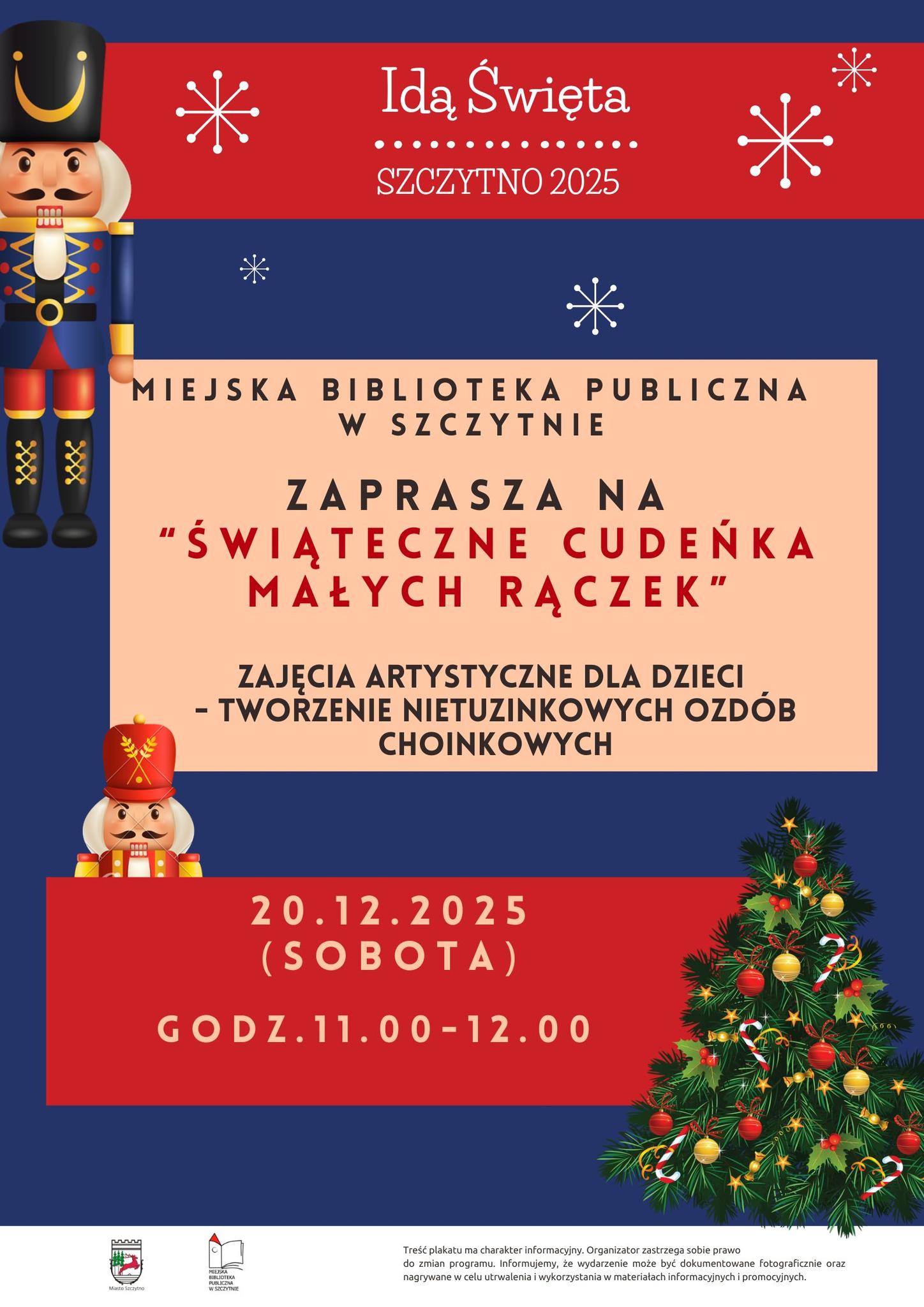 Miejska Biblioteka Publiczna w Szczytnie zaprasza dzieci wraz z opiekunami na zajęcia artystyczne, które odbędą się w sobotę, 20 grudnia, o godzinie 11:00 w Oddziale Literatury Dziecięcej i Młodzieżowej. W programie przewidziano wspólne tworzenie różnorodnych ozdób choinkowych z wykorzystaniem prostych materiałów plastycznych.