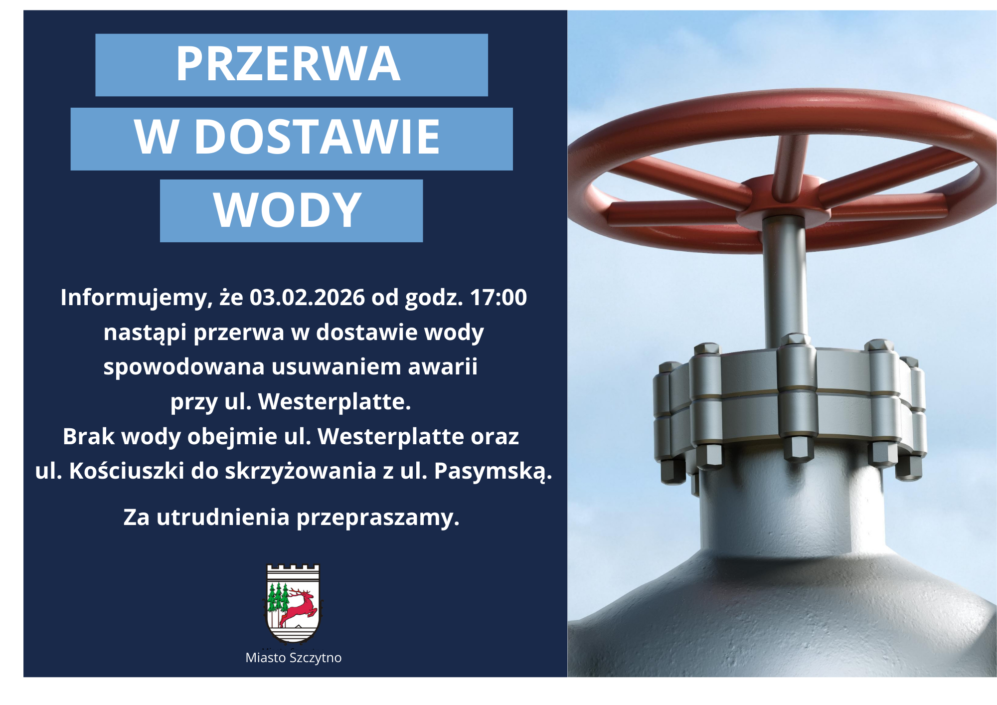 PWiK AQUA Sp. z o.o. w Szczytnie informuje, że w dniu 3 lutego 2026 r. od godz. 17:00 nastąpi przerwa w dostawie wody spowodowana pracami naprawczymi przy ul. Westerplatte.