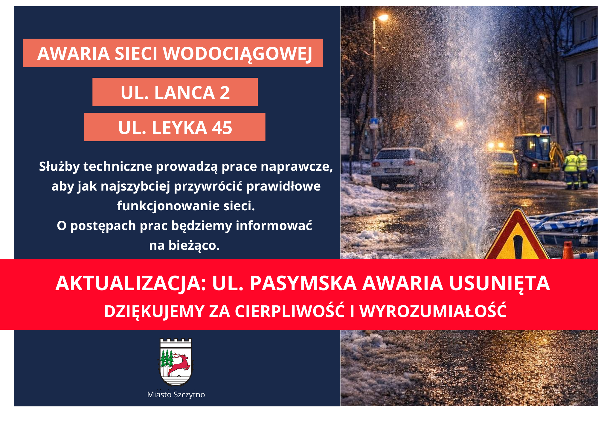 Służby techniczne PWiK AQUA Sp. z o.o. w Szczytnie nadal prowadzą intensywne prace naprawcze: ul. Lanca 2 oraz ul. Leyka 45.