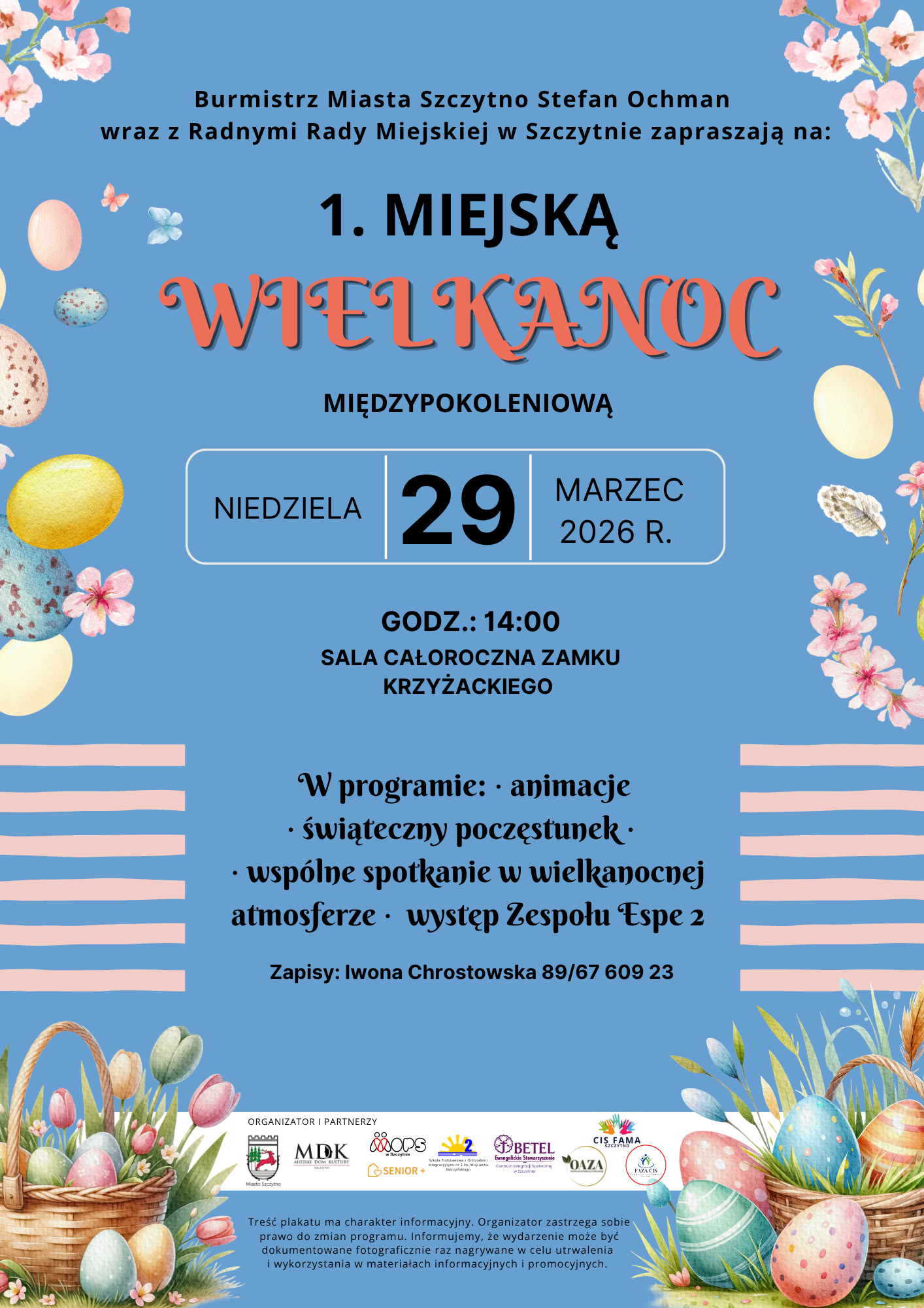 Burmistrz Miasta Szczytno Stefan Ochman wraz z Radnymi Rady Miejskiej zapraszają na 1. Miejską Wielkanoc Międzypokoleniową dla osób pozostających pod opieką Miejskiego Ośrodka Pomocy Społecznej w Szczytni. Spotkanie odbędzie się o godzinie 14:00 w sali całorocznej Zamku Krzyżackiego w Szczytnie.