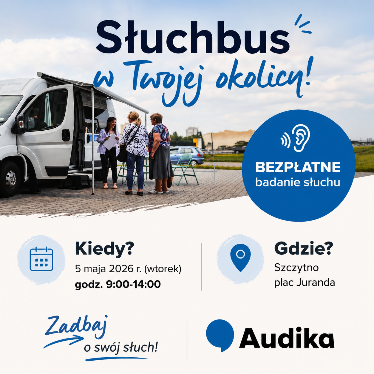 We wtorek, 5 maja 2026 roku, w godzinach od 9:00 do 14:00 na Placu Juranda w Szczytnie stanie słuchobus, w którym każdy mieszkaniec będzie mógł bezpłatnie wykonać badanie słuchu. Nie są wymagane wcześniejsze zapisy.