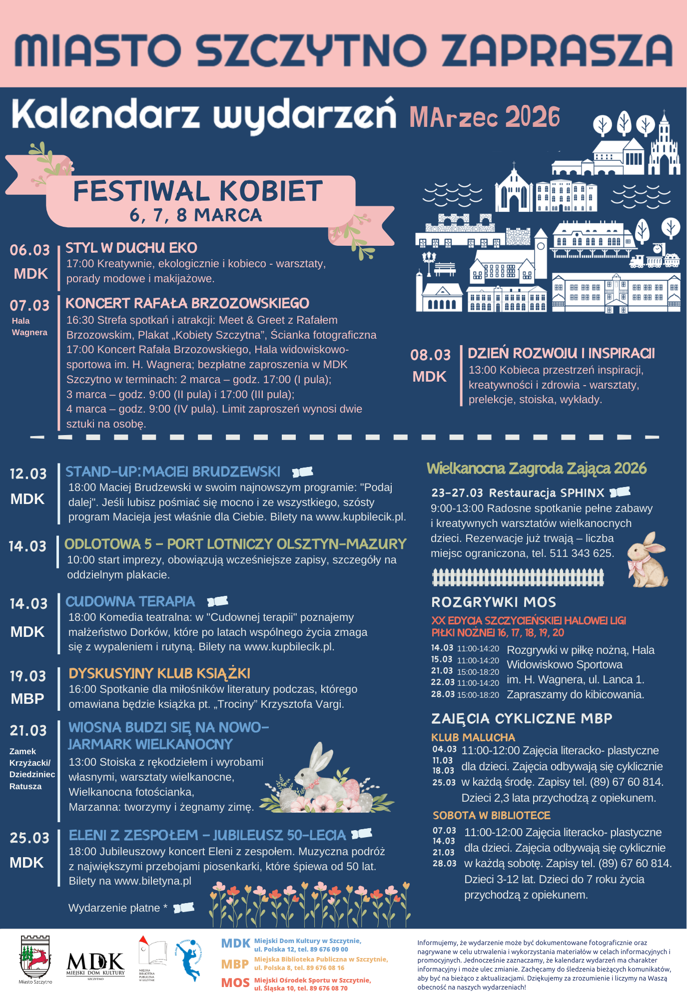 Miasto Szczytno zaprasza mieszkańców i gości do udziału w wydarzeniach przygotowanych na marzec 2026 roku. Program obejmuje koncerty, warsztaty, spotkania, wydarzenia dla dzieci oraz inicjatywy sportowe.