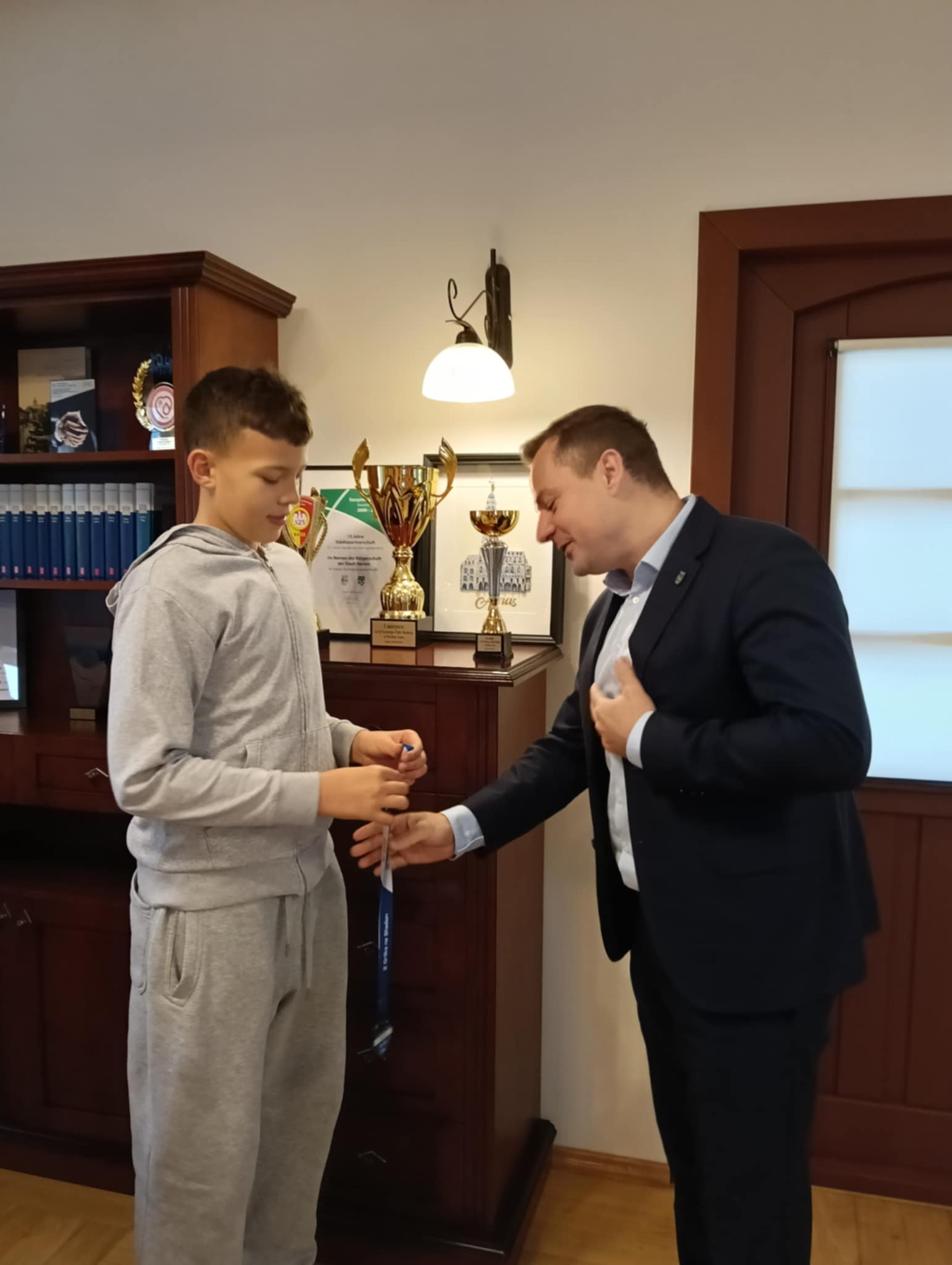 Podczas spotkania Burmistrz oraz Wiceprzewodniczący Rady Miejskiej podziękowali zawodnikom, trenerom oraz dyrekcji szkoły za godne reprezentowanie miasta. Sześciu piłkarzom, którzy z różnych względów nie mogli pojechać na turniej, wręczyli pamiątkowe plecaki, a Burmistrz Stefan Ochman od drużyny otrzymał pamiątkowy medal.