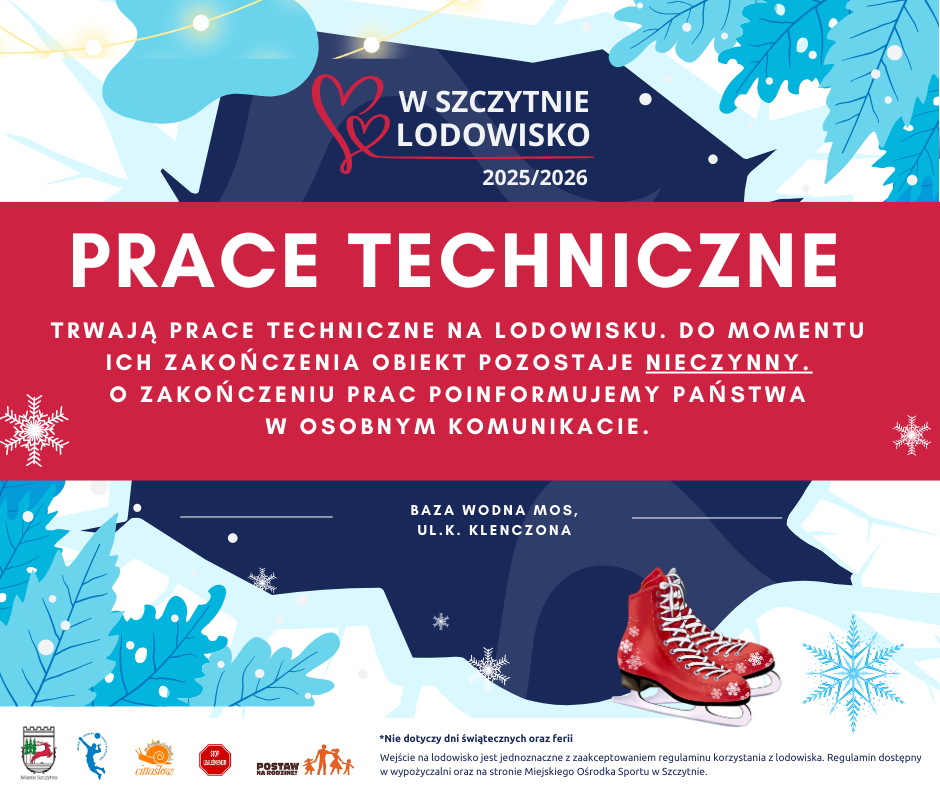 Informujemy, że na lodowisku miejskim prowadzone są prace techniczne. Do czasu ich zakończenia obiekt pozostaje nieczynny. Działania te mają na celu zapewnienie bezpiecznego oraz komfortowego korzystania z lodowiska w nadchodzącym sezonie 2025/2026