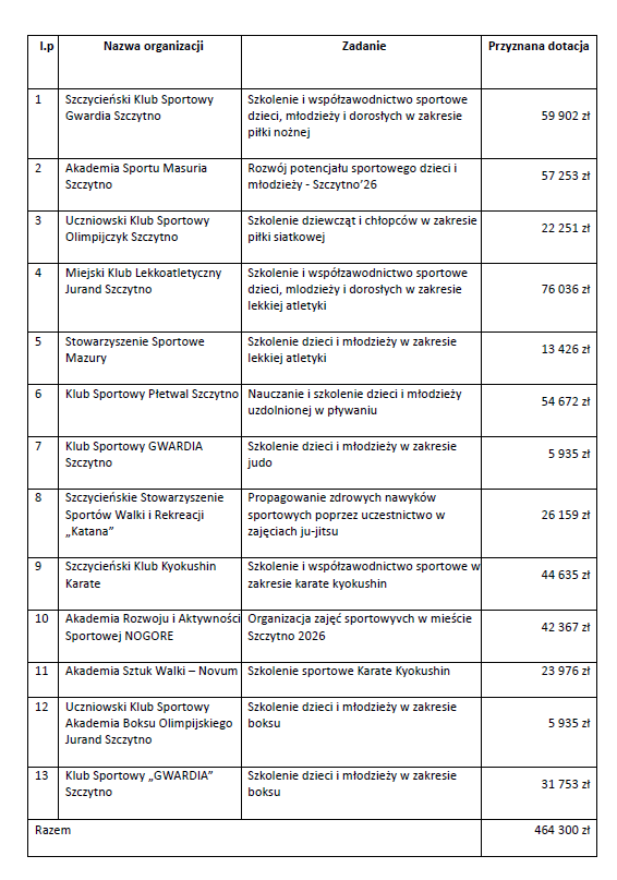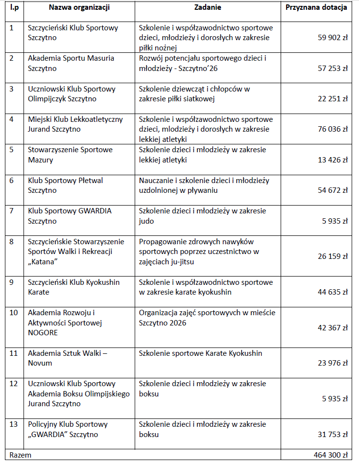 Po zapoznaniu się z opinią Komisji Konkursowej w przedmiocie wniosków złożonych w konkursie o dotacje na realizację zadań w zakresie tworzenia warunków sprzyjających rozwojowi sportu w 2026 roku Burmistrz Miasta Szczytno przyznał następujące dotacje: