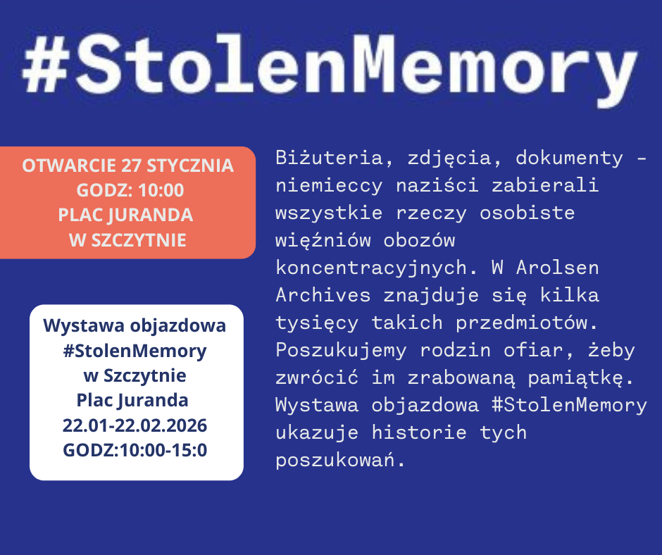Wystawa objazdowa #StolenMemory zostanie zaprezentowana na Placu Juranda w Szczytnie. Uroczyste otwarcie ekspozycji zaplanowano na 27 stycznia 2026 r. (wtorek) o godz. 12:00. Po oficjalnym otwarciu odbędzie się odczyt naukowy w Muzeum w Szczytnie, które wspiera organizację wydarzenia. Muzeum mieści się przy ul. Sienkiewicza 1, na dziedzińcu ratusza, w sąsiedztwie Urzędu Miejskiego.