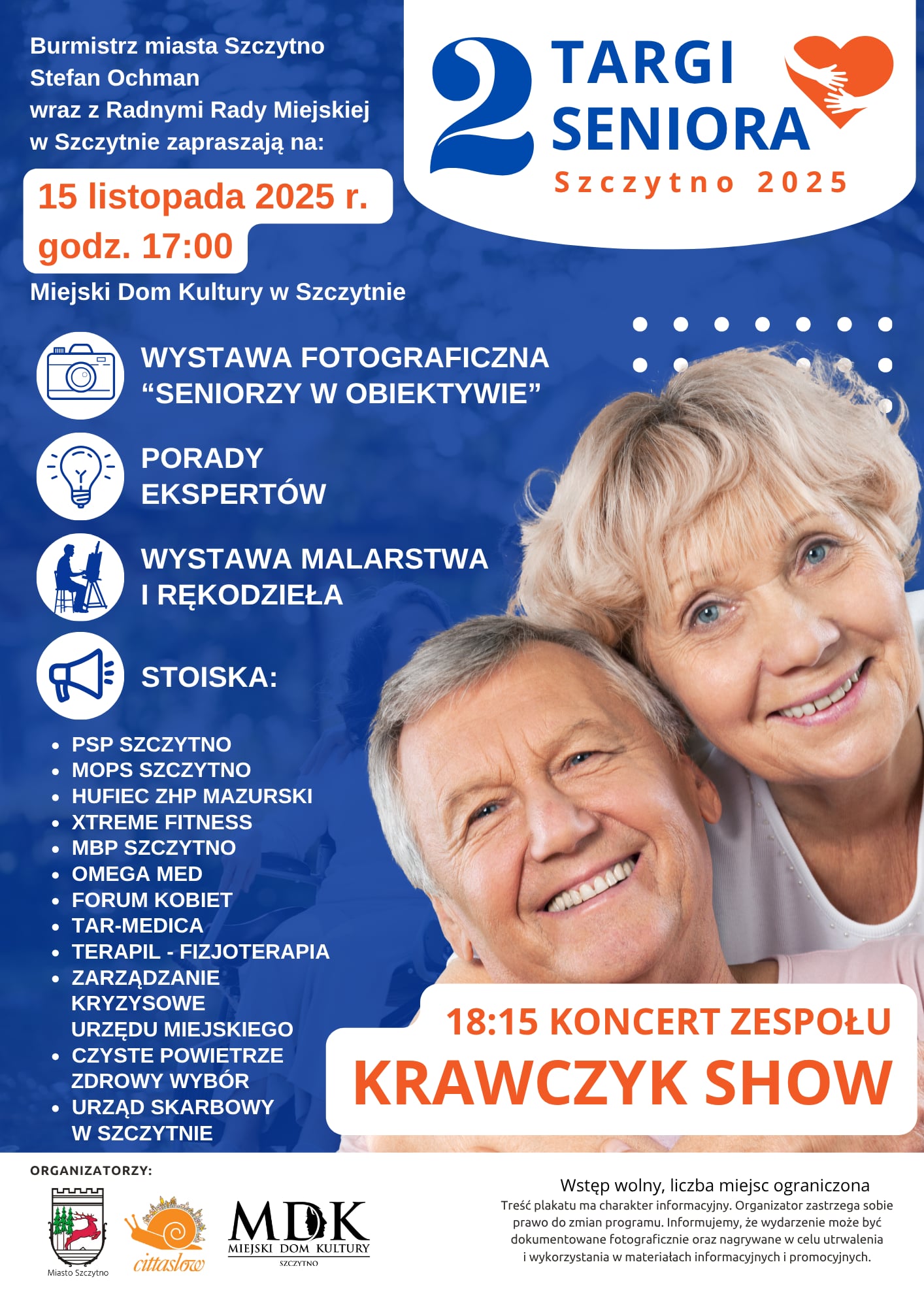 Zapraszamy na drugą edycję Targów Seniora, które odbędą się 15 listopada 2025 r. o godz. 17:00 w Miejskim Domu Kultury w Szczytnie.