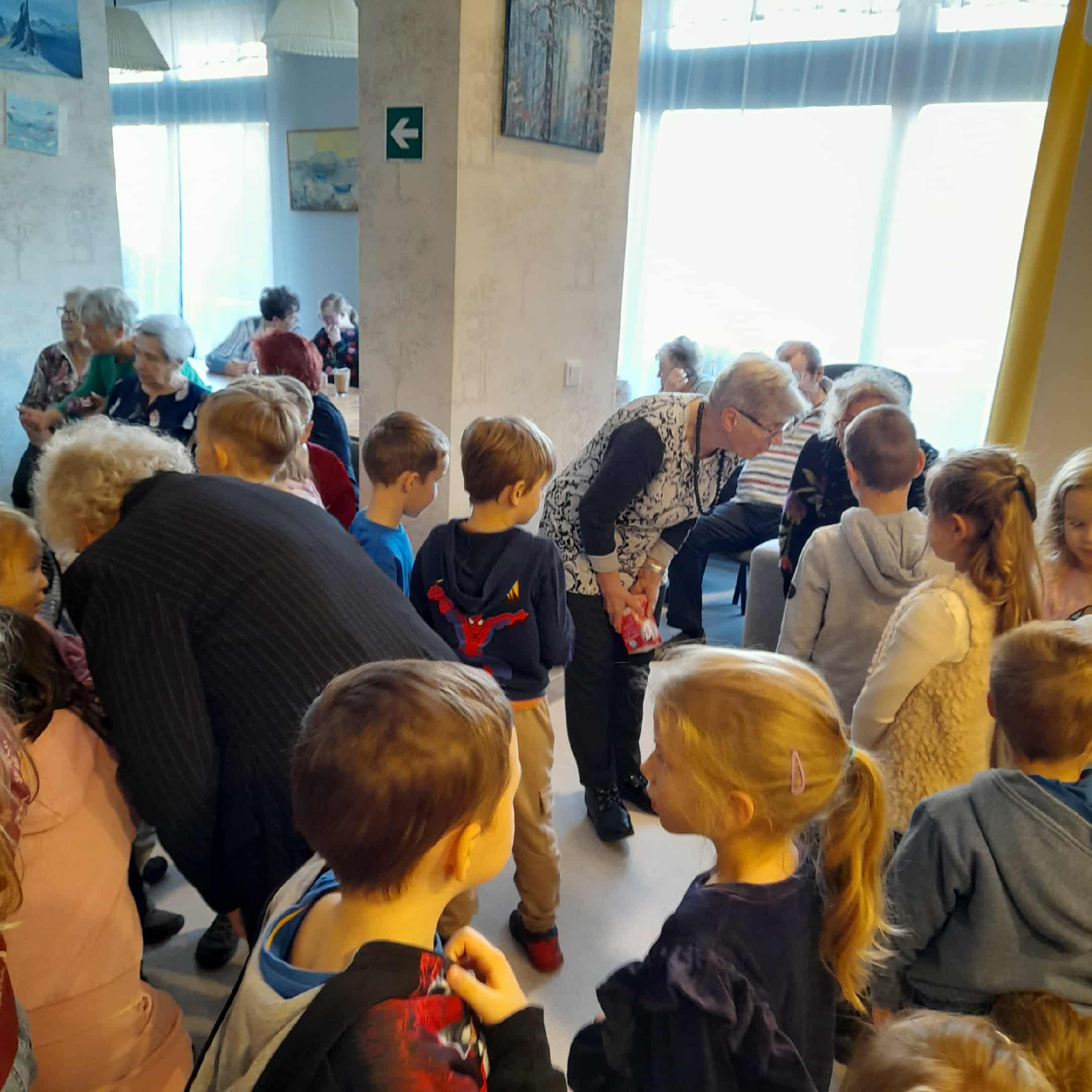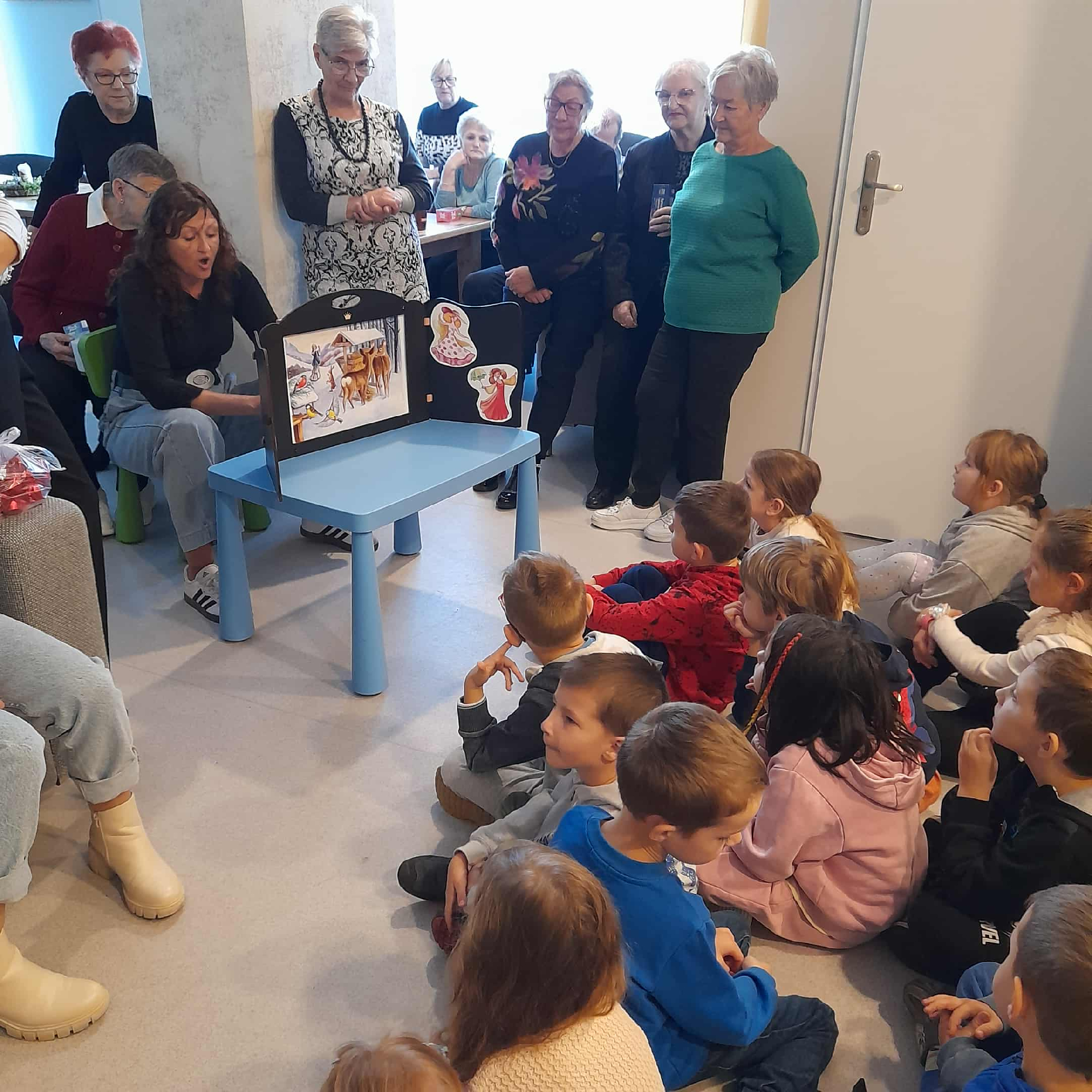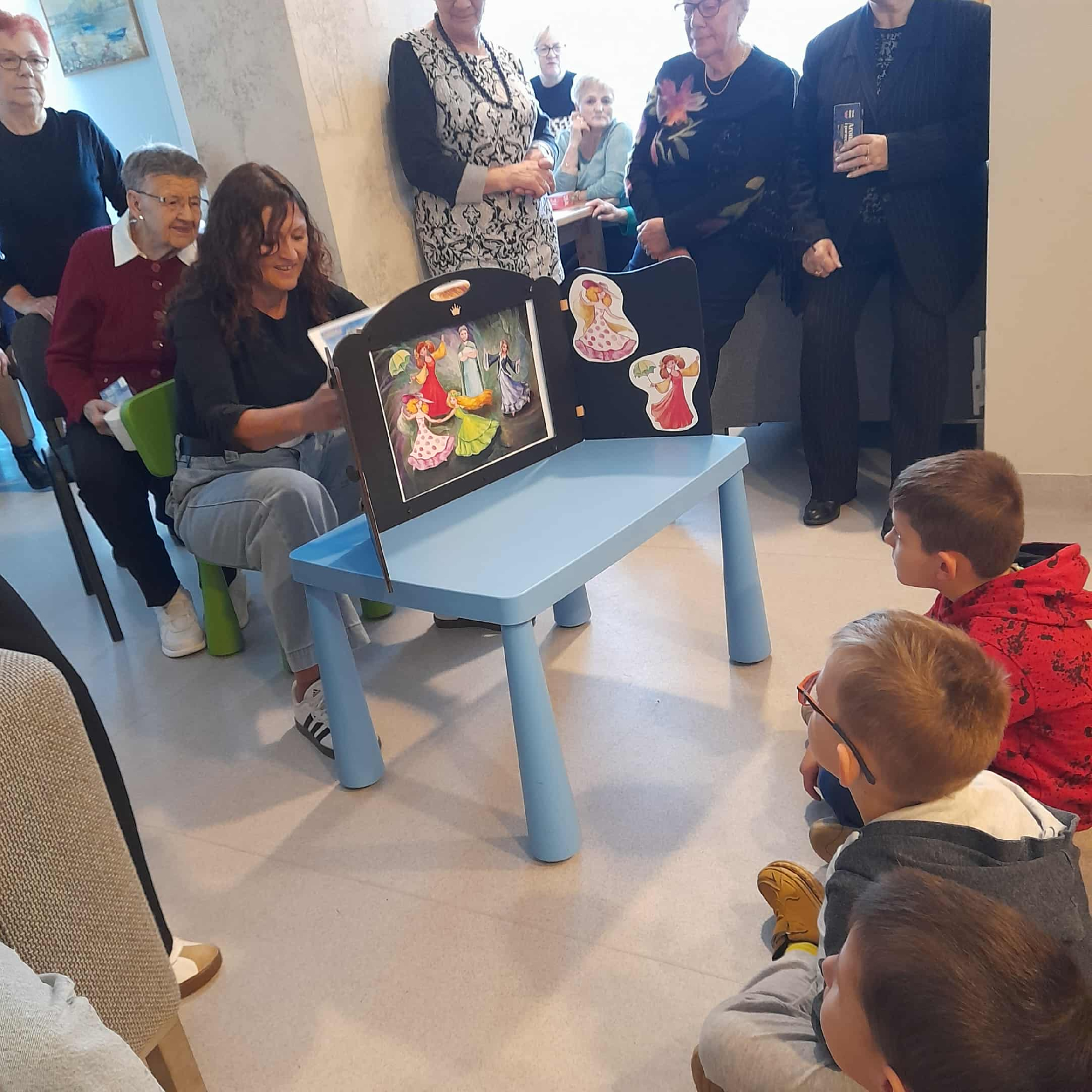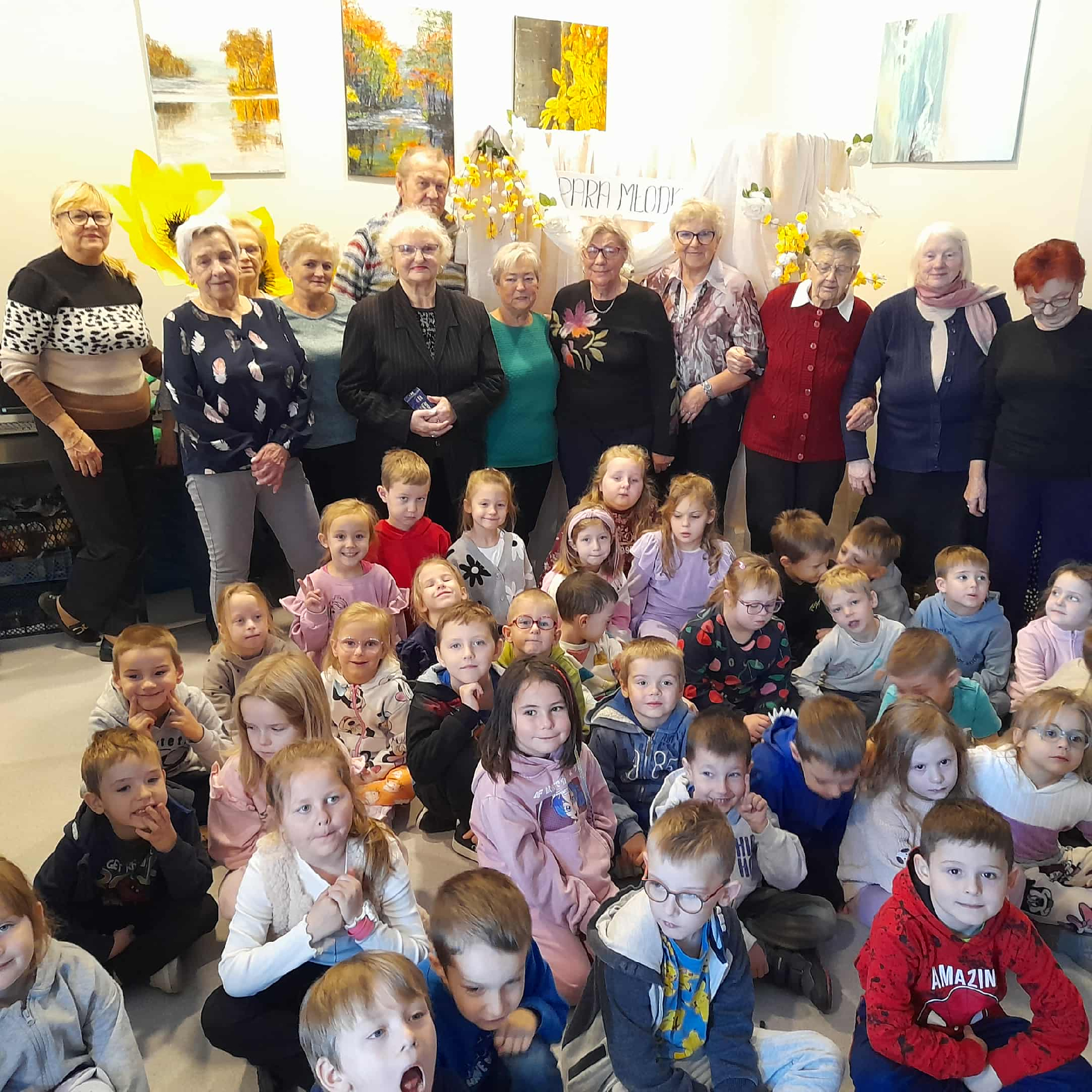 20 października obchodziliśmy Europejski Dzień Seniora. Tego dnia grupa "Motylki" i "Sówki " wybrała się do Klubu SENIOR + w celu przekazania herbat i słodyczy pochodzących ze zbiórki charytatywnej organizowanej w naszym przedszkolu. Rozpoczęliśmy życzeniami oraz przywitaniem Seniorów piosenką pt." Jesień fajne ma kałuże". Następnie wspólnie spędzony czas na rozmowach i życzliwych uśmiechach, to niezapomniane chwile. Pani Bibliotekarka przedstawiła obrazkowy teatrzyk, opowiadając o porach roku. Zarówno dzieci jak i Seniorzy byli zachwyceni. Dziękujemy za prezent w postaci ręcznie wykonanej donicy.