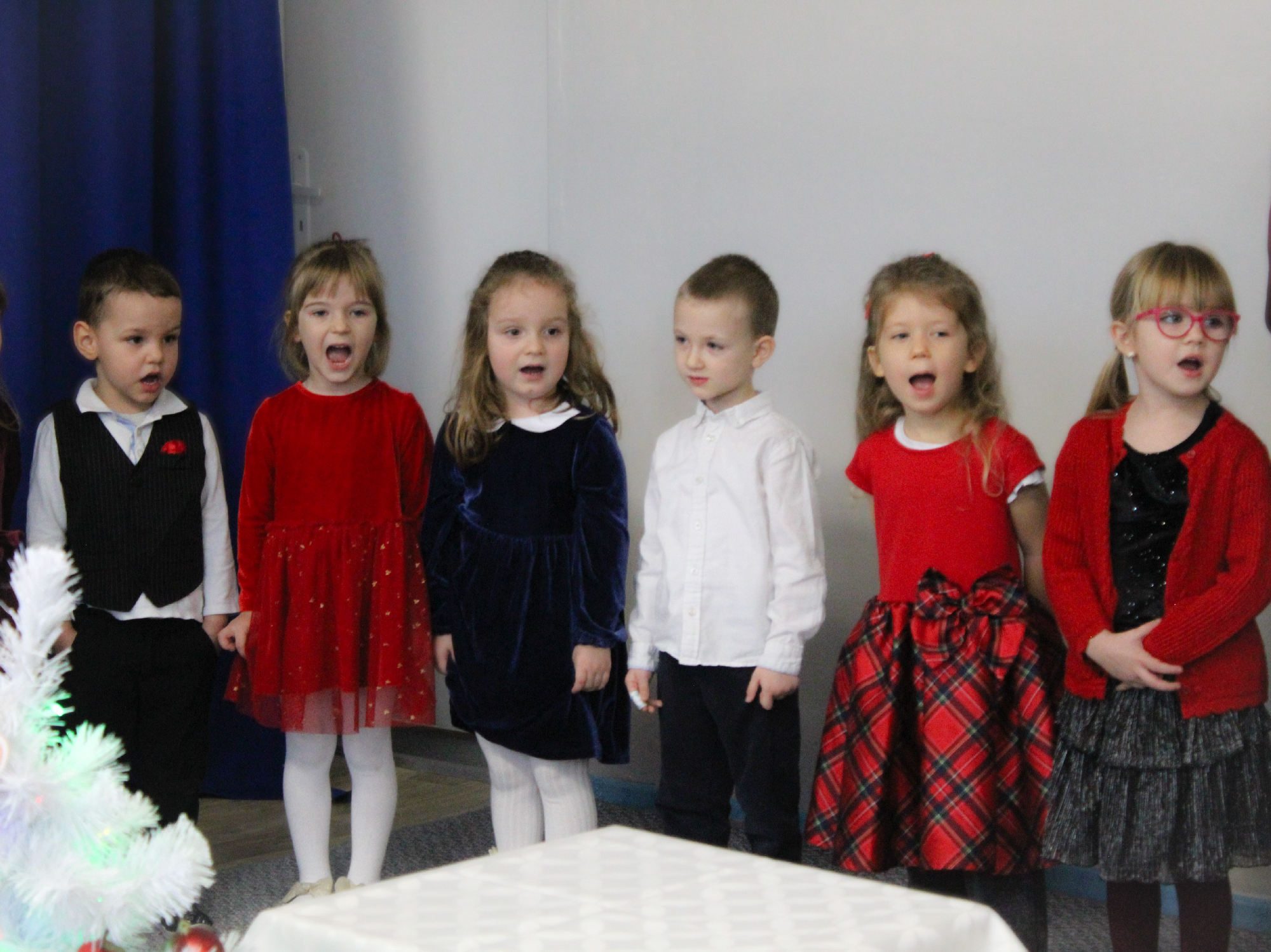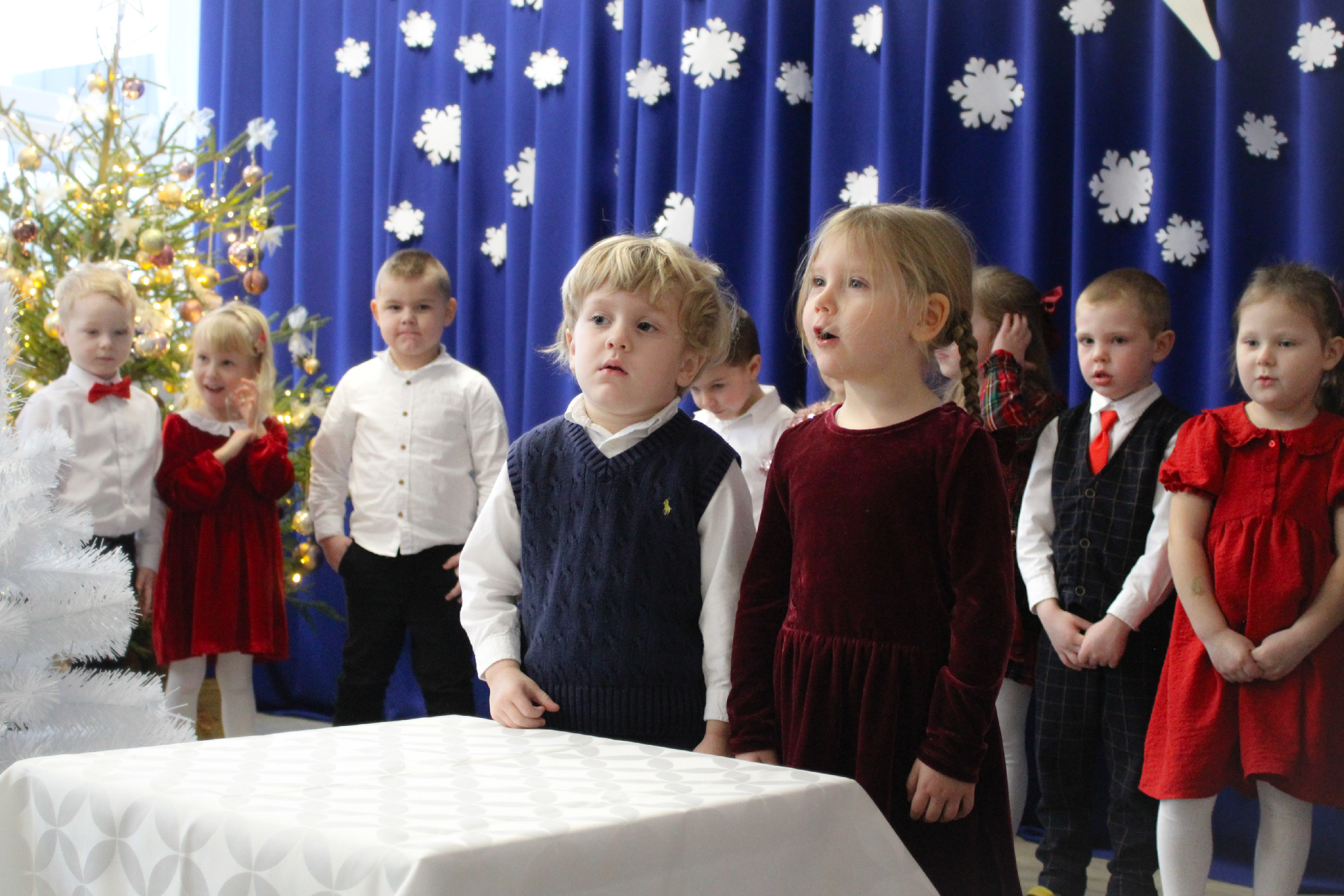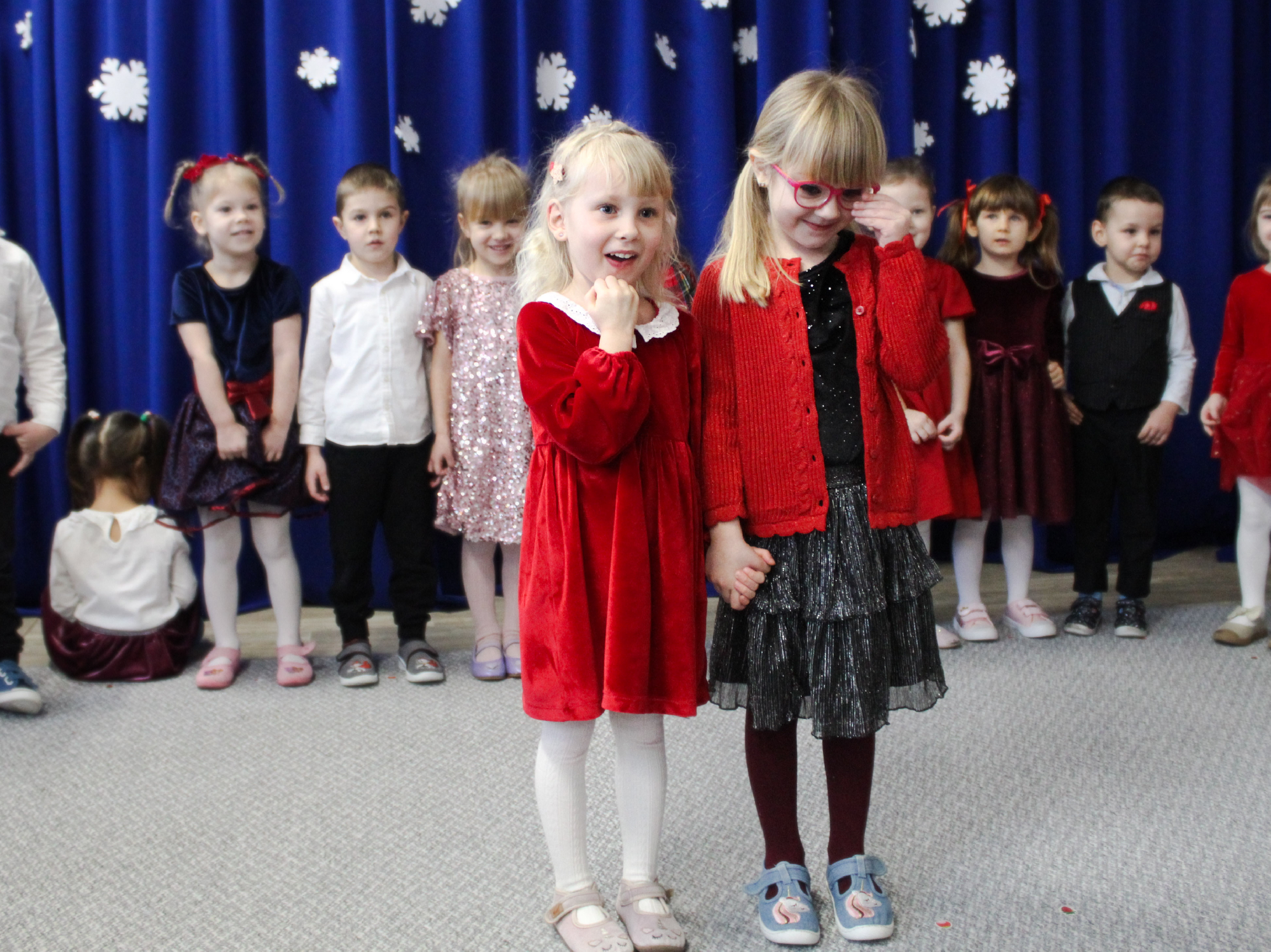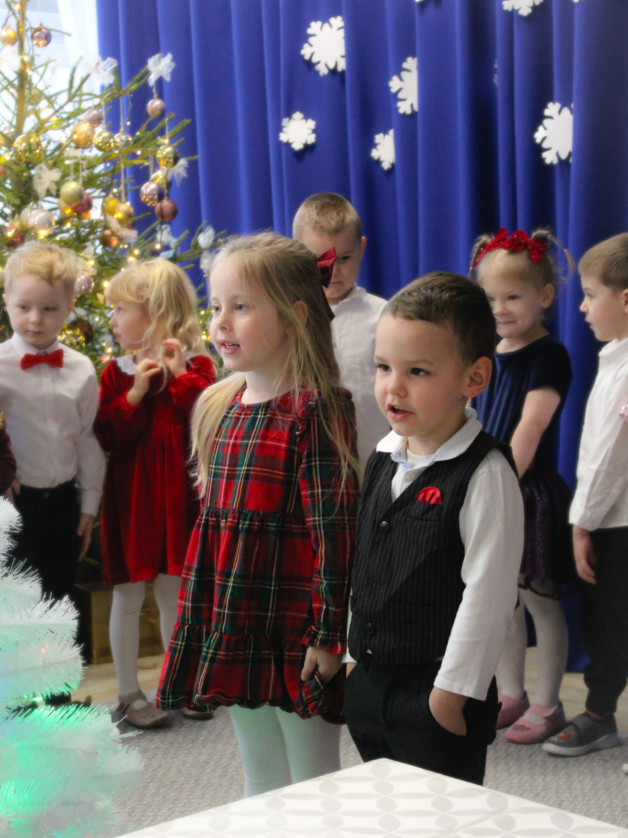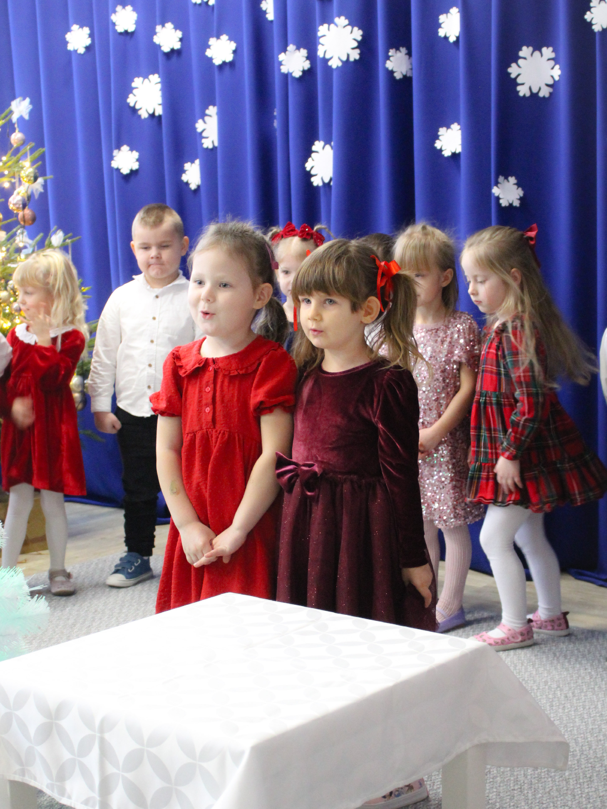 Uroczystość choinkowa w grupie Poziomki odbyła się w radosnej i ciepłej atmosferze. Dzieci zaprezentowały przygotowane wiersze, piosenki oraz tańce o tematyce świątecznej, wzbudzając wiele wzruszeń wśród zaproszonych gości. Wspólne kolędowanie oraz spotkanie z Mikołajem sprawiły dzieciom ogromną radość. Uroczystość była okazją do integracji grupy oraz wprowadzenia wszystkich w magiczny, świąteczny nastrój. 🎄