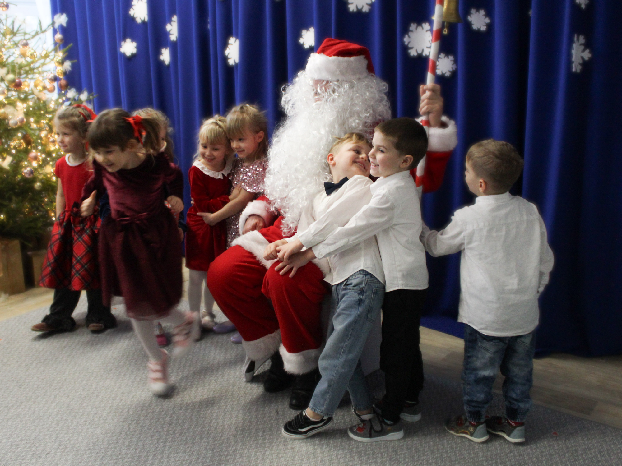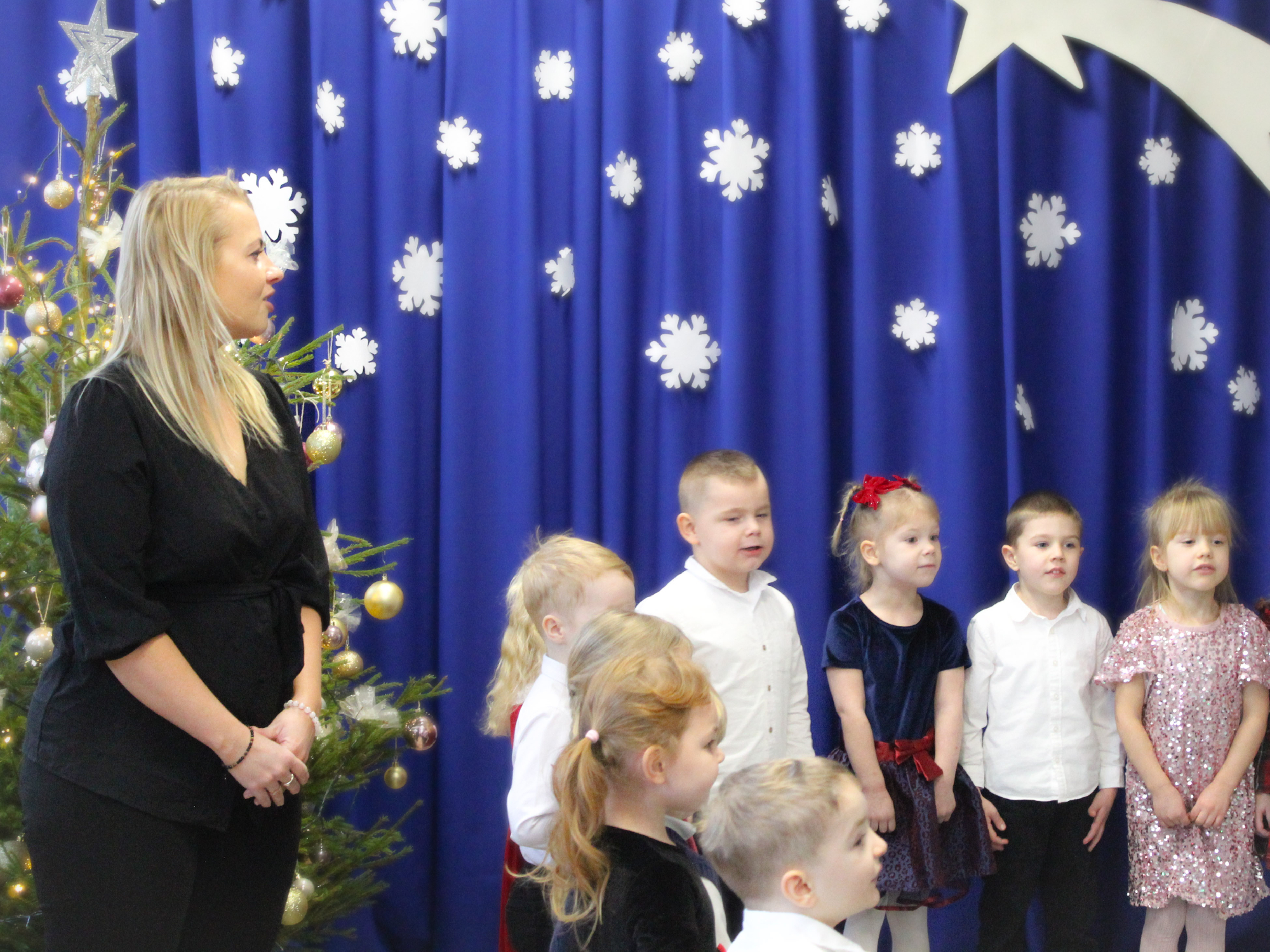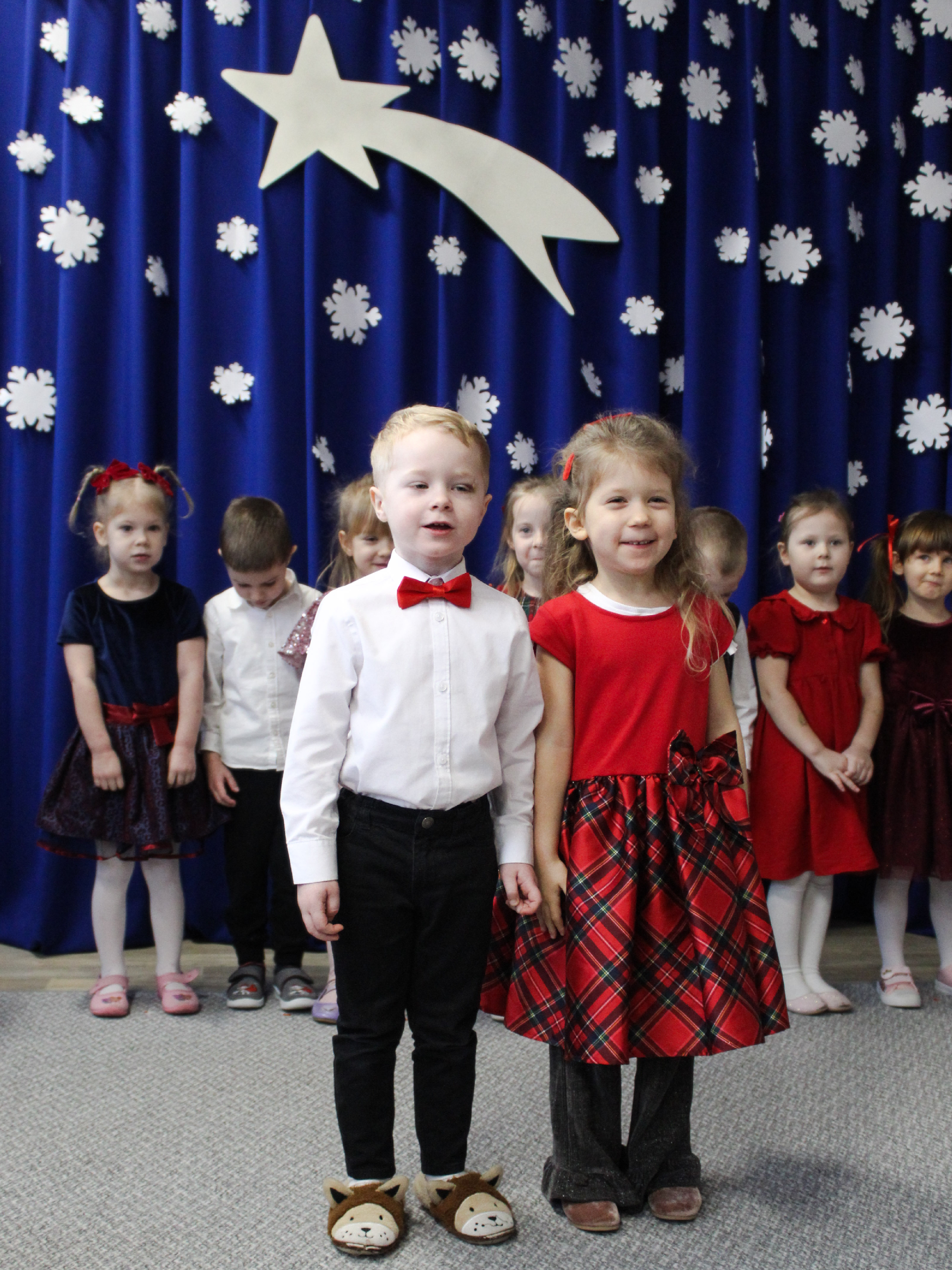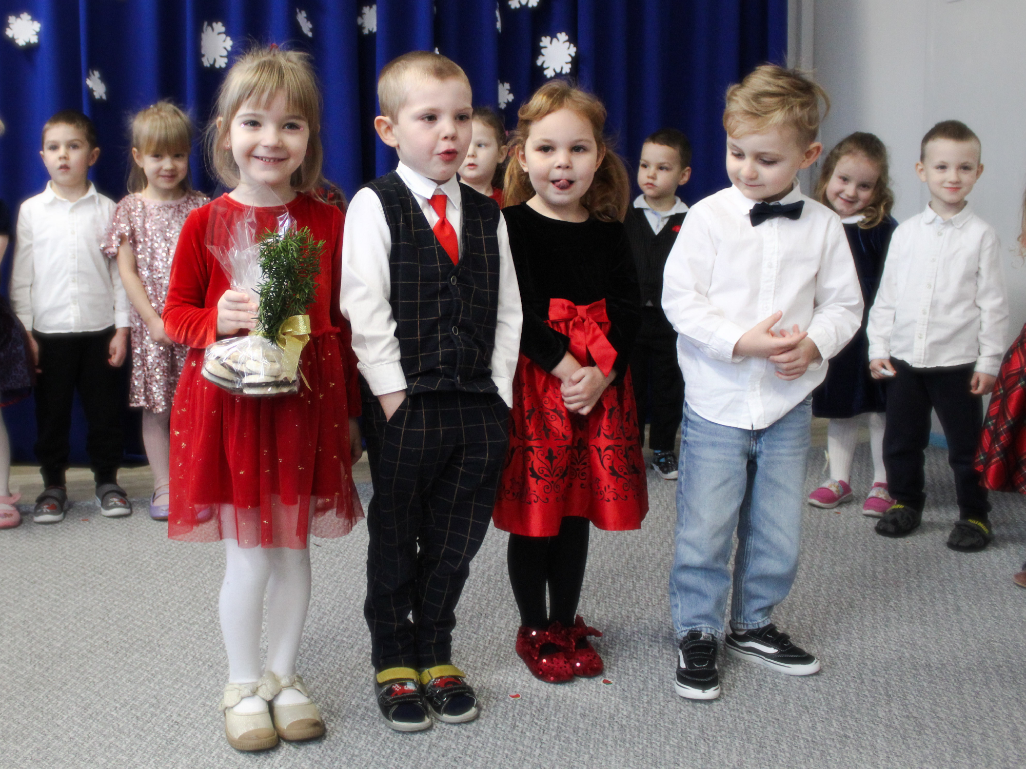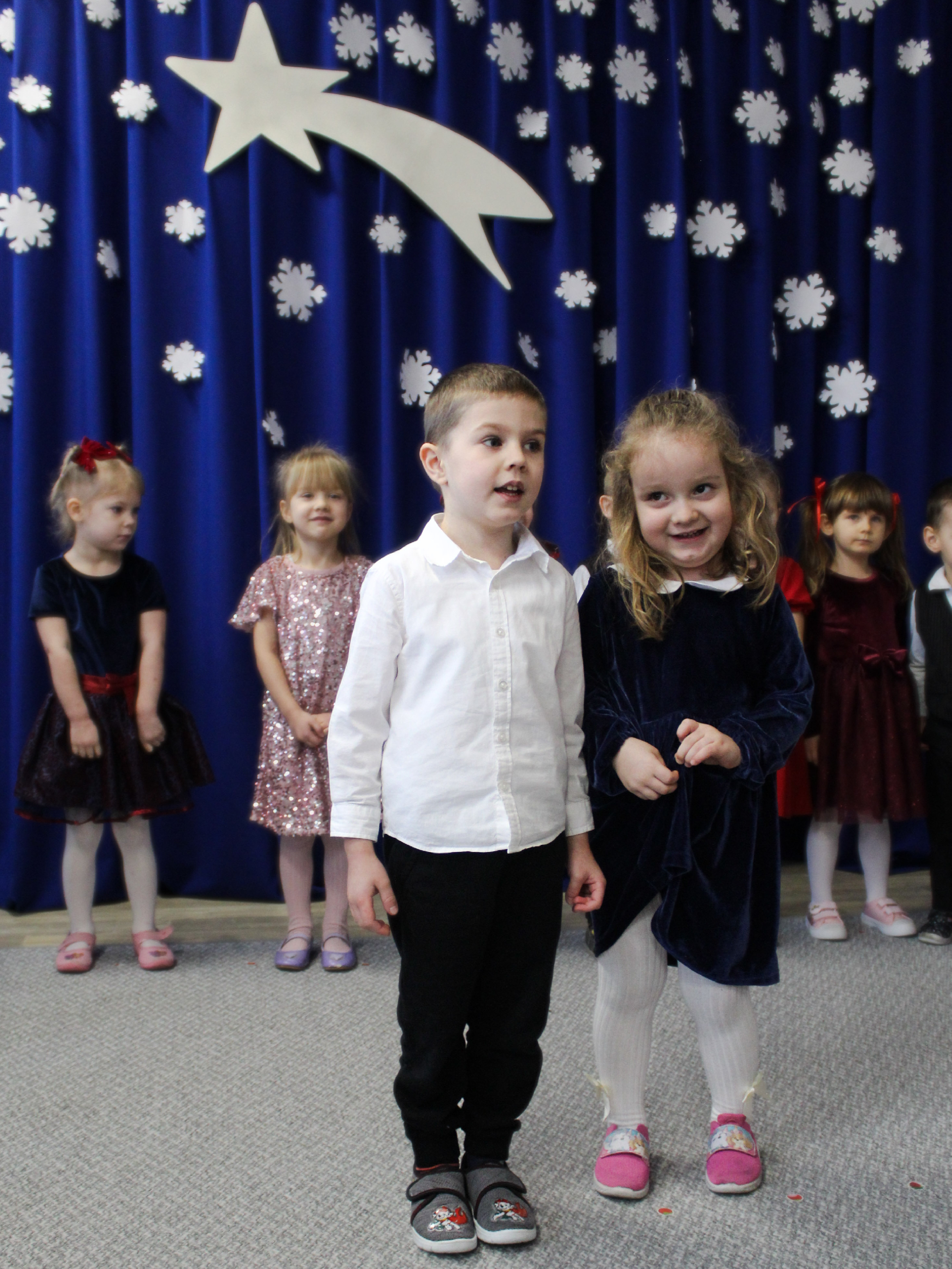 Uroczystość choinkowa w grupie Poziomki odbyła się w radosnej i ciepłej atmosferze. Dzieci zaprezentowały przygotowane wiersze, piosenki oraz tańce o tematyce świątecznej, wzbudzając wiele wzruszeń wśród zaproszonych gości. Wspólne kolędowanie oraz spotkanie z Mikołajem sprawiły dzieciom ogromną radość. Uroczystość była okazją do integracji grupy oraz wprowadzenia wszystkich w magiczny, świąteczny nastrój. 🎄