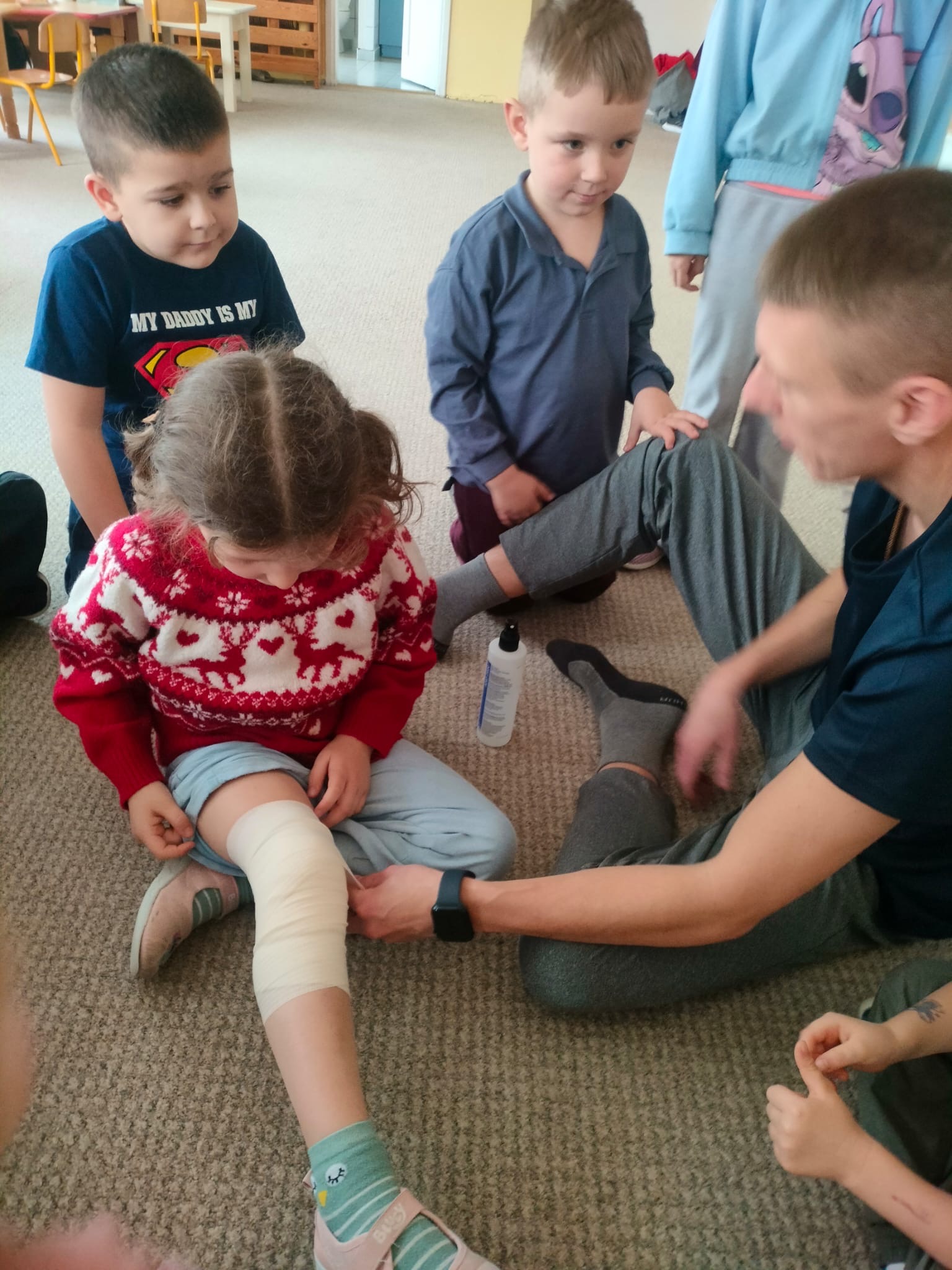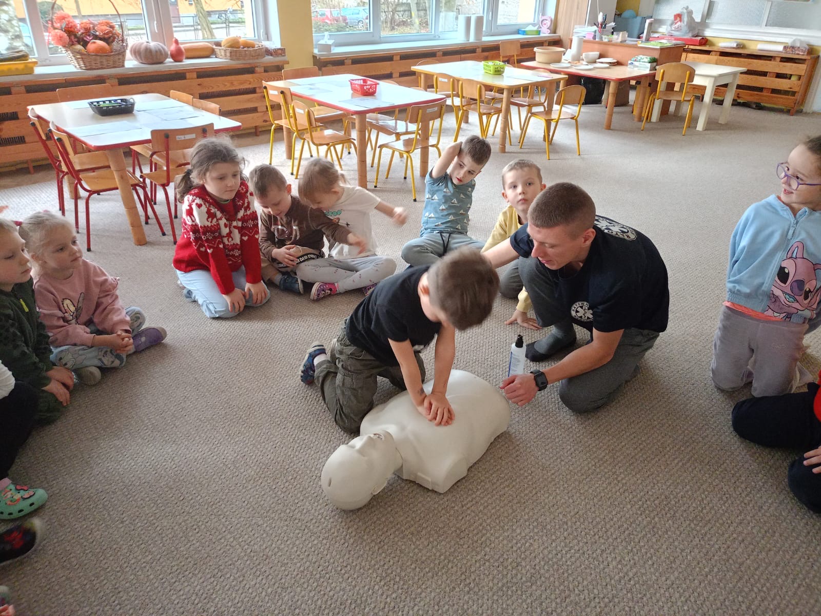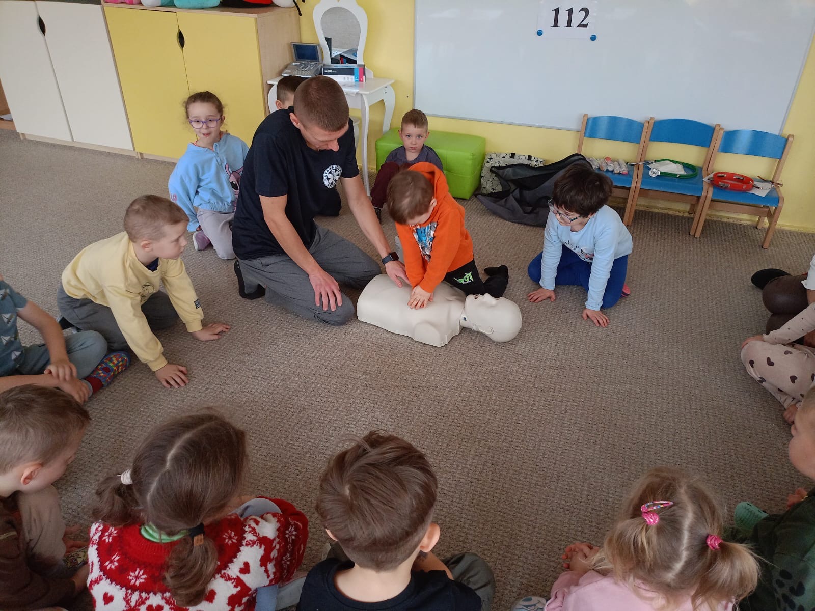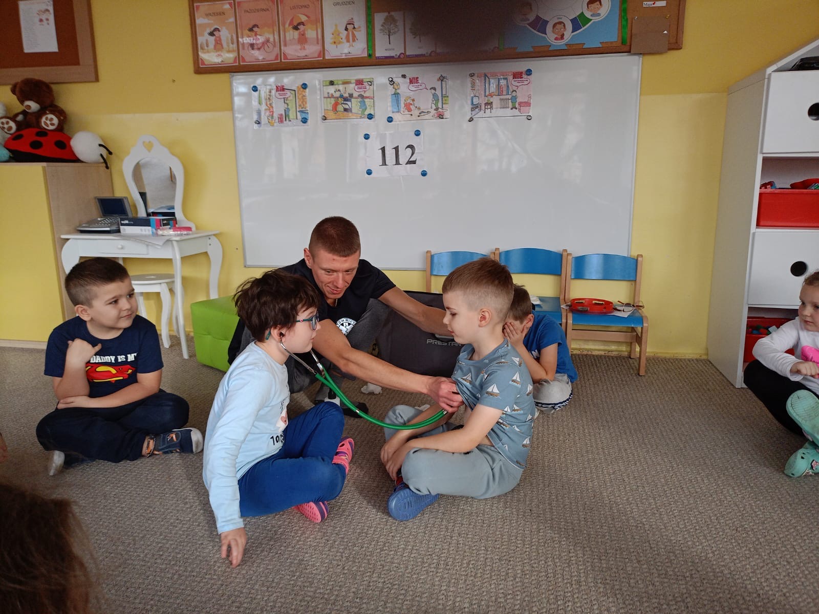W grupie Żabki mieliśmy przyjemność powitać wyjątkowego gościa - odbyła się wizyta ratownika, który opowiedział dzieciom o swojej pracy i zasadach udzielania pierwszej pomocy. Przedszkolaki z dużym zainteresowaniem uczestniczyły w spotkaniu, ucząc się, jak reagować w sytuacjach zagrożenia