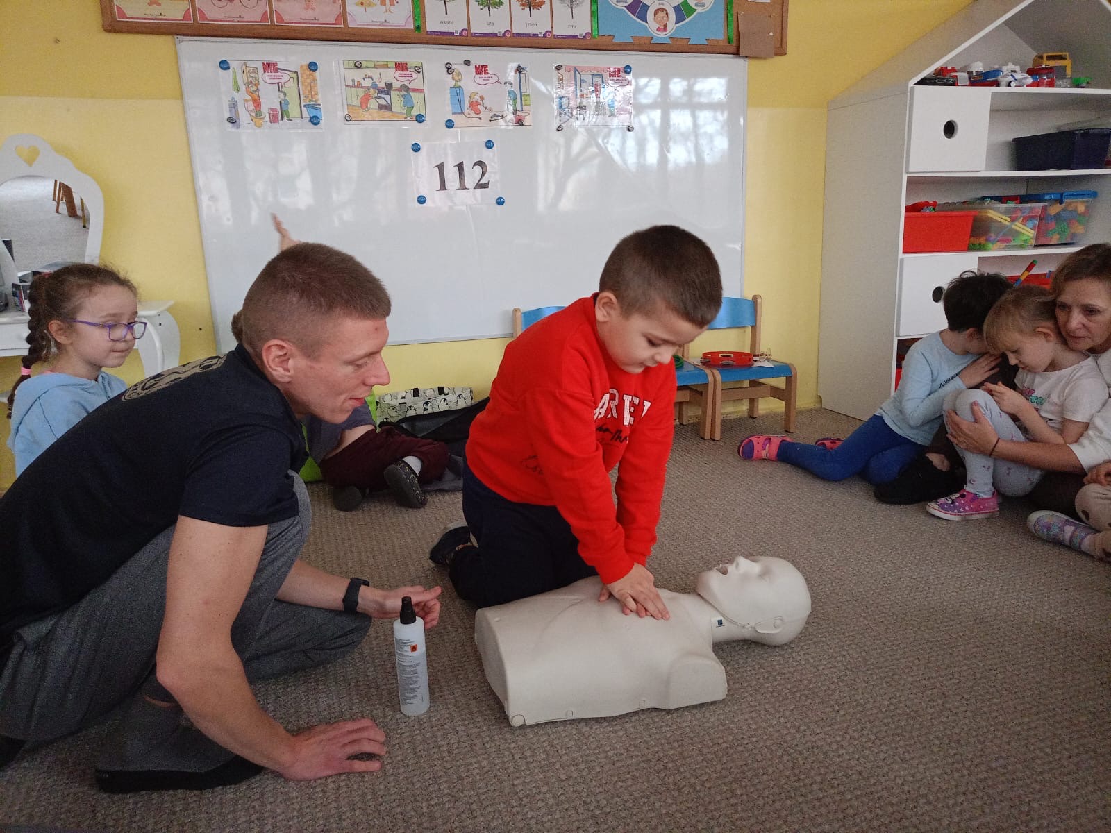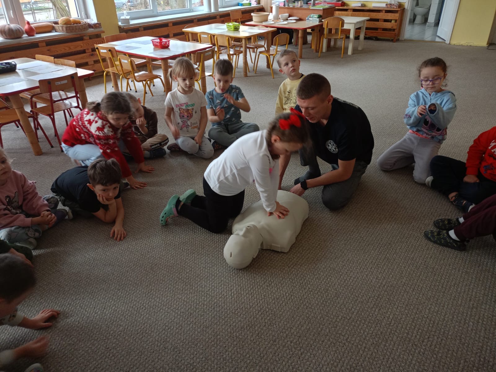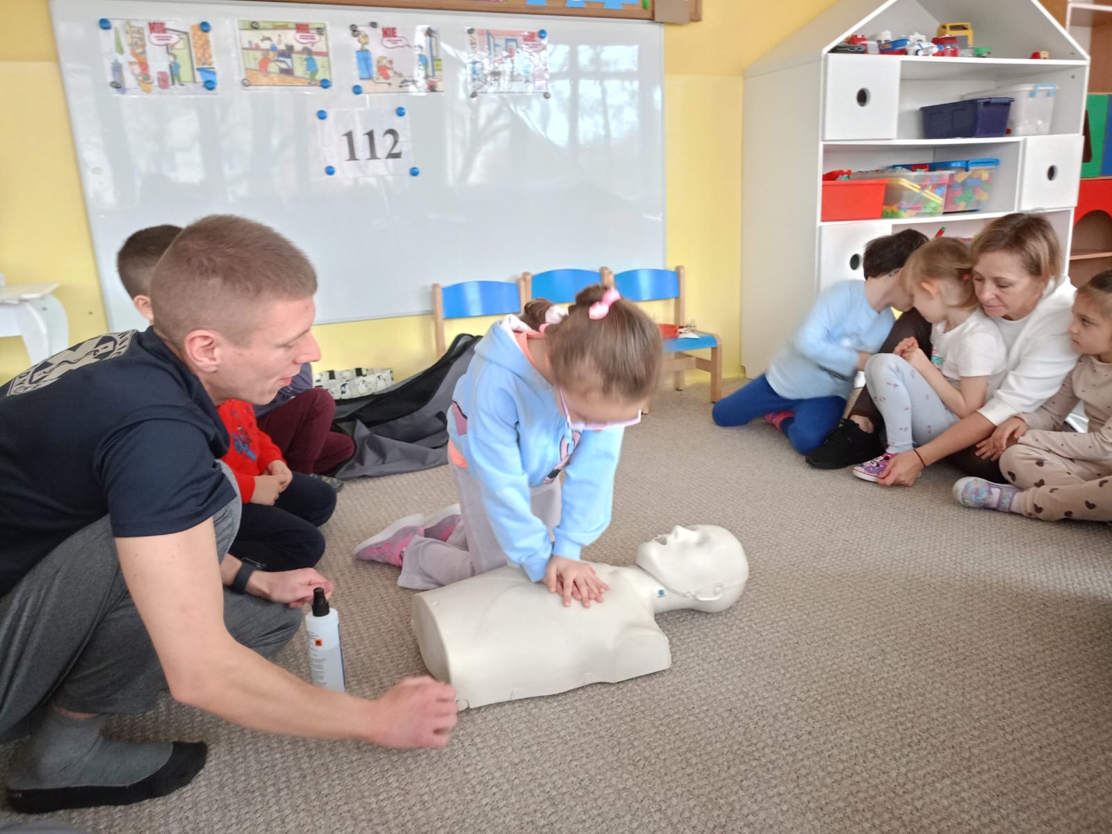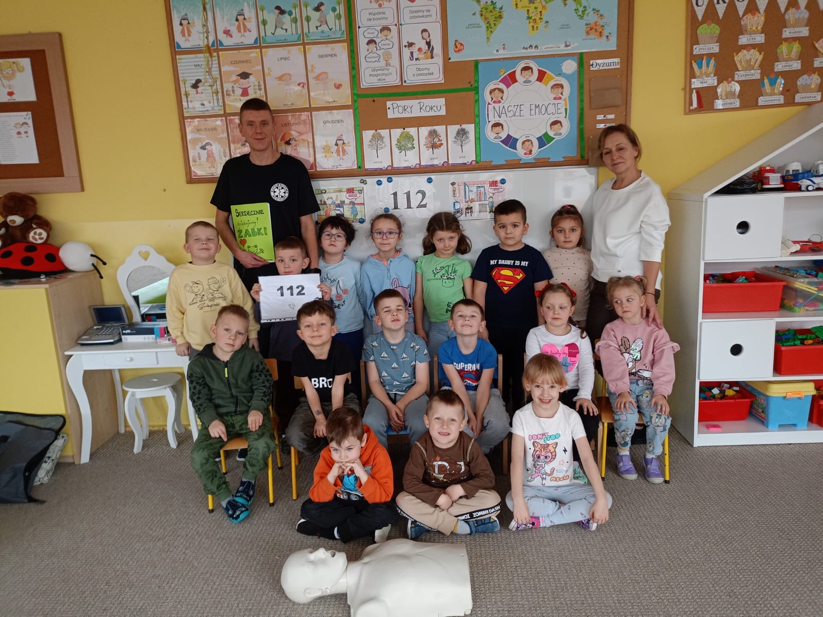W grupie Żabki mieliśmy przyjemność powitać wyjątkowego gościa - odbyła się wizyta ratownika, który opowiedział dzieciom o swojej pracy i zasadach udzielania pierwszej pomocy. Przedszkolaki z dużym zainteresowaniem uczestniczyły w spotkaniu, ucząc się, jak reagować w sytuacjach zagrożenia