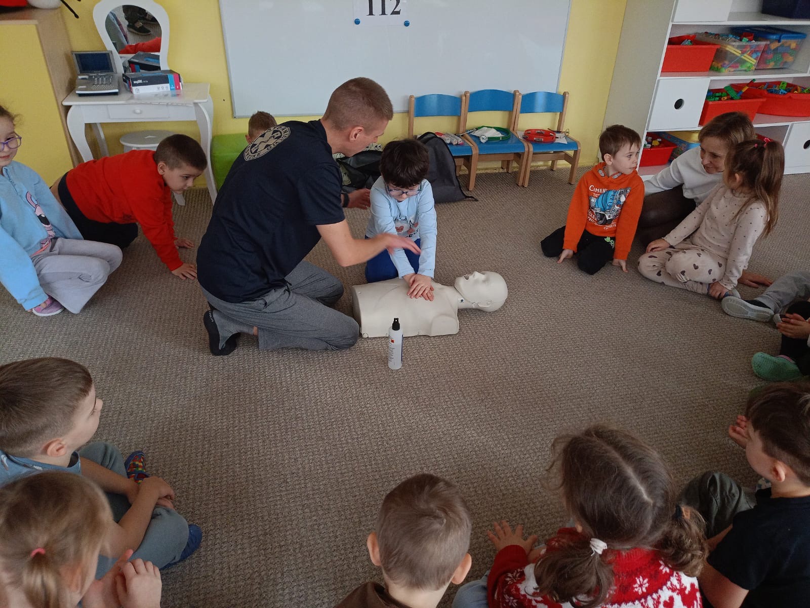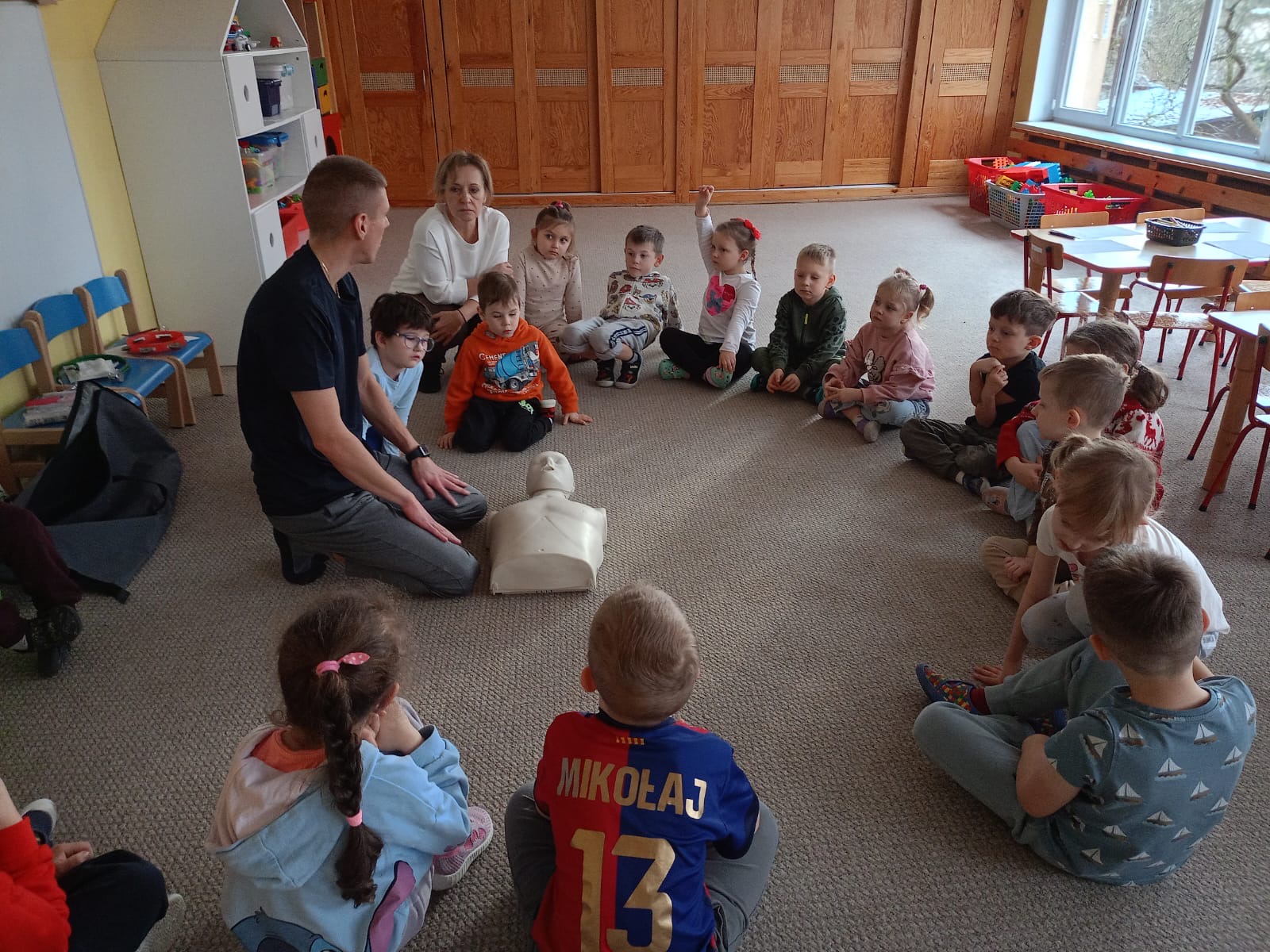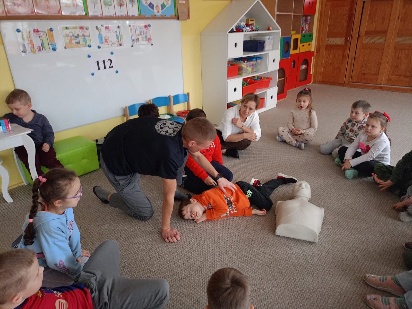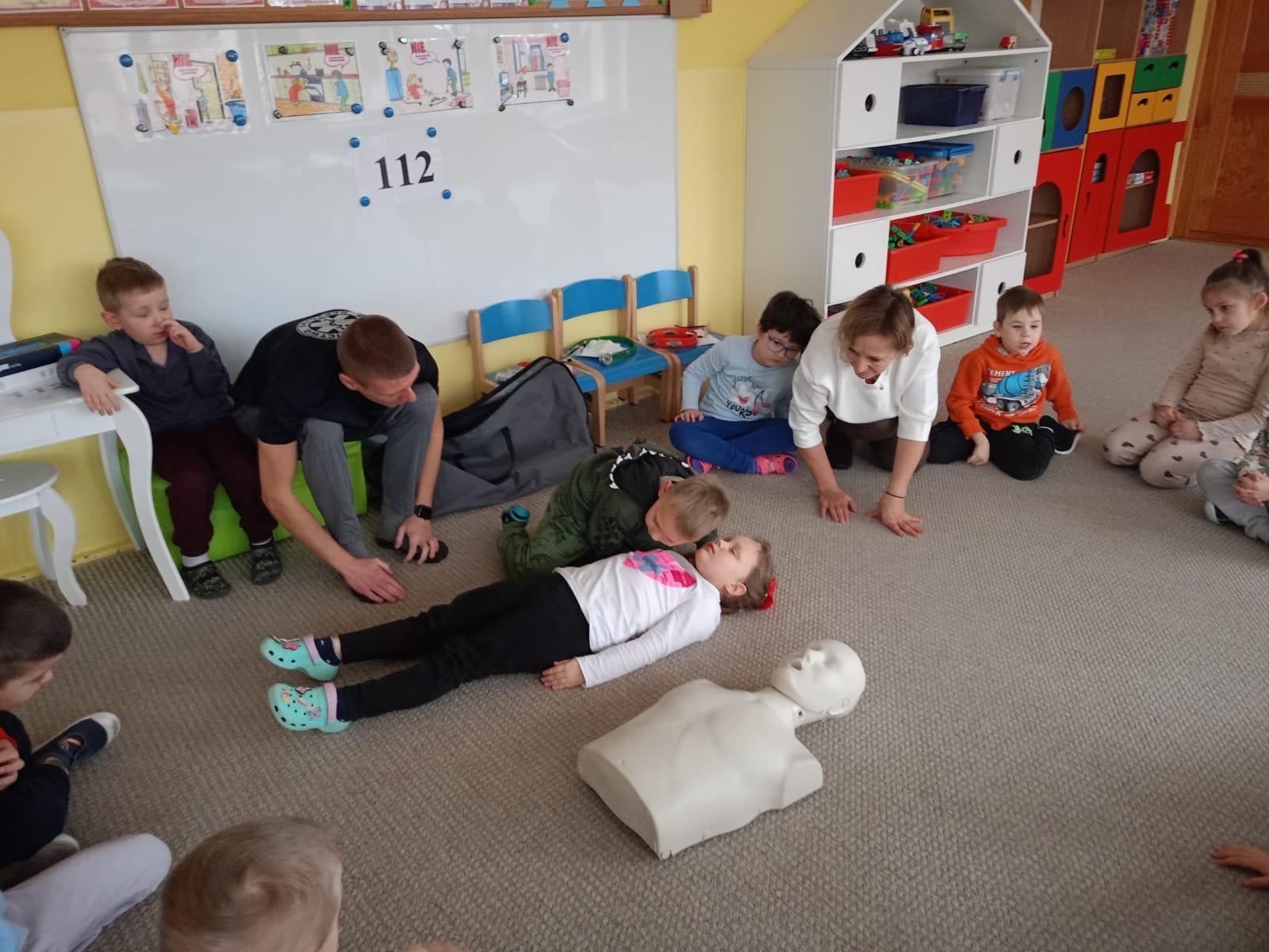 W grupie Żabki mieliśmy przyjemność powitać wyjątkowego gościa - odbyła się wizyta ratownika, który opowiedział dzieciom o swojej pracy i zasadach udzielania pierwszej pomocy. Przedszkolaki z dużym zainteresowaniem uczestniczyły w spotkaniu, ucząc się, jak reagować w sytuacjach zagrożenia