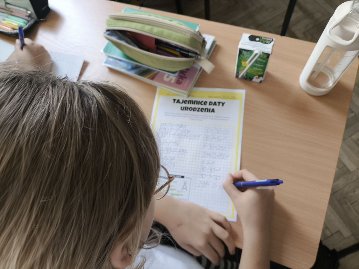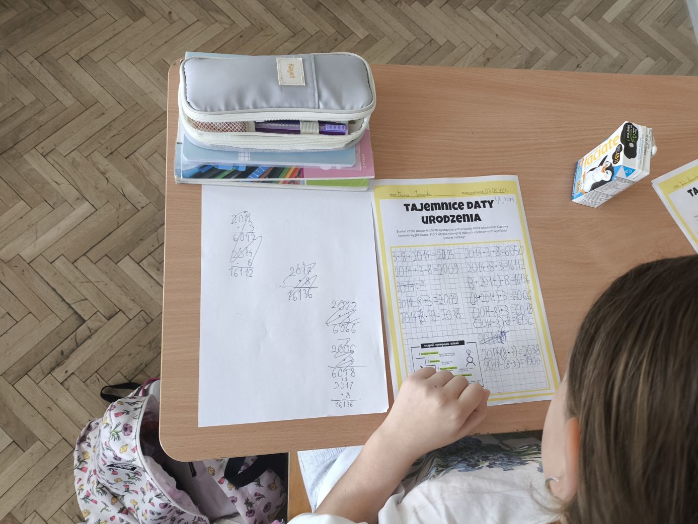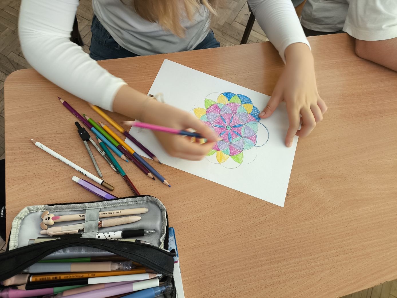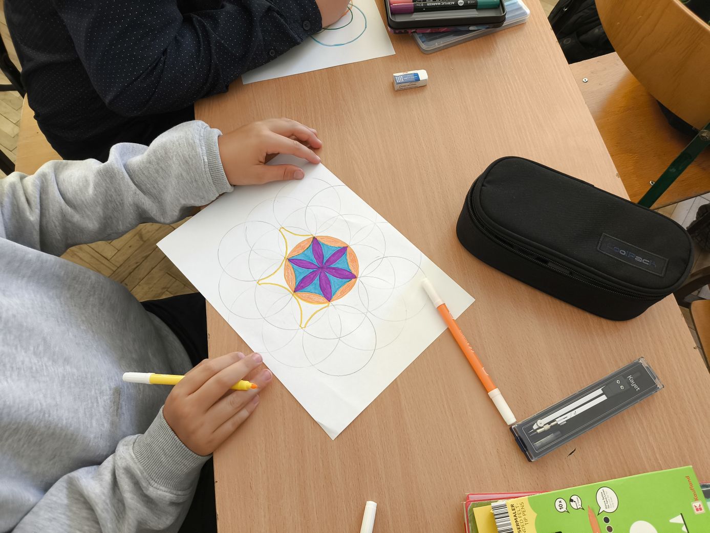 Uczniowie klasy 5a zrealizowali już dwa zadania projektowe. Z okazji Międzynarodowego Dnia Kropki wykonali mandale z wykorzystaniem cyrkla, rozwijając precyzję i wyobraźnię geometryczną. Wzięli także udział w klasowym konkursie „Tajemnica daty urodzenia”, który połączył matematykę z odkrywaniem ciekawostek o sobie.