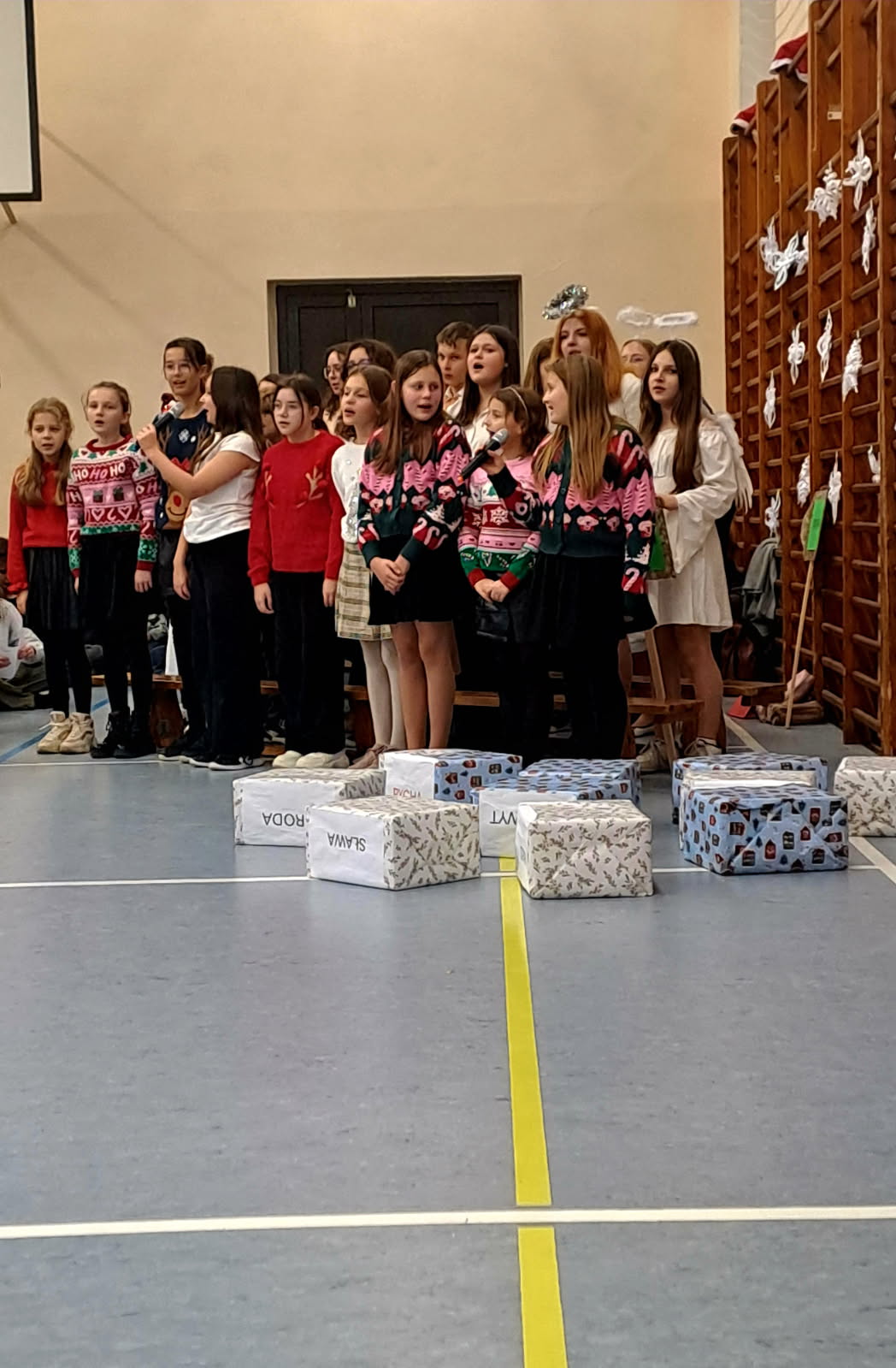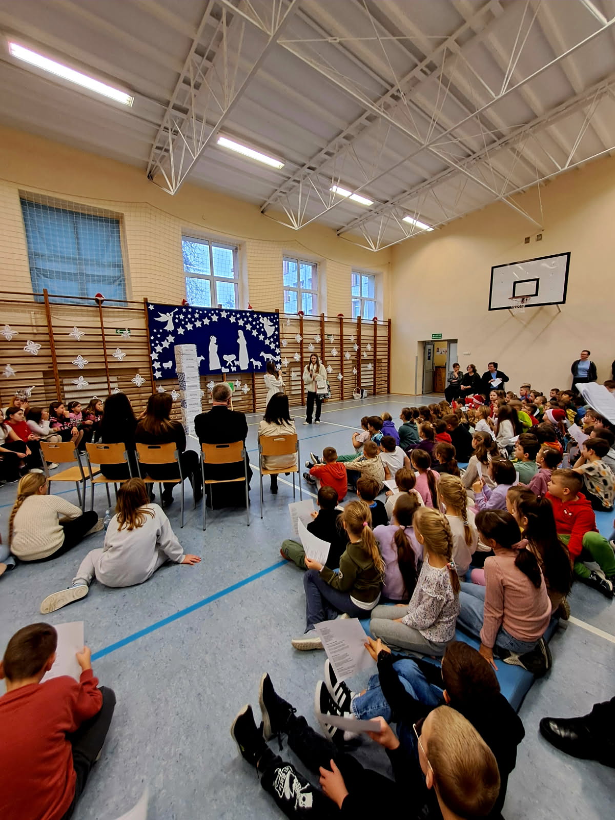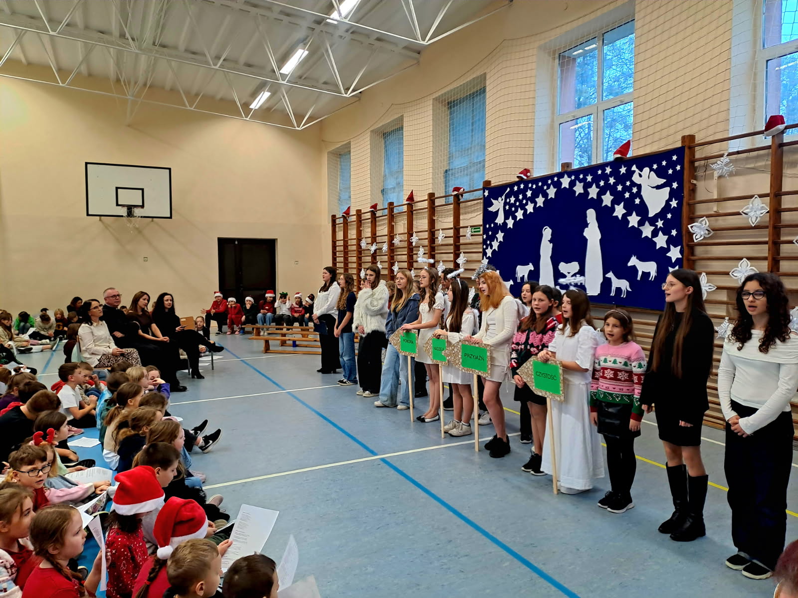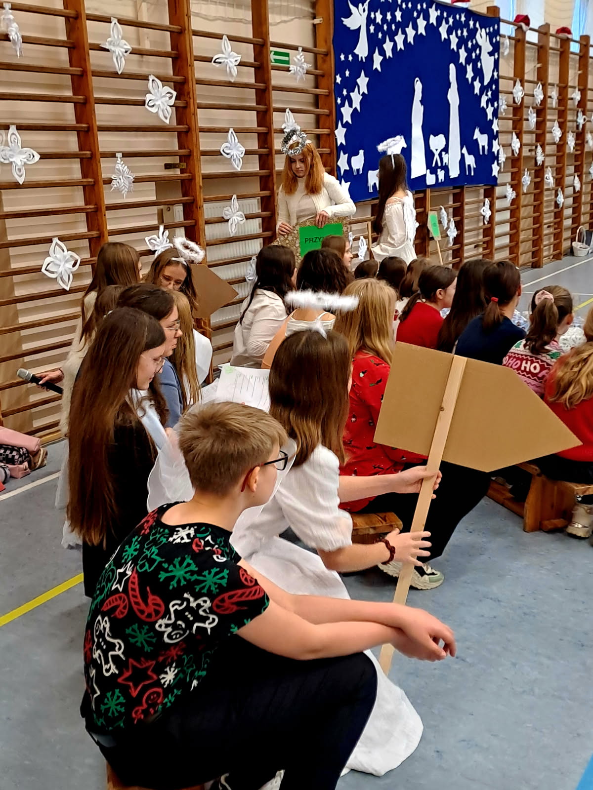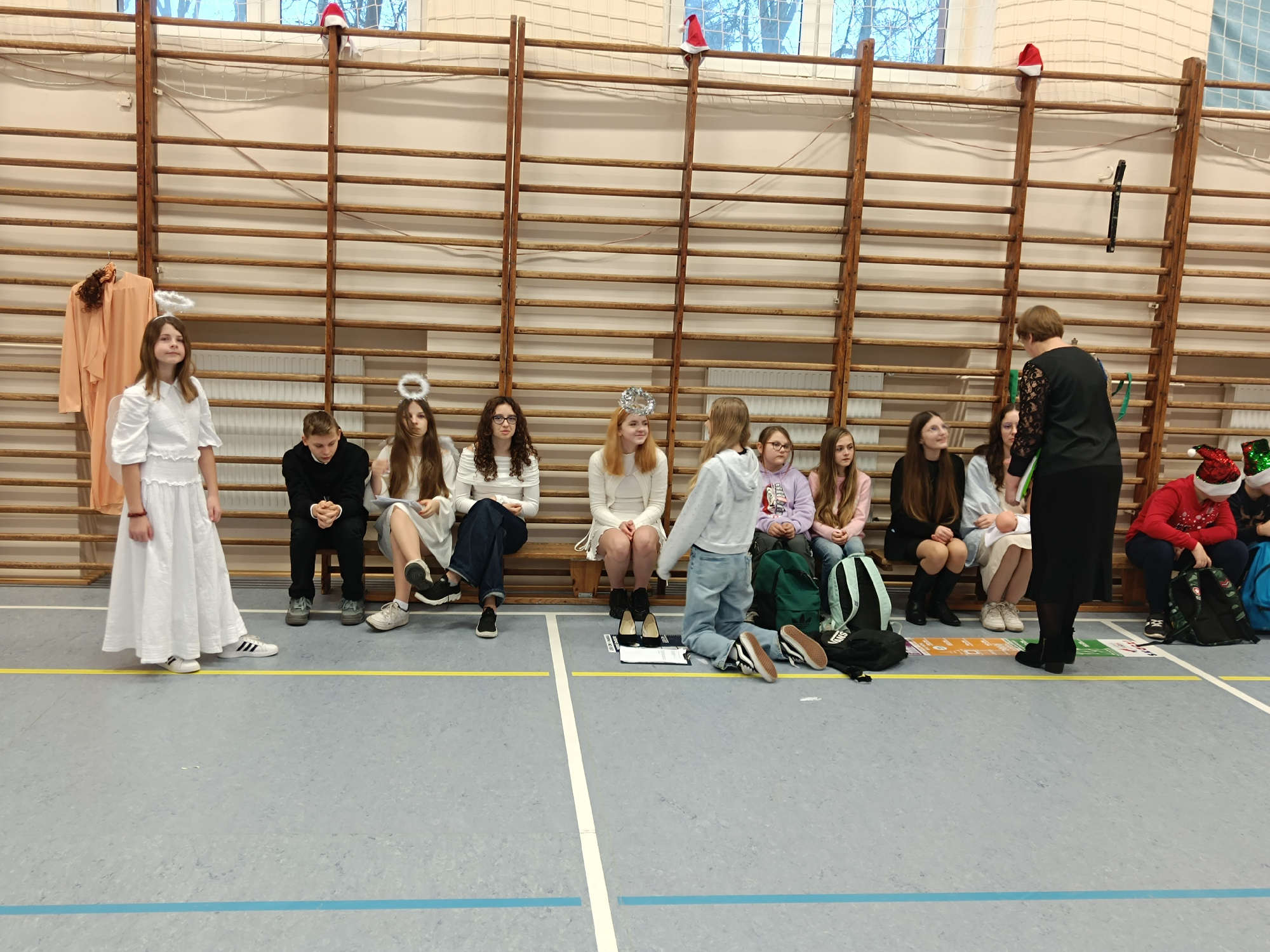 Zanim w tym czasie udamy się do kościoła by pochylić się nad nowonarodzonym dzieciątkiem Jezus, w ostatnim tygodniu nauki szkolnej mijającego roku 2025społeczność szkolna z dyrekcją szkoły p. Katarzyną Ulatowską i p. Martą Samseloraz zaproszonym gościem ks. proboszczem Andrzejem Adamczykiem spotkała się na sali gimnastycznej by obejrzeć jasełka przygotowane przez uczniów z klasy 7a, 8a i 8b ósmych wykonanych pod opieką p. Moniki Fuks i p. Marleny Zapadki. Nowoczesna wersja jasełek, dotykająca współczesnych problemów spotkała się z pozytywnym odzewem ze strony publiczności.