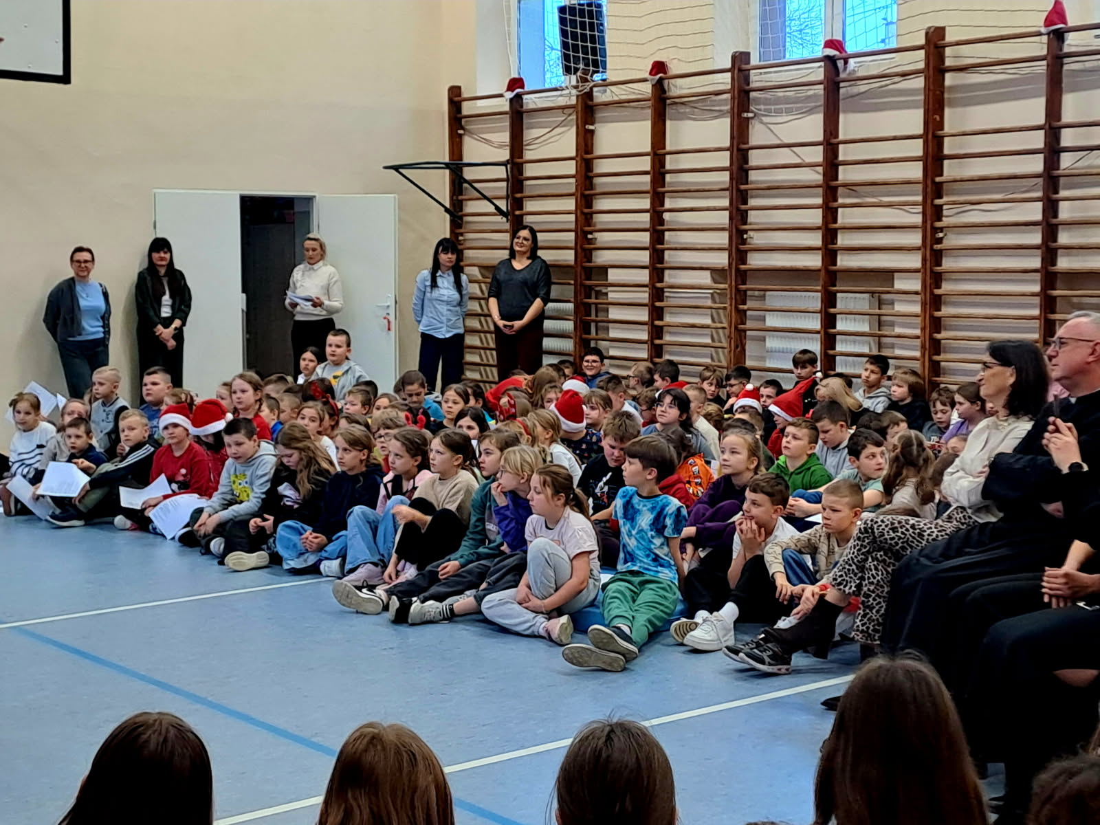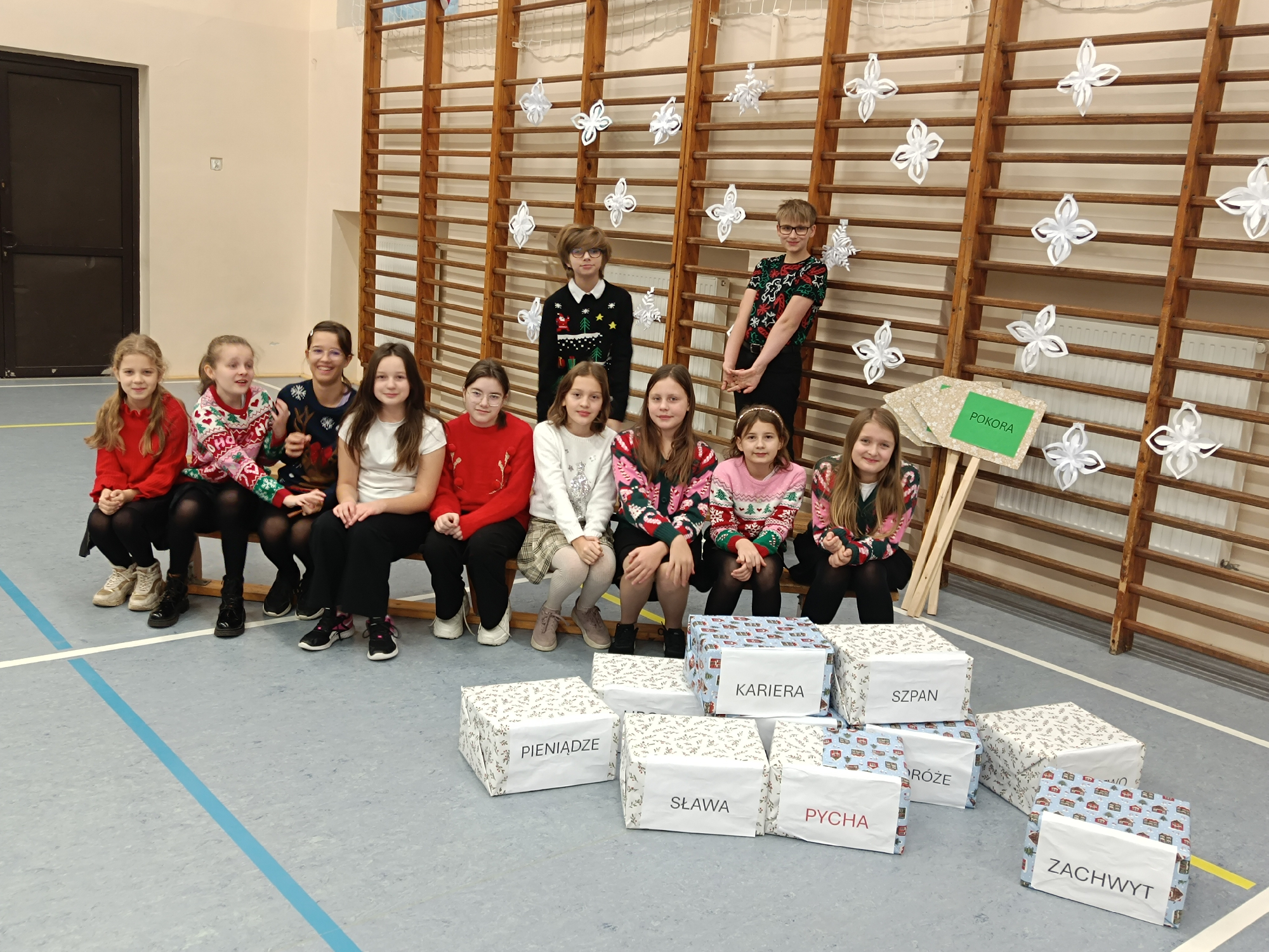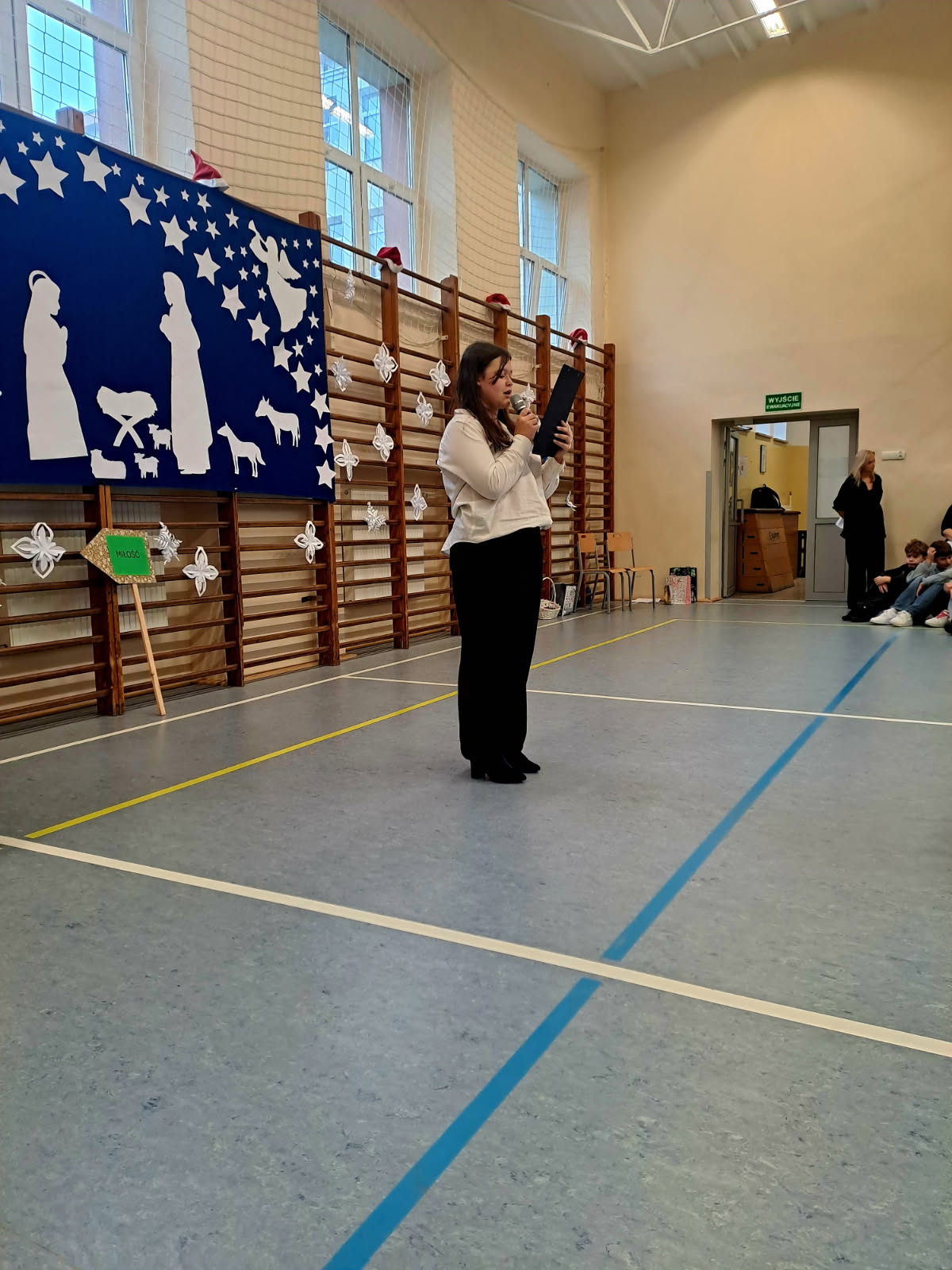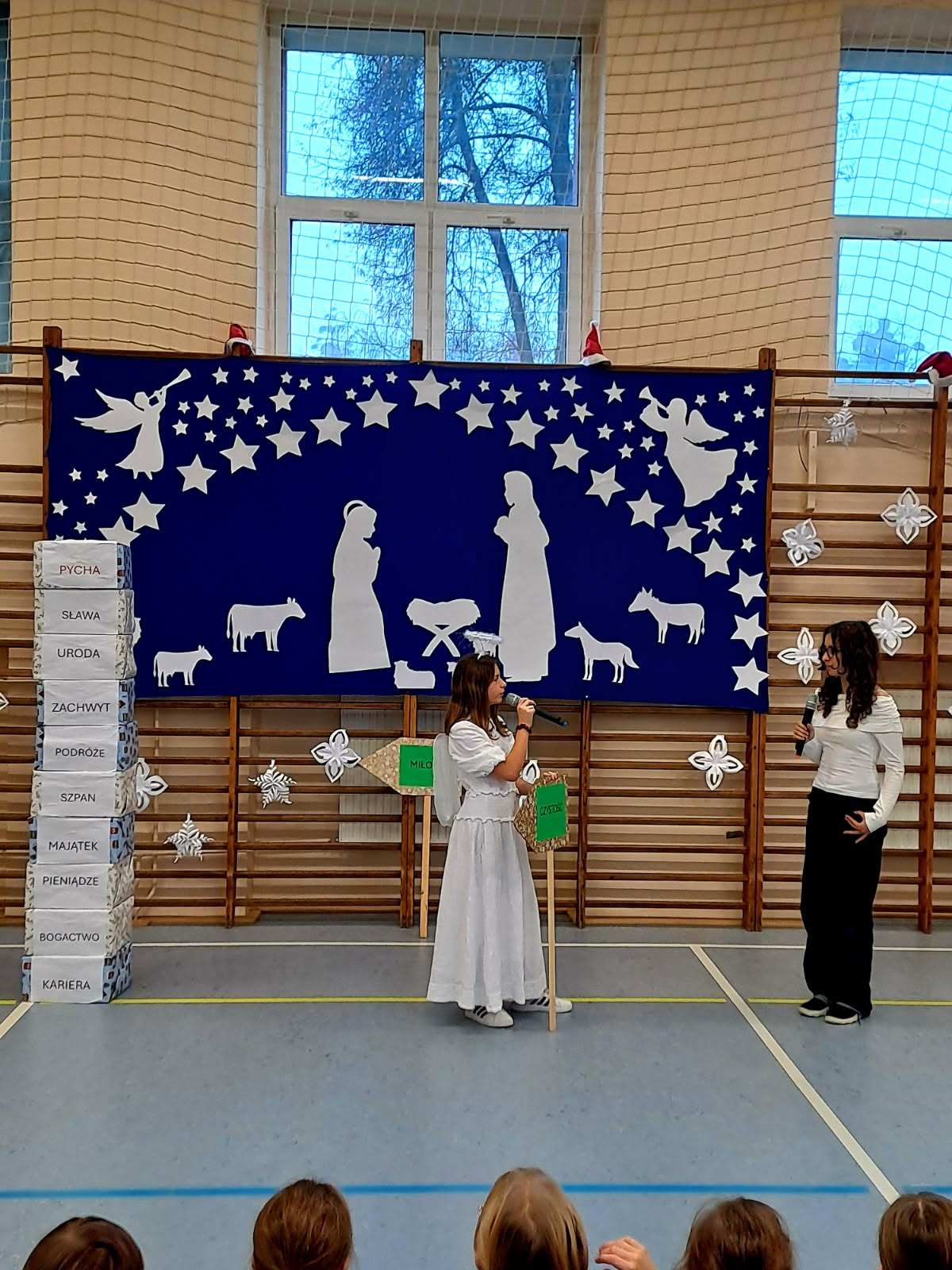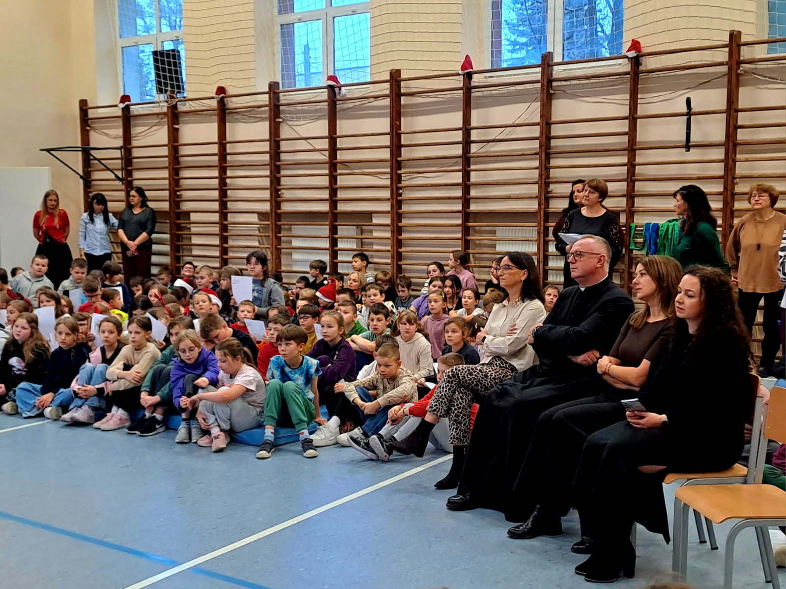 Zanim w tym czasie udamy się do kościoła by pochylić się nad nowonarodzonym dzieciątkiem Jezus, w ostatnim tygodniu nauki szkolnej mijającego roku 2025społeczność szkolna z dyrekcją szkoły p. Katarzyną Ulatowską i p. Martą Samseloraz zaproszonym gościem ks. proboszczem Andrzejem Adamczykiem spotkała się na sali gimnastycznej by obejrzeć jasełka przygotowane przez uczniów z klasy 7a, 8a i 8b ósmych wykonanych pod opieką p. Moniki Fuks i p. Marleny Zapadki. Nowoczesna wersja jasełek, dotykająca współczesnych problemów spotkała się z pozytywnym odzewem ze strony publiczności.