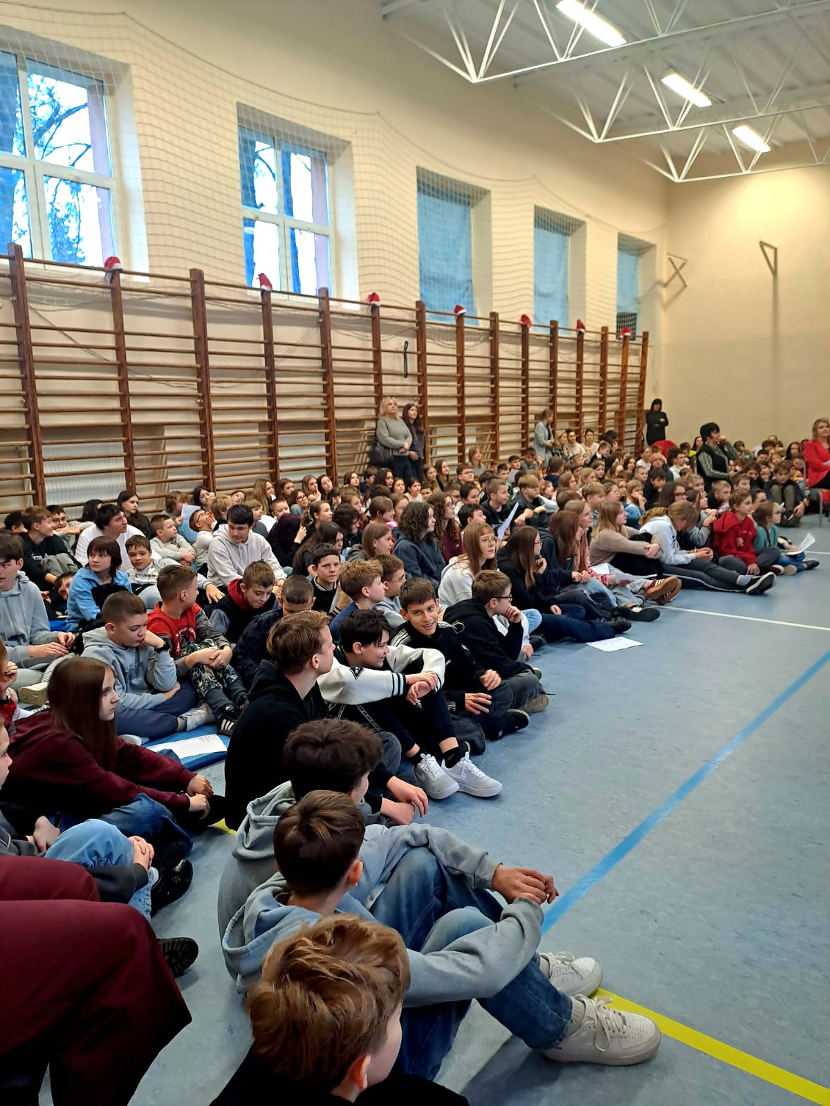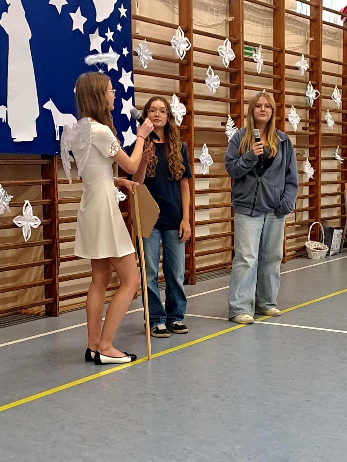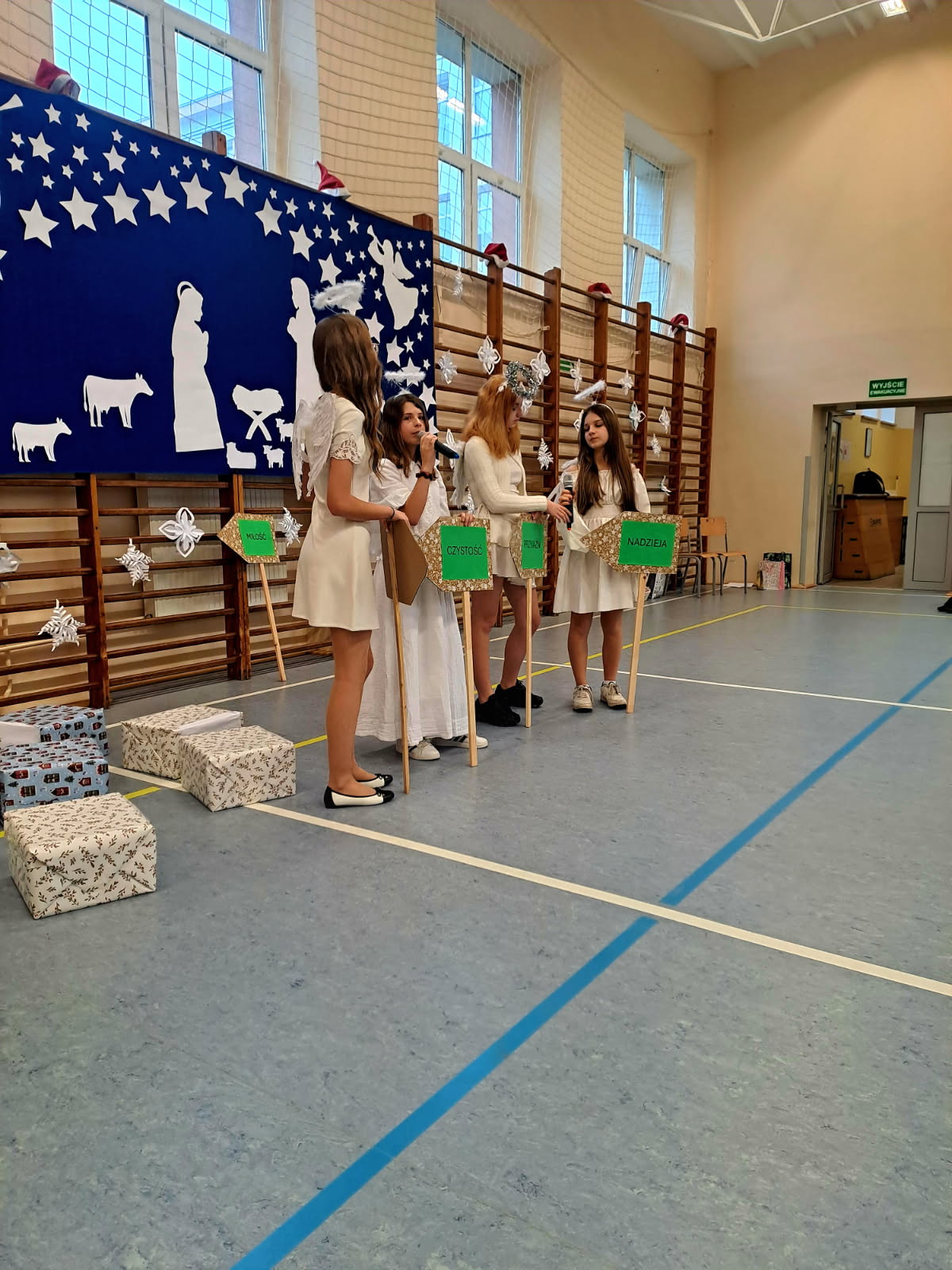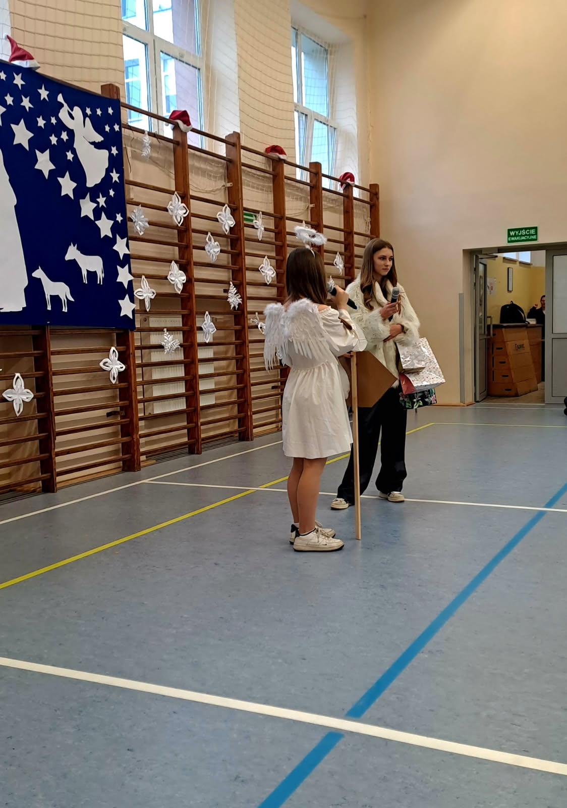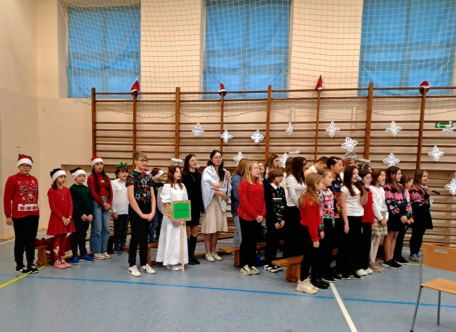 Zanim w tym czasie udamy się do kościoła by pochylić się nad nowonarodzonym dzieciątkiem Jezus, w ostatnim tygodniu nauki szkolnej mijającego roku 2025społeczność szkolna z dyrekcją szkoły p. Katarzyną Ulatowską i p. Martą Samseloraz zaproszonym gościem ks. proboszczem Andrzejem Adamczykiem spotkała się na sali gimnastycznej by obejrzeć jasełka przygotowane przez uczniów z klasy 7a, 8a i 8b ósmych wykonanych pod opieką p. Moniki Fuks i p. Marleny Zapadki. Nowoczesna wersja jasełek, dotykająca współczesnych problemów spotkała się z pozytywnym odzewem ze strony publiczności.