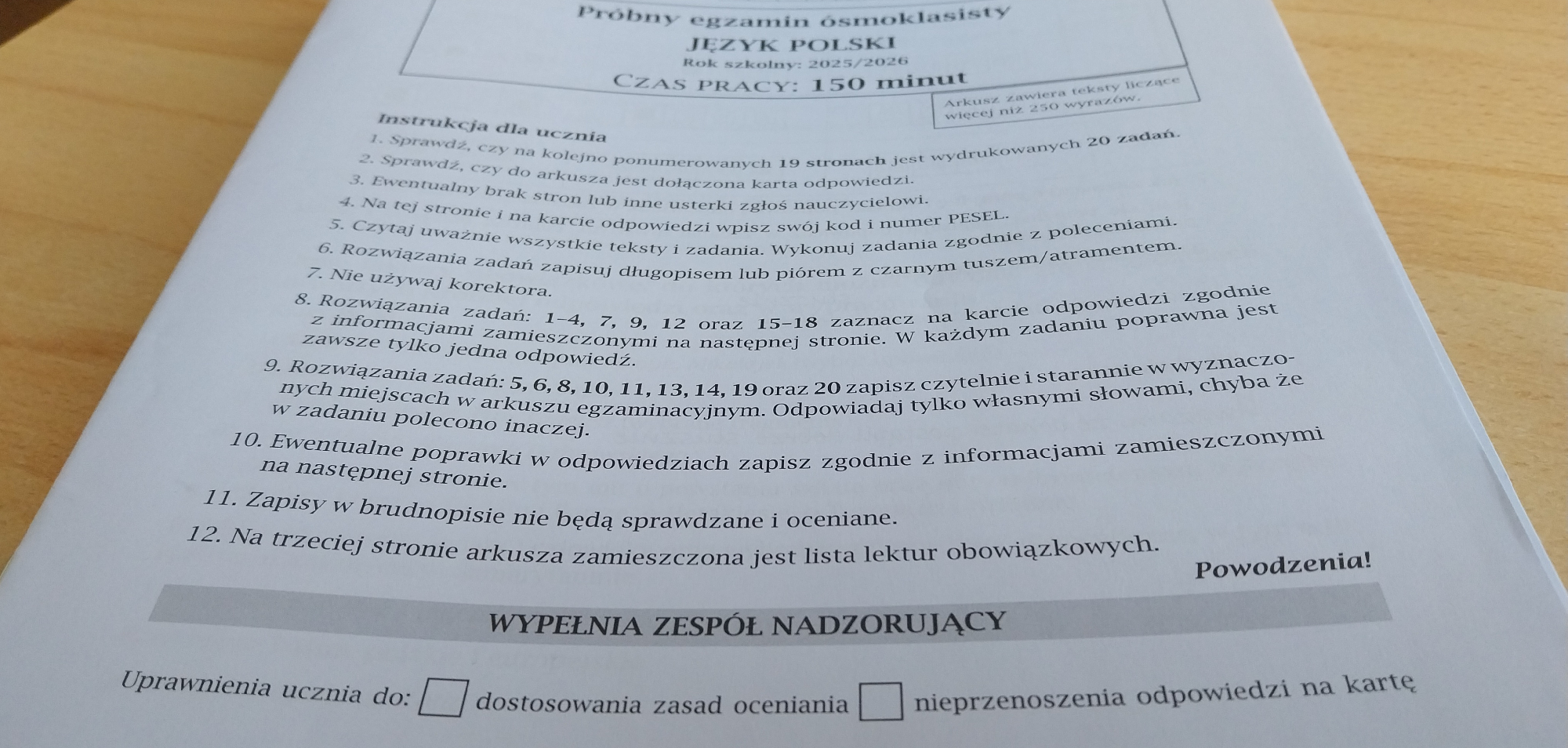 Dla uczniów klas ósmych była to kolejna w tym roku szkolnym próba przed majowym egzaminem. Zgodnie z obowiązującymi procedurami piszący mieli 150 minut na pracę z arkuszem polonistycznym, 125 minut – z matematycznym i 110 minut na rozwiązanie zadań z języka angielskiego. Część uczniów „Dwójki” mogła skorzystać z dodatkowego wydłużenia czasu pracy. Od poniedziałku do środy (2-3 marca) egzaminy próbne pisali także siódmoklasiści. Tu stres był prawdopodobnie większy, ponieważ dla tego grona uczniów była to pierwsze poważne spotkanie z tą formą sprawdzania wiedzy i umiejętności.