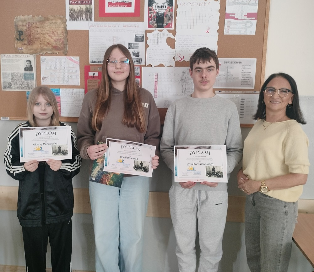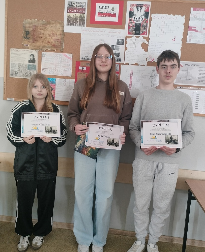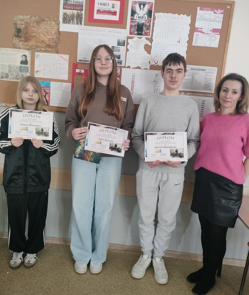 W marcu, jak co roku w naszej szkole zorganizowaliśmy konkurs dla upamiętnienia Narodowego Dnia Pamięci Żołnierzy Wyklętych. Tym razem chętni uczniowie klas ósmych mieli zadanie ułożyć krzyżówkę związaną z tematyką żołnierzy niezłomnych. Spośród dwudziestu prac nagrodzono trzy. Pierwsze miejsce zdobyła Oliwia Domurad z kl. VIII c, drugie Oksana Manowska z kl. VIII d oraz Igor Kordalewski z kl. VIII b. Wszystkim uczestnikom gratulujemy zaangażowania i kreatywności w tworzeniu prac.