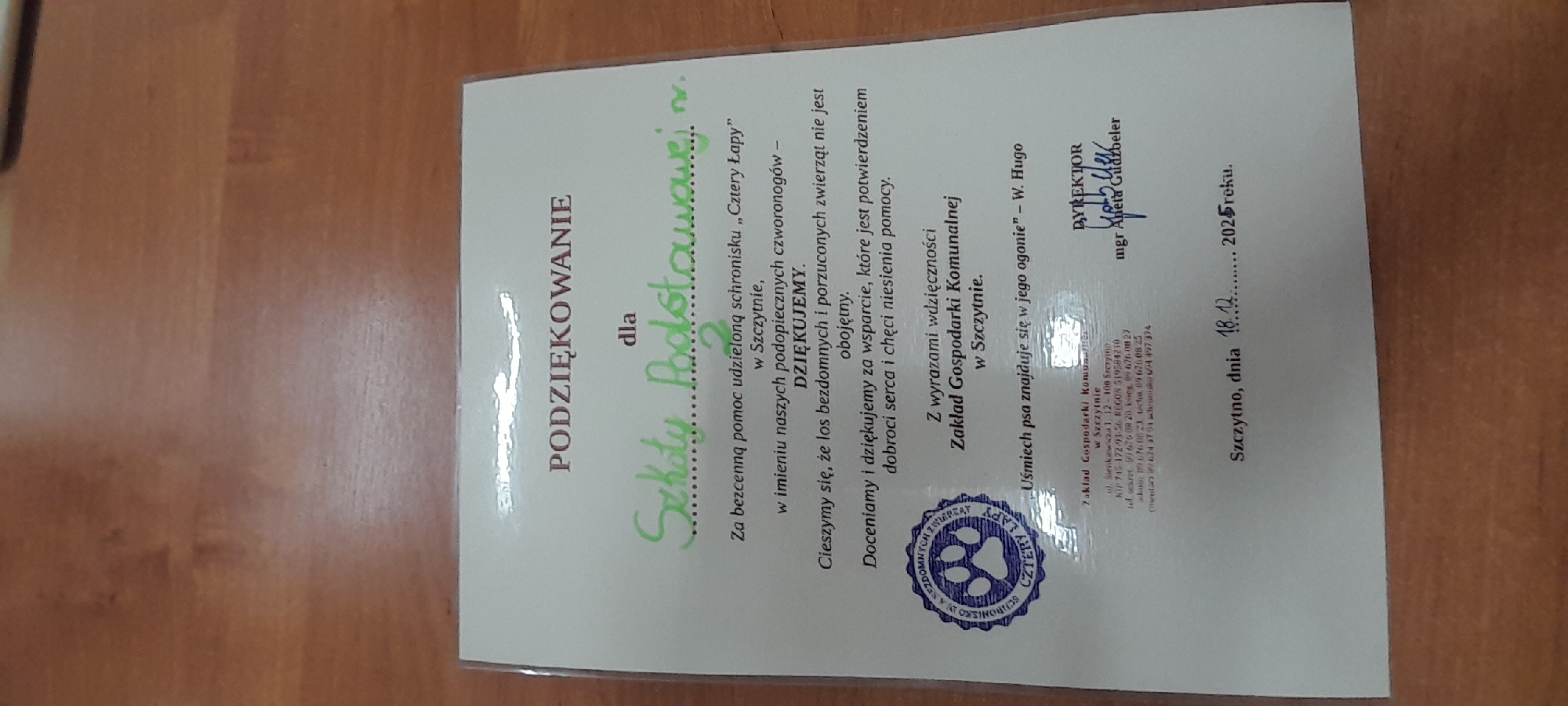 Już wcześniej, 21 listopada, uczniowie klas 5a i 8d wraz z rodzicami oraz wychowawcami zorganizowali kiermasz ciast, z którego dochód został przeznaczony na wsparcie schroniska „Cztery Łapy”. Za zebrane środki zakupiono karmę dla psów i kotów. Następnie, 19 grudnia, uczniowie obu klas wraz z wychowawcami odwiedzili schronisko, aby osobiście przekazać zakupione produkty. Dodatkowo młodzież indywidualnie wsparła podopiecznych, przynosząc karmę i koce.