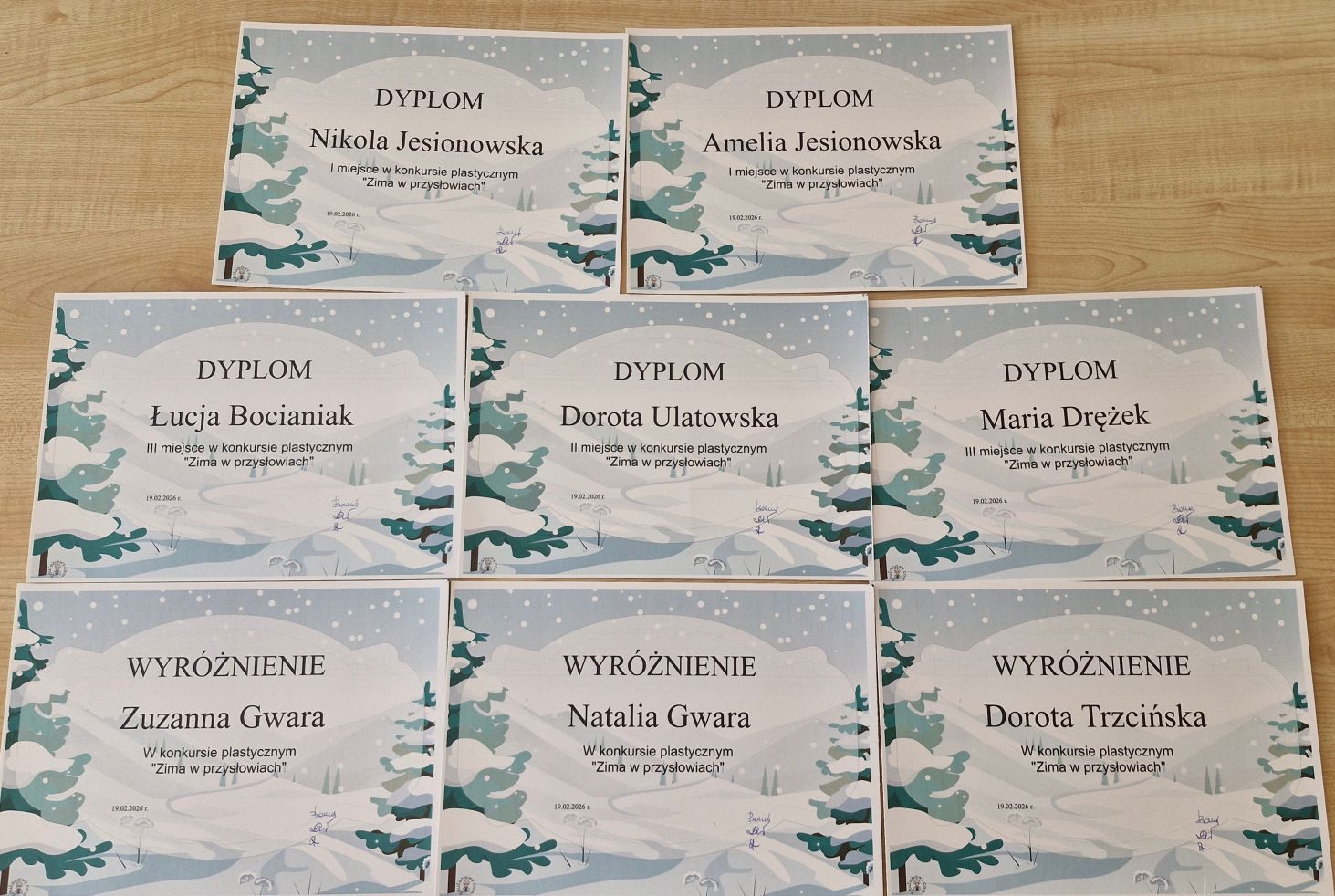 Uczniowie wykonywali techniką dowolną ilustracje plastyczne do wybranego przysłowia o zimie. Zwycięzcy konkursu otrzymali dyplomy i upominki.