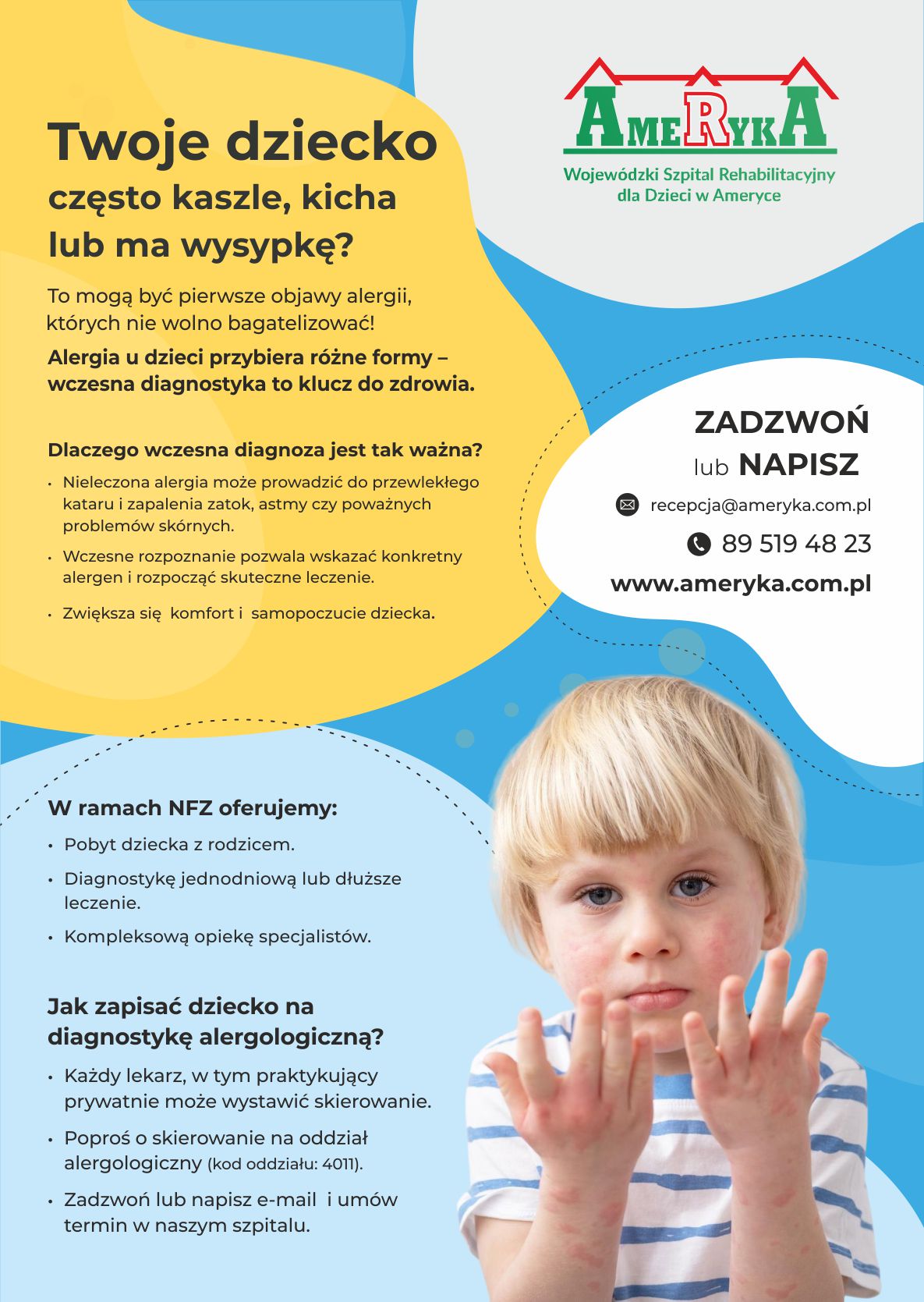 Szanowni Państwo, Drodzy Rodzice informujemy o możliwości przeprowadzenia pełnej diagnostyki i podjęcia leczenia alergii u dzieci i młodzieży w Wojewódzkim Szpitalu Rehabilitacyjnym dla Dzieci w Ameryce.