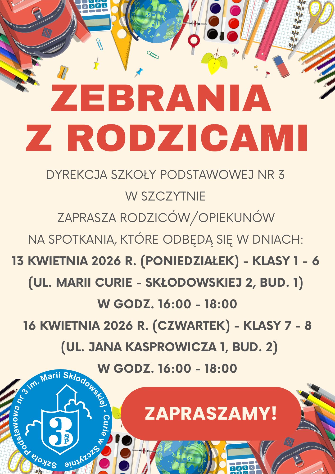 W dniach 13 i 16 kwietnia 2026 r. w godzinach 16.00 - 18.00 zapraszamy na spotkania z wychowawcami klas 1 - 8.