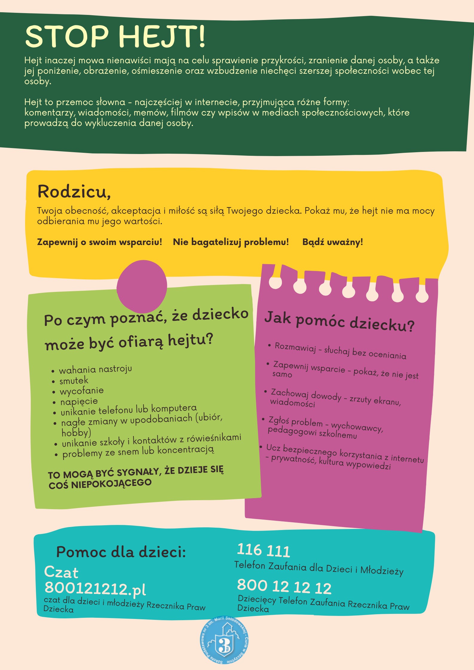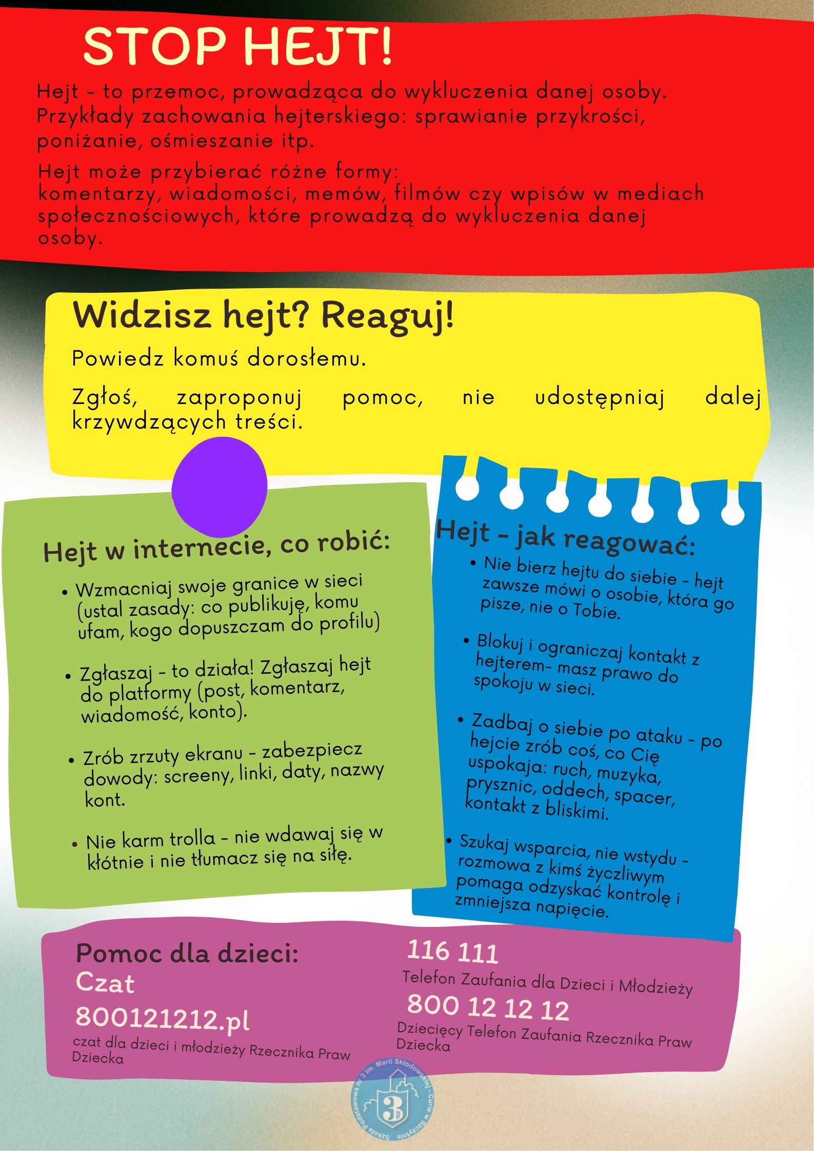 Na korytarzach naszej szkoły pojawiły się plakaty wyrażające sprzeciw wobec hejtu i mowy nienawiści. Inicjatywa ta skierowana jest zarówno do uczniów, jak i do rodziców.