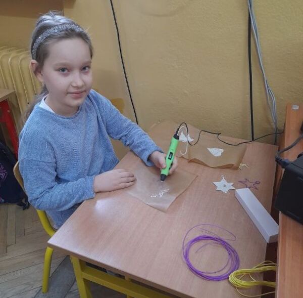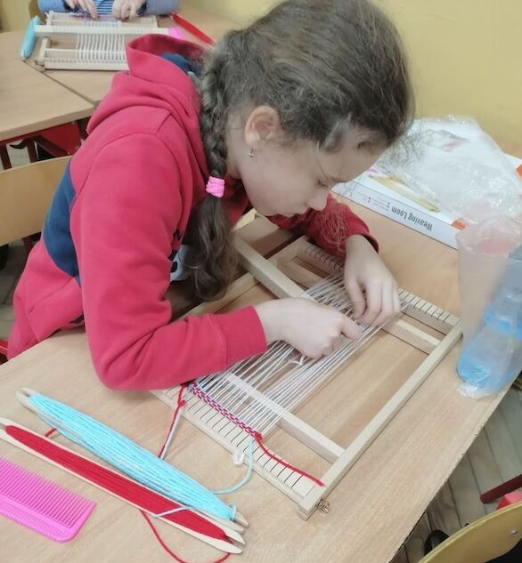 Uczennice klasy III d w ramach zajęć „Laboratoria Przyszłości” zdecydowały wykorzystać mini – warsztat tkacki do realizacji swoich pomysłów. Część postanowiła utkać zakładkę do książki, bransoletkę ewentualnie dywanik do pokoju dla lalek. W ramach zajęć nie tylko uczymy się nowych umiejętności, ale również bogacimy słownictwo.” Wątek i osnowa i zakładka gotowa” – łatwo powiedzieć – trudniej wykonać. Nie każdy bowiem wie, że tkactwo to żmudna, wymagająca cierpliwości i skupienia praca. Ale dzięki zaangażowaniu dziewcząt, mimo trudnych początków, widać efekty pracy.