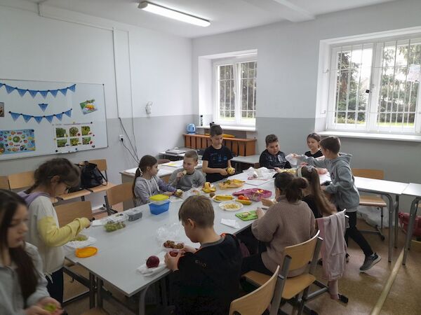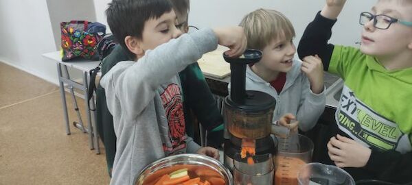 Luty to miesiąc, w którym warto zadbać o zdrowie i energię na wiosnę. Uczniowie chętnie podjęli temat zdrowego odżywiania się. Zaczęliśmy od kolorowych i bogatych w witaminy soków warzywno-owocowych i surówki. Niektórzy po raz pierwszy mogli samodzielnie wykonać i spróbować „owoców” swojej pracy. Na kolejnych zajęciach pod hasłem „wesołe kanapki” przygotowali własnoręcznie wiosenny twarożek, który zajadali z ogromnym apetytem. Największą jednak atrakcją okazały się gofry! Ileż było ekscytacji przed zajęciami! Dzięki sprzętowi kupionemu przez szkołę w ramach programu "Laboratoria Przyszłości" w sali mieliśmy do dyspozycji robota kuchennego do wykonania surówki, sokowirówkę i oczywiście miksery i gofrownice! Uczniowie mieli niesamowitą okazję w sposób zorganizowany i bezpieczny poznać zasady korzystania z urządzeń technicznych oraz ręcznego sprzętu kuchennego.