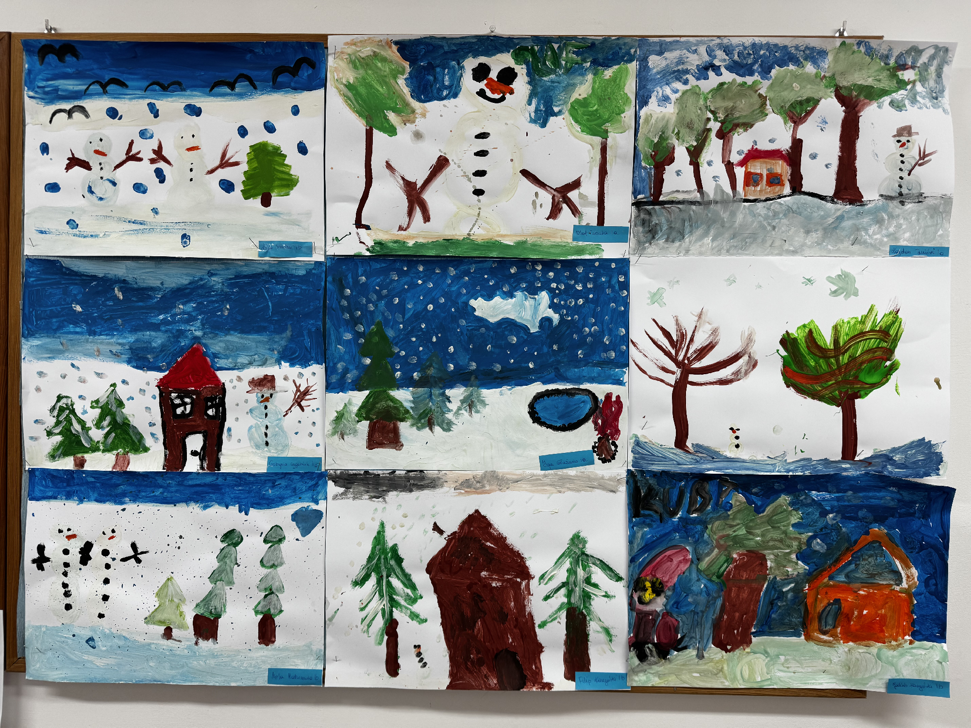 Dzieci stworzyły zimowy pejzaż, wykorzystując farby plakatowe. Na ich pracach pojawiają się ośnieżone drzewa, płatki śniegu i jasne zimowe niebo. Prace są pełne bieli, błękitu oraz blasku zimowego mrozu.