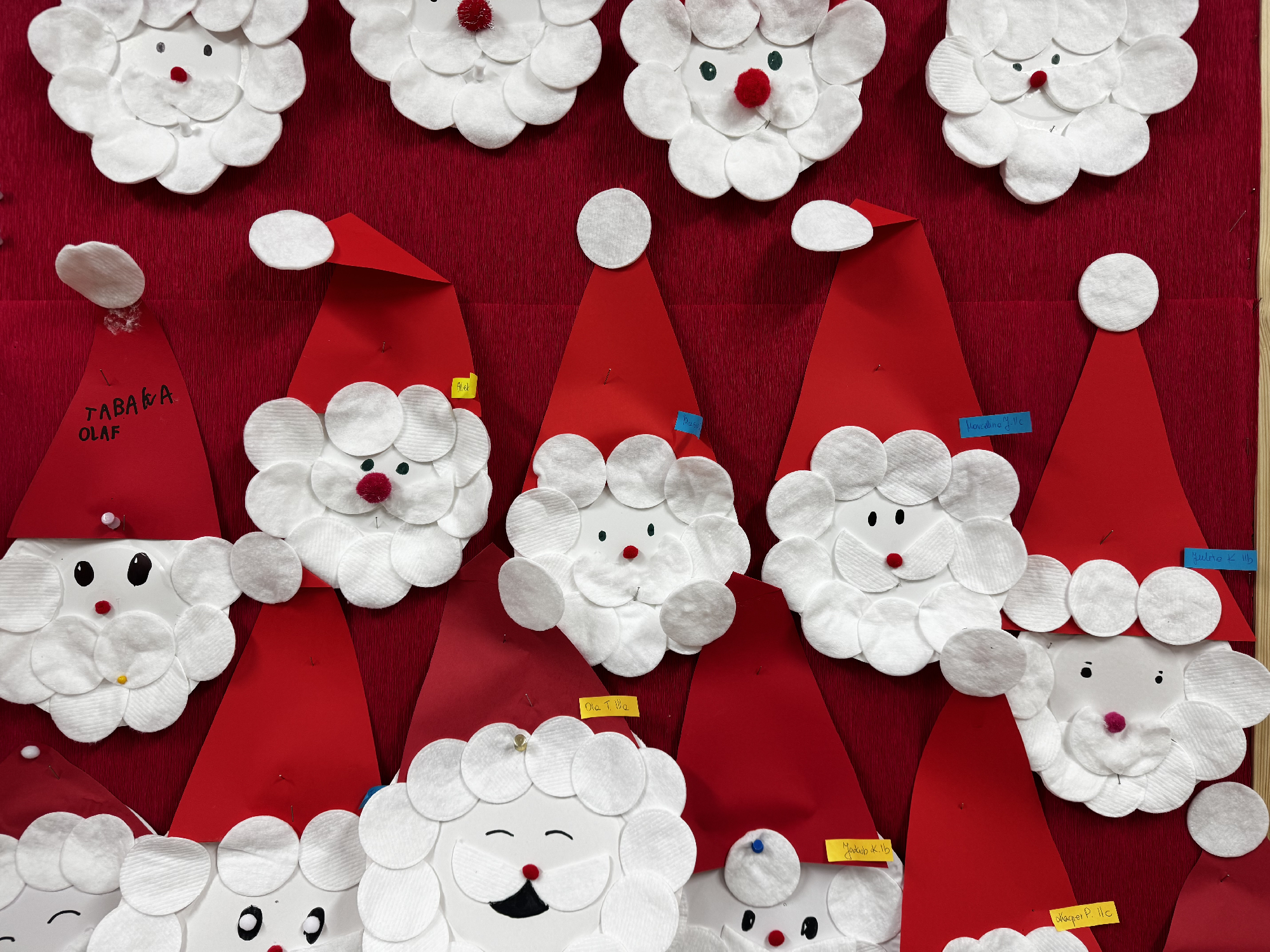 Do wykonania Mikołajów dzieci użyły papieru kolorowego i płatków kosmetycznych. Praca jest prosta, miękka w dotyku i ma świąteczny charakter.