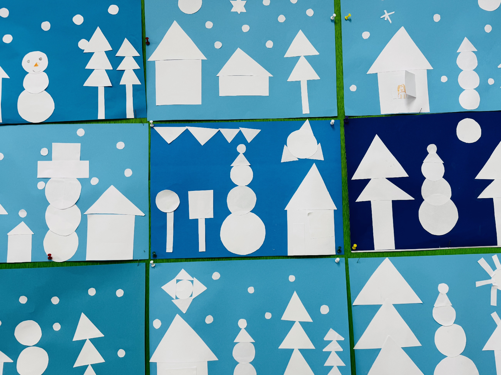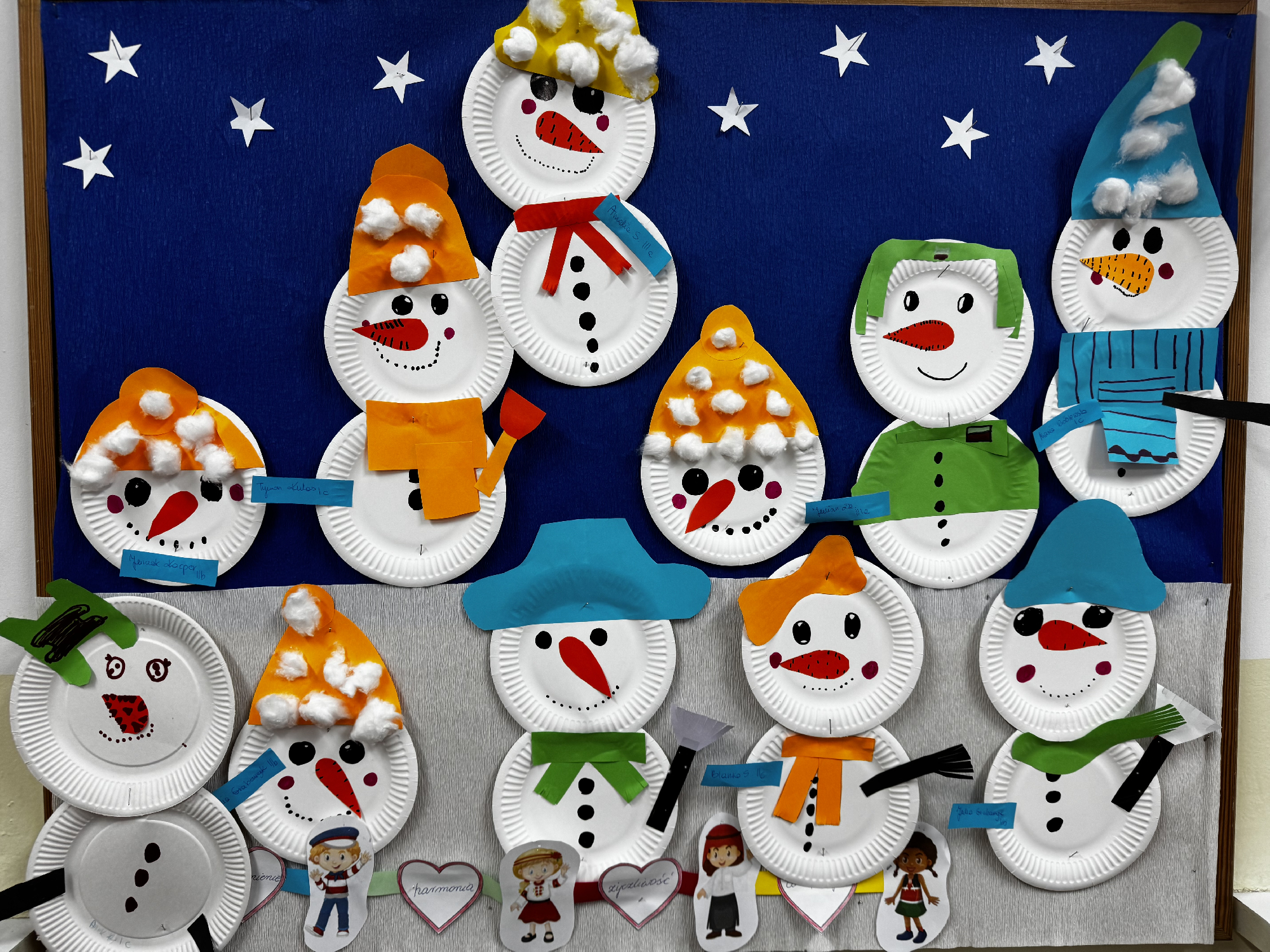 Papierowe bałwanki — lekkie jak płatki śniegu, ozdobione dziecięcą wyobraźnią. Kolorowe czapki i uśmiechy z kredek nadają im ciepło, a cała kompozycja wygląda jak mała zimowa opowieść zatrzymana w kadrze.