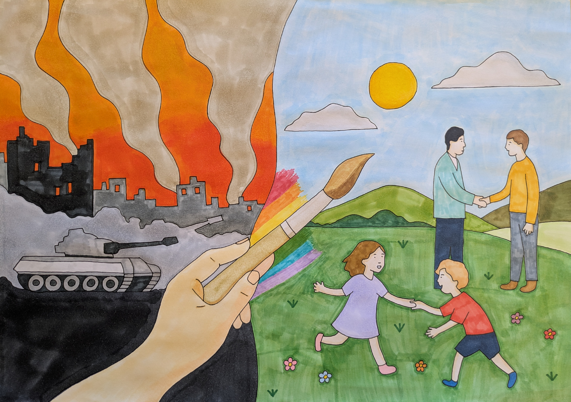 została wyróżniona przedstawiła obraz wojny i świat pokoju, gdzie dorośli godzą się ze sobą, a