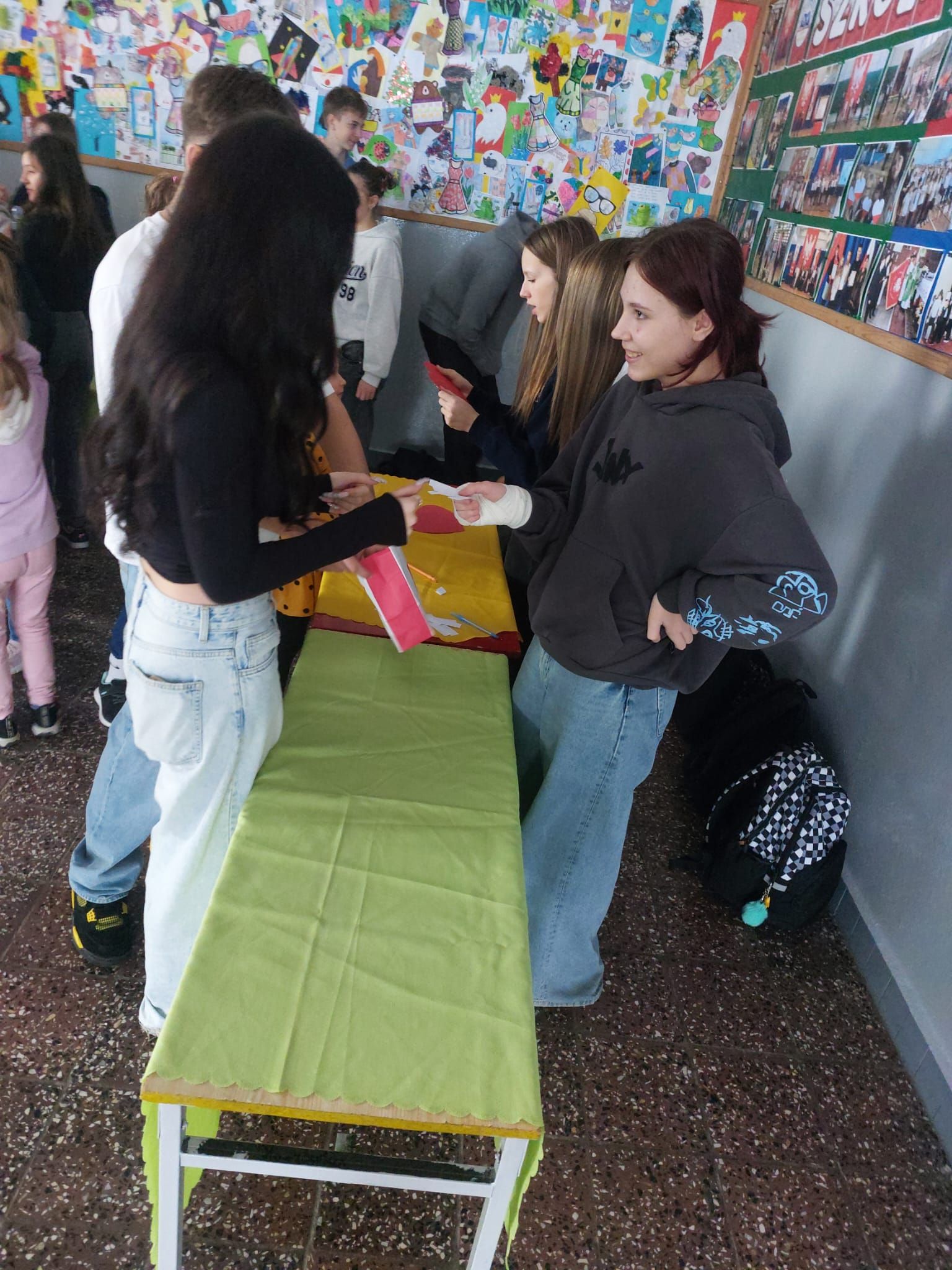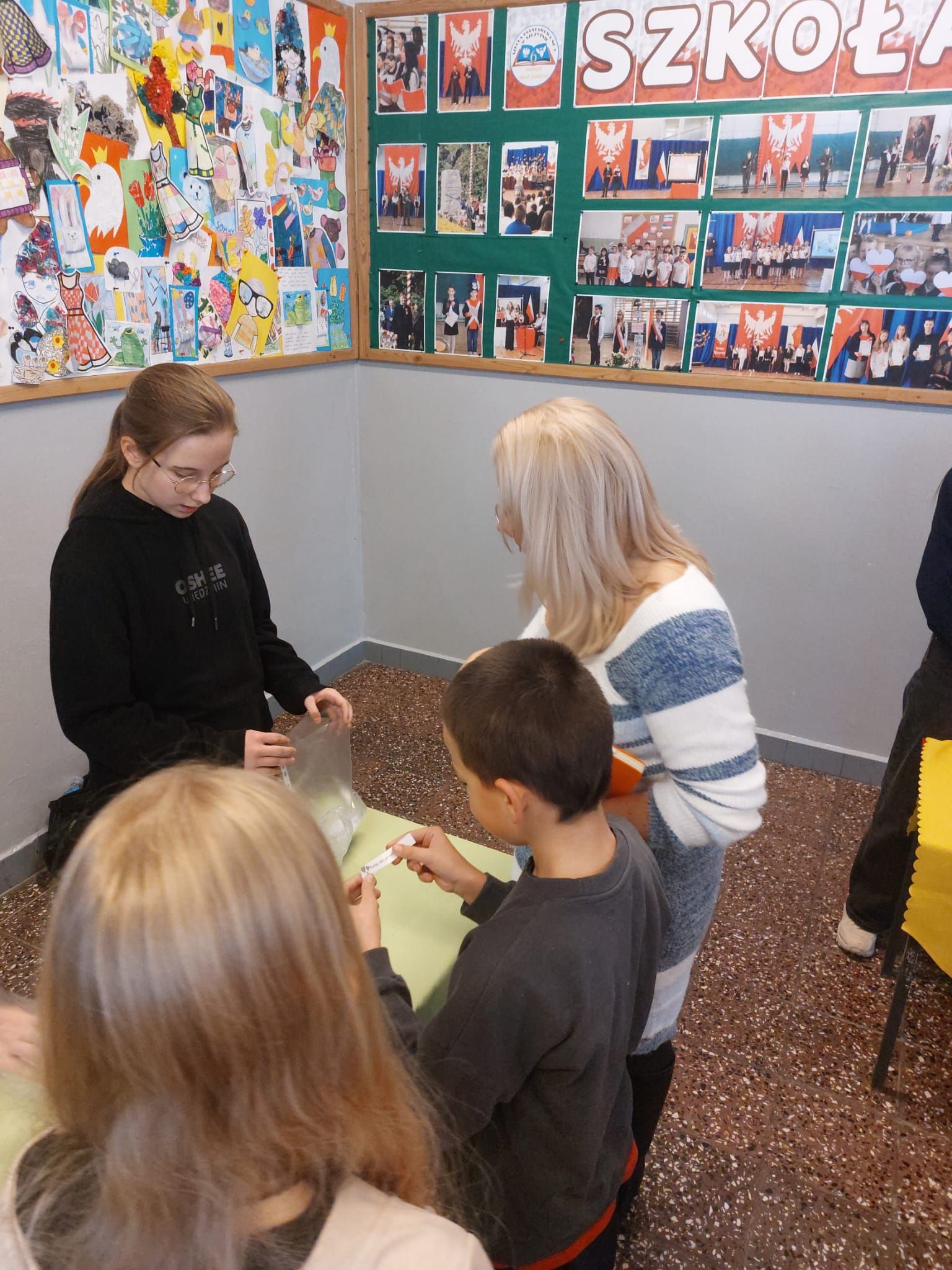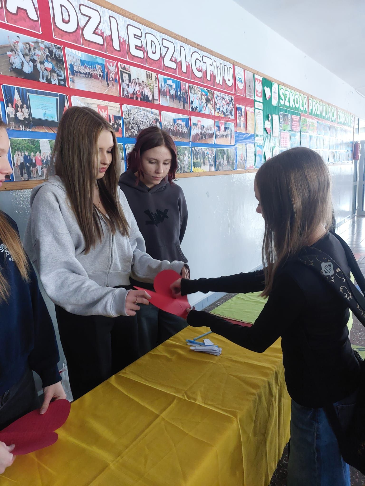 Na szkolnym korytarzu zorganizowano andrzejkowe wróżby, które przyciągnęły wielu uczniów. Przy przygotowanych stanowiskach można było losować karteczki z przepowiedniami, odkrywać przyszłe zawody oraz sprawdzać, co szykuje los.