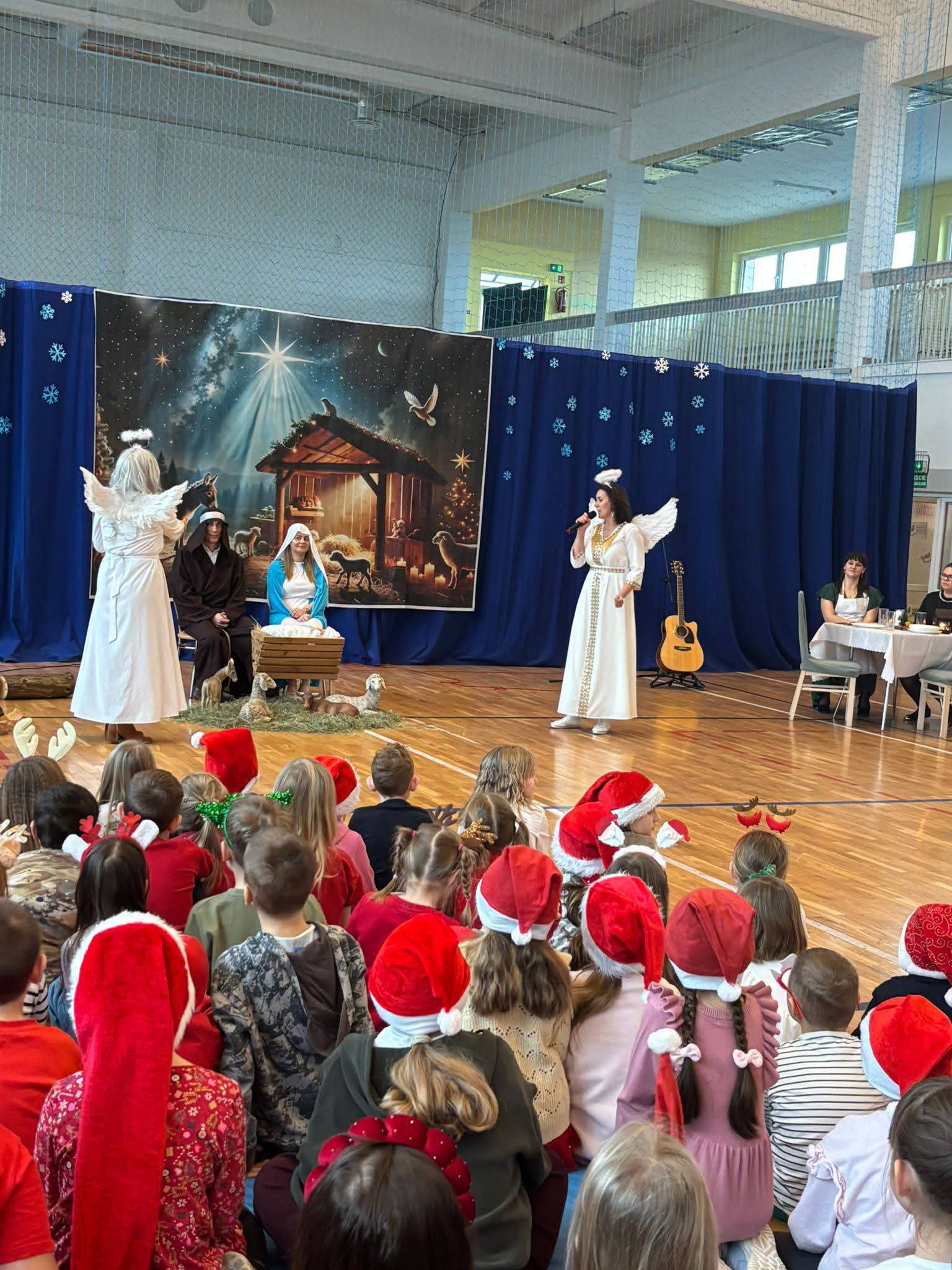 Całość dopełniła piękna oprawa muzyczna – chór oraz śpiewające mamy, a także akompaniament gitarowy, które wspólnie stworzyły niezwykle ciepłą, świąteczną atmosferę i nadały przedstawieniu wyjątkowy charakter.