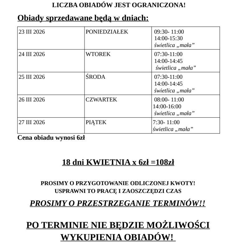 Szanowni Państwo. Informuję, że obiady dla uczniów klas I-VIII można wykupić u kierownika świetlicy.